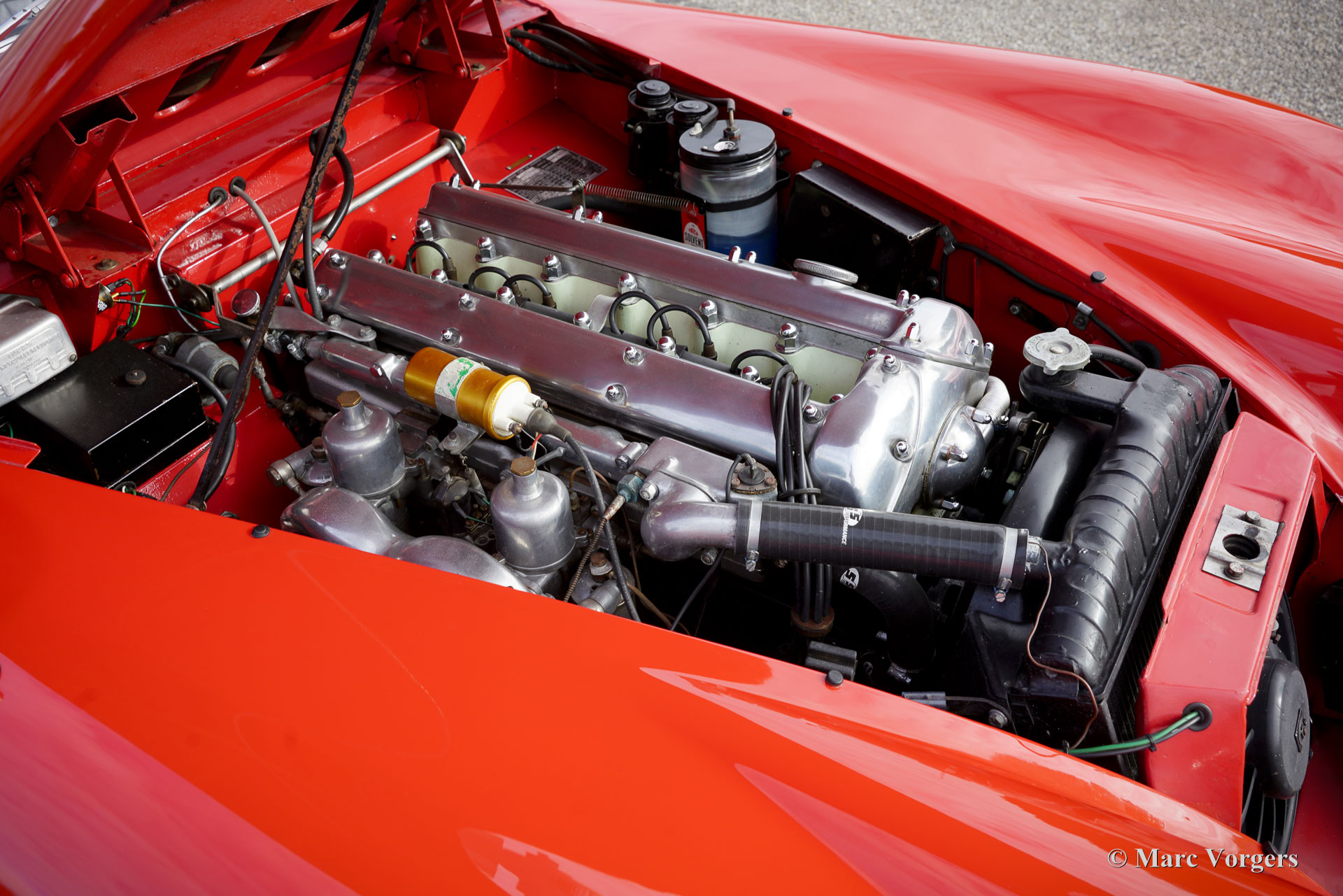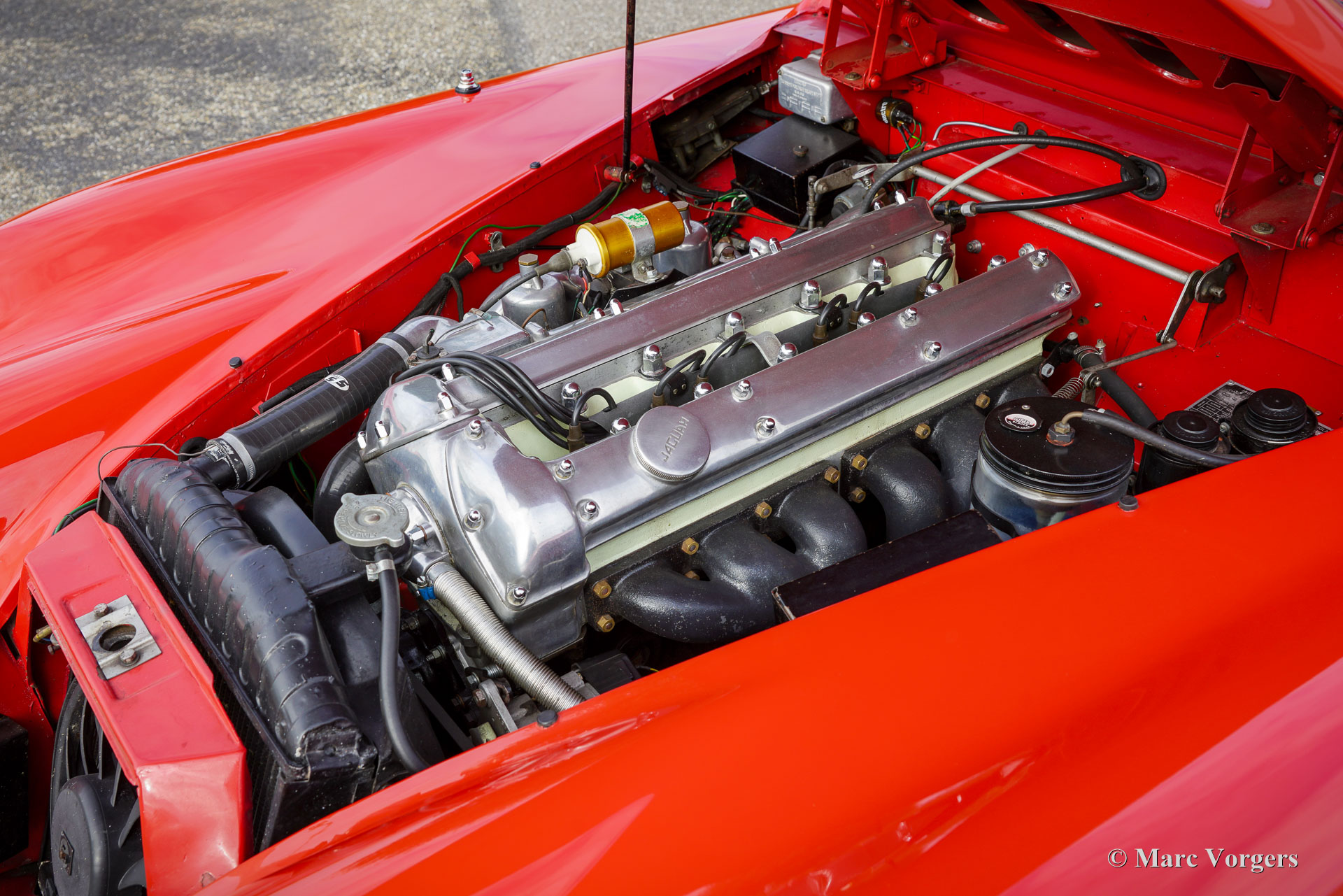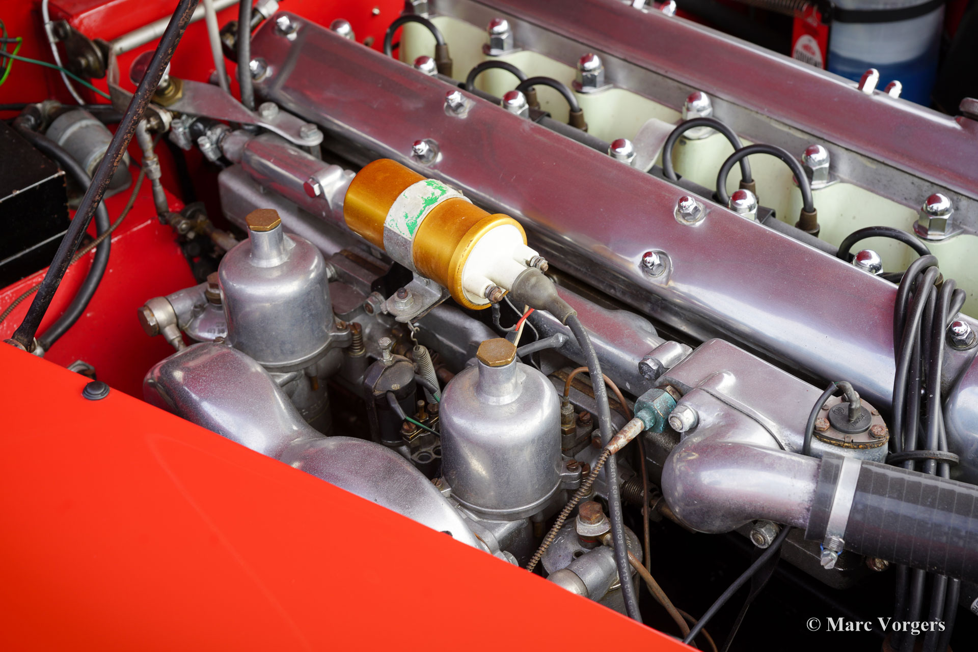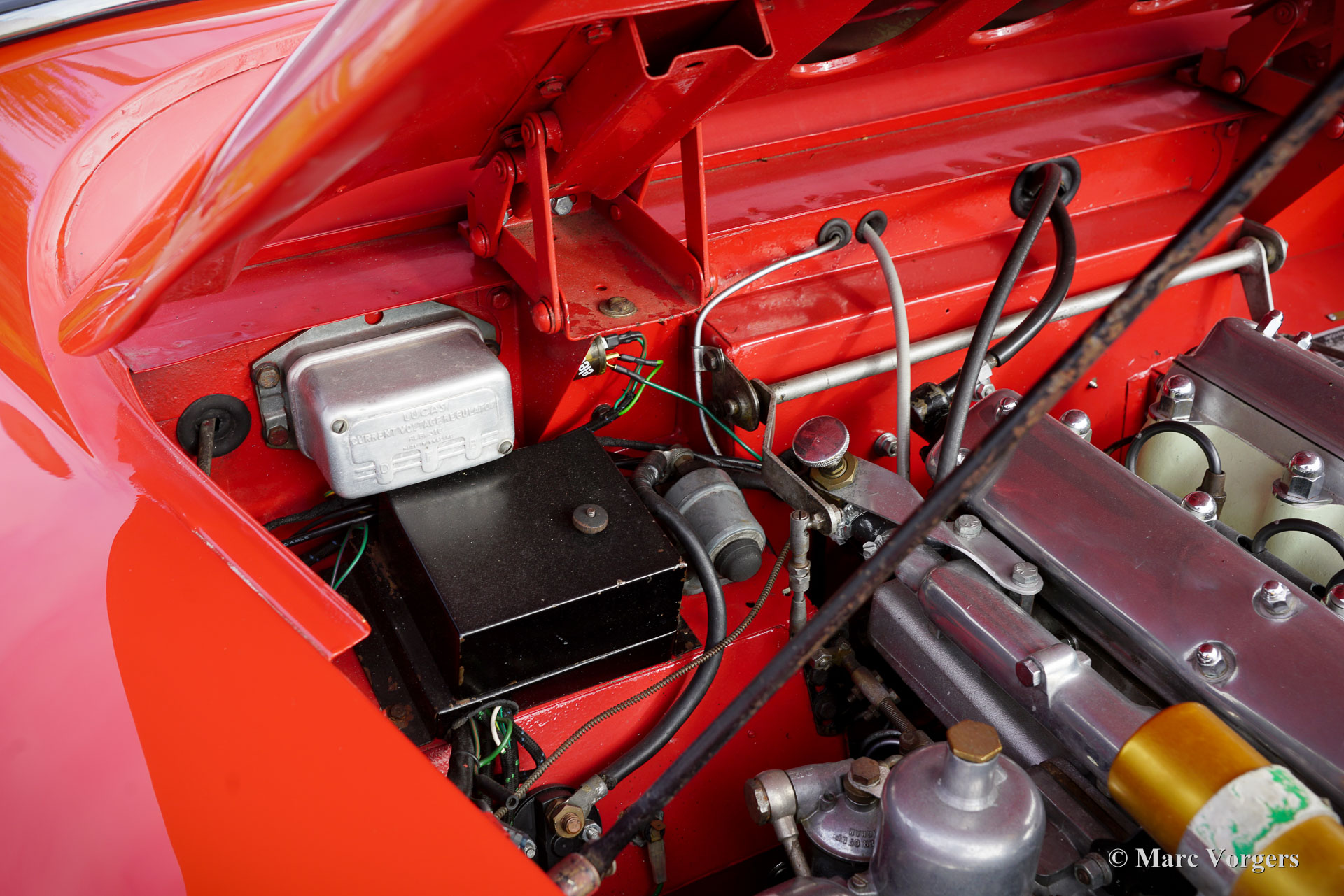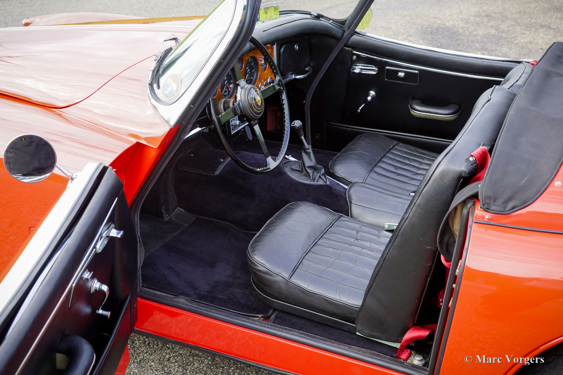 Jaguar XK 150 3,4 Liter OTS (Roadster), Jahr 1959. Farbe rot (Carmen red) kombiniert mit einer schwarzen Lederausstattung mit schwarzem Teppich. Schwarzes Verdeck und Persenning. Dieser prächtige Jaguar XK 150 OTS (Open Two Seater, in den USA auch Roadster genannt) wurde in den Vereinigten Staaten neu verkauft. Das Auto wurde 1986 in die Niederlande importiert und 2001 vom letzten Besitzer gekauft. Die (Wartungs-)Historie ist ab 2009 vollständig dokumentiert. Ein Heritage-Zertifikat ist vorhanden und die Informationen besagen, dass dies ein Jaguar mit „Matching Numbers“ ist! Das Auto ist in einem sehr guten Zustand und alles ist auf dem neuesten Stand. Die Karosserie zeigt eine perfekte Passung der Paneele, eine schöne Lackierung und wunderbare Chromteile. Der Sechszylinder-XK-Motor wurde 2014 von einem Spezialisten in den Niederlanden Komplett überholt. 2016 wurde eine elektrische Servolenkung von EZ eingebaut. Die 215 PS werden über ein Viergang-Schaltgetriebe mit Overdrive auf die Hinterräder übertragen. Dieser XK 150 Roadster fährt perfekt, dies ist eines der allerbesten Exemplare, die wir je gefahren sind! Das Auto zeigt alle Originaldetails und verfügt über wünschenswerte Extras wie das mittlere Armaturenbrett in Nuss Holz, 16-Zoll-Speichenräder mit Vredestein Sprint Classic-Reifen, ein Paar Lucas SFT576-Nebel-/Kurvenscheinwerfer an der Vorderseite, Servobremsen, elektronische Zündung, einen elektrischen Kühlerlüfter, rote Sicherheitsgurte und ein „Retro“-Radio mit Navigationssystem. Dies ist ein sehr begehrter Jaguar XK 150 OTS (Roadster) in einem wunderbaren Zustand, ein fantastisches klassisches Fahrerauto, das einem stolzen neuen Besitzer jede Menge Fahrspaß bringen wird. Der Jaguar XK 150 3,4 Liter OTS ist ein seltenes Auto, es wurden nur 1339 Exemplare gebaut.