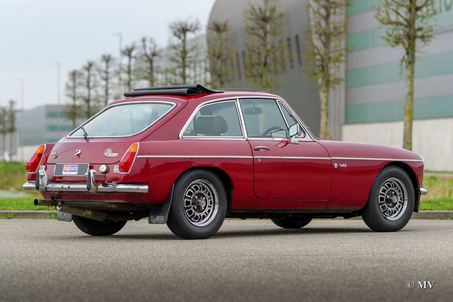 The MG B was the first MG (Morris Garage) built of unitary construction bodywork. The MG B GT V8 was built between 1973 and 1976. In 1970, Ken Costello, a garage owner, installed a Rover 3500 V8 engine in an MG B. MG took over the idea, though engine capacity of the Rover V8 in the MG did not produce 180 hp. at 5500 rpm. but 140 hp. at 5000 rpm. Influenced by the American rules on safety, later models were equipped with synthetic rubber bumpers. Many of the later, built from 1974 until 1976, "rubber-bumper" models are now converted into "chrome-bumper" models. The car shown in these pictures is a original chrome bumper car fitted with the original MG B GT V8 rims.