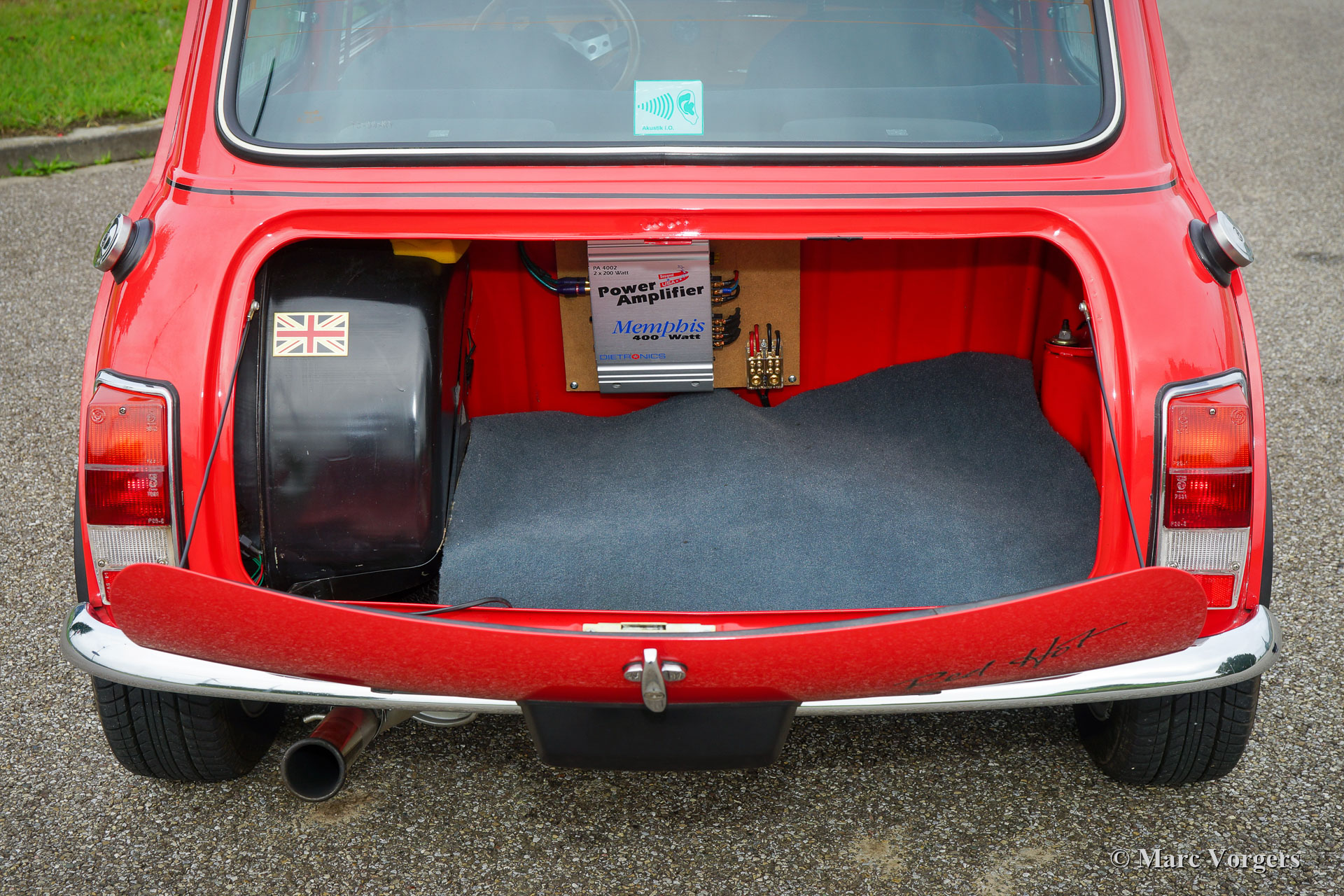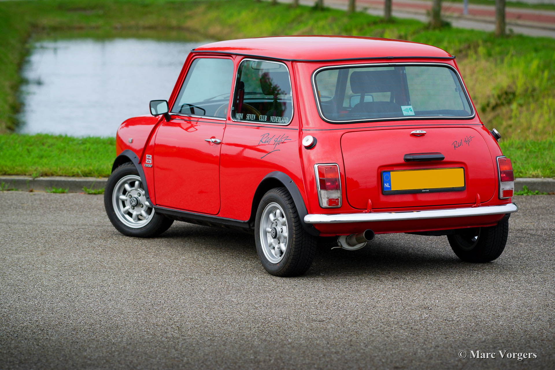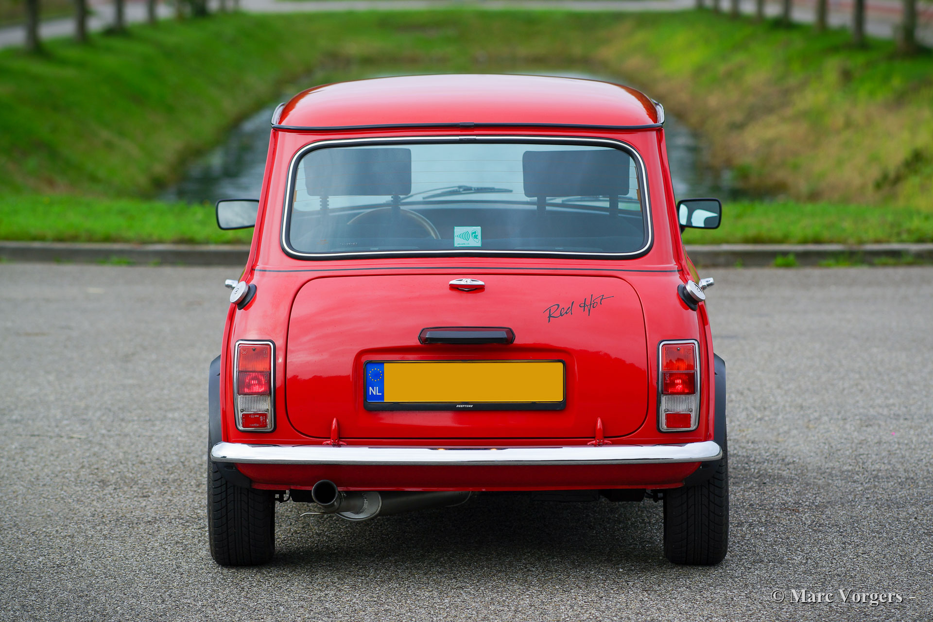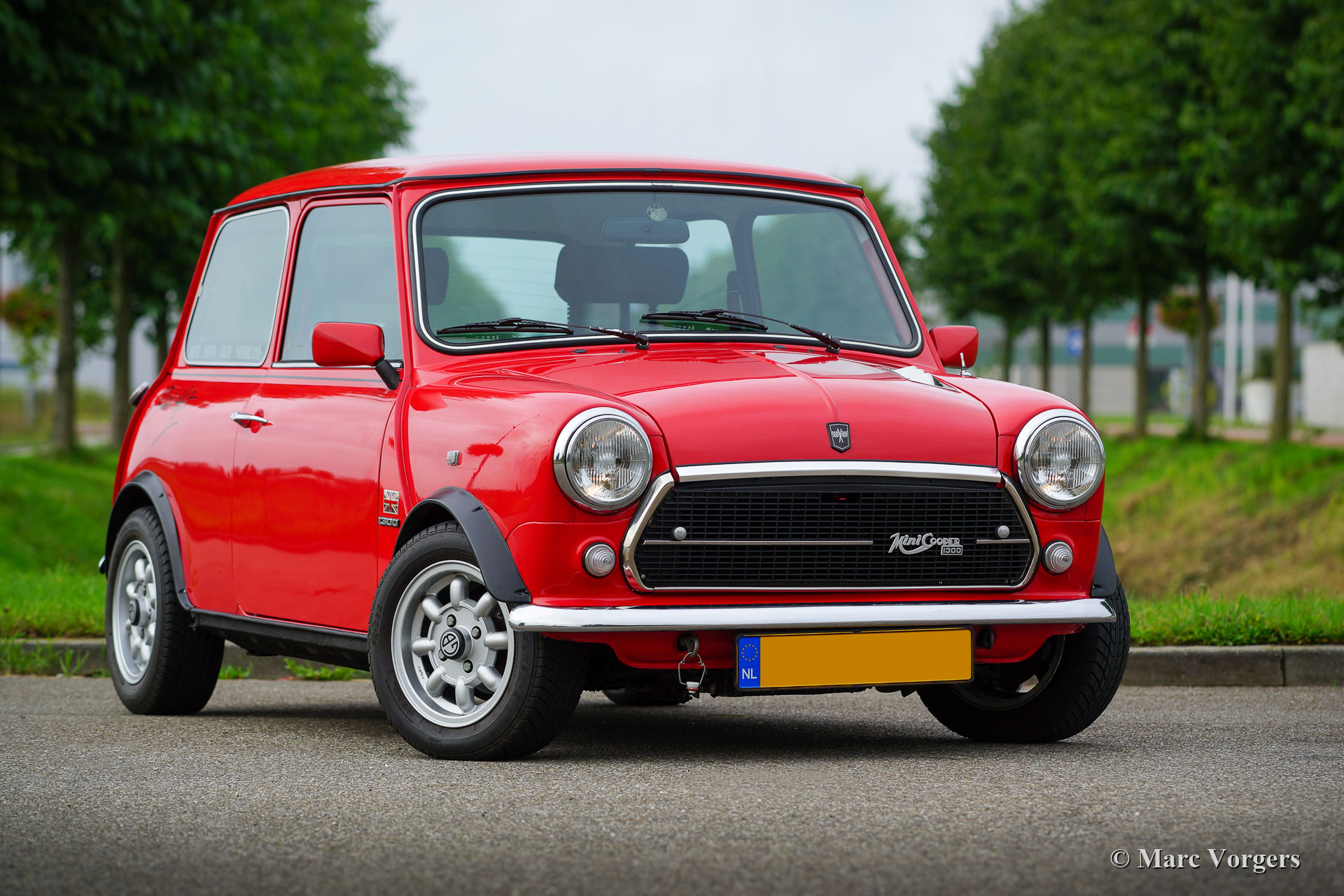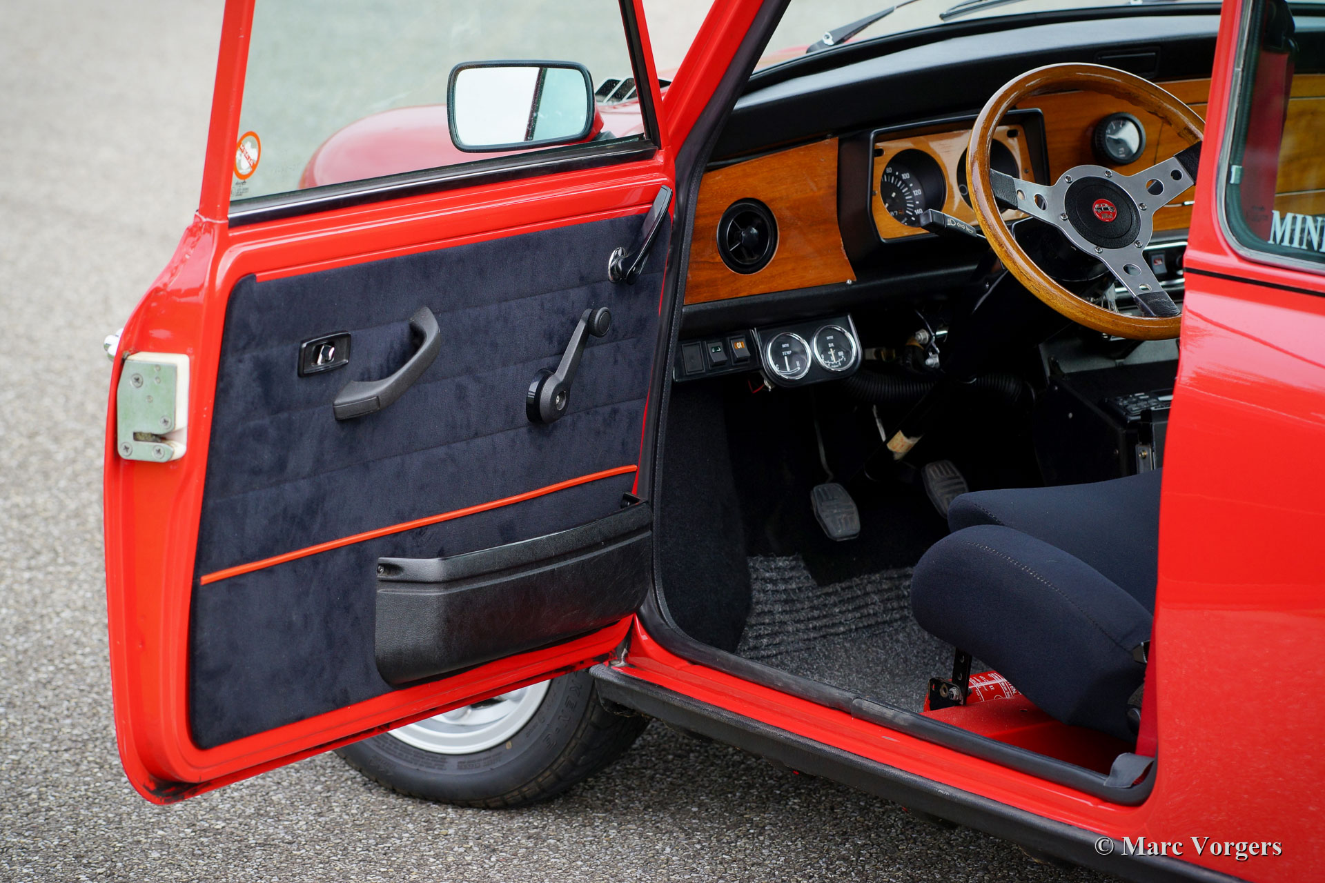 Mini ‚Cooper 1300‘ classic, Jahr 1988. Farbe rot kombiniert mit einem schwarzen Stoff Interieur. Dieser fantastische Classic Mini wurde neu als Mini Red 1000 verkauft. Dieser schöne Mini wurde mit einem 1275-cm³-Cooper-Motor aus einem Innocenti Mini Cooper aufgerüstet. Der Kühlergrill mit dem Mini Cooper 1300-Emblem stammt ebenfalls aus demselben Spenderauto. Der Motor verfügt über zwei S.U. Vergaser und eine ‚schnelle‘ 286er-Nockenwelle. Die Geschichte dieses Mini Cooper und der Umbau sind sehr gut dokumentiert. Das Auto ist innen und außen in einem ausgezeichneten Zustand und das Auto fährt perfekt! Der Mini ist sehr sportlich, aufregend, bremst und schaltet hervorragend und… der Soundtrack des Motors ist fantastisch! Dieser prächtige Mini Cooper verfügt über ein luxuriöses Interieur mit speziellen Corbeau-Schalensitzen, einem Armaturenbrett aus Holz, einem Sportlenkrad mit Holzkranz, einem Motorumdrehungszähler, einem leistungsstarken HiFi-Soundsystem und wunderschönen 12-Zoll-GB-Leichtmetallrädern. Dies ist ein fantastisches Beispiel!