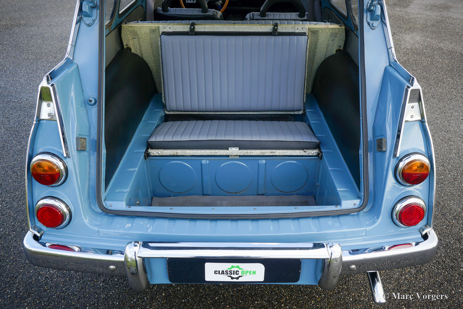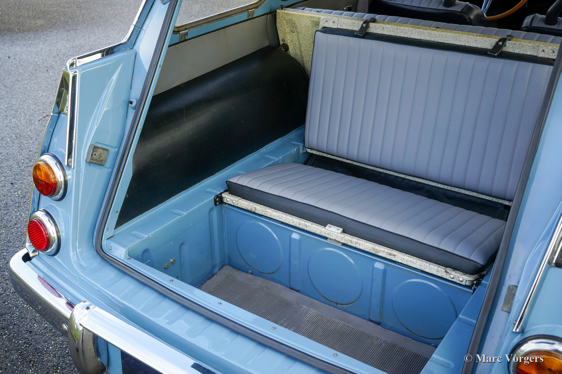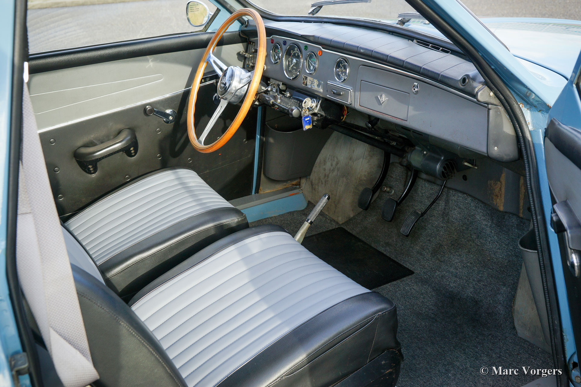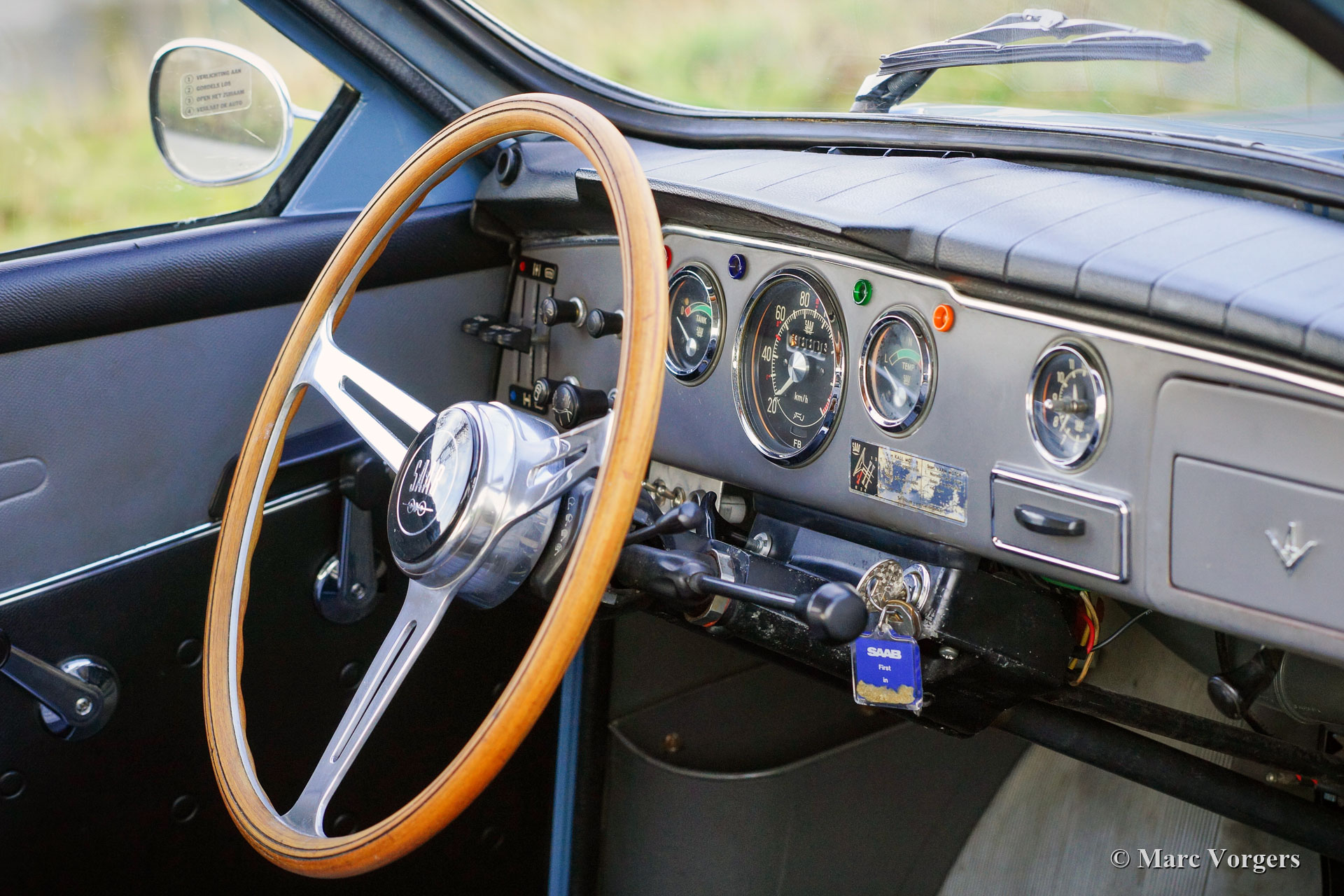 Saab 95 V4 „Long Nose“, Jahr 1968. Farbe Blau kombiniert mit einer zweifarbigen grau/schwarzen Vinyl-Innenausstattung und grauem Teppich. Dieser charakteristische Saab 95 „Kombi“ wurde in Schweden neu verkauft. 1972 wurde das Auto von einem Saab-Enthusiasten in die Niederlande importiert. Dieses prächtige Saab befindet sich in einem sehr guten bis hervorragenden Originalzustand; Sie können sehen und fühlen, dass das Auto vom ersten Tag an von fürsorglichen Enthusiasten geschätzt wurde. Das Saab hat einen 1500 cc V4-Motor, der wunderbar läuft und klingt. Das 4-Gang-Getriebe verfügt über einen Schalthebel am Lenkrad das Komfortable und präzise arbeitet. Das Auto ist ausgestattet mit dem wunderschönen originalen Lenkrad mit Holzkranz und einem Paar zusätzlicher Hella-Scheinwerfer (Nebelscheinwerfer mit breitem Lichtstrahl und einem Fernscheinwerfer). Spezielles Merkmal des Saab 95 ist die zusätzliche Sitzbank im Kofferraum. Diese Bank versenkt sich bei Nichtgebrauch im Boden, ein sehr cleveres Detail! Dieser Saab 95 ist eine fantastische „Zeitkapsel“ in einem sehr guten bis hervorragenden Originalzustand. Sie werden kaum ein anderes Exemplar in diesem einzigartigen Zustand finden!