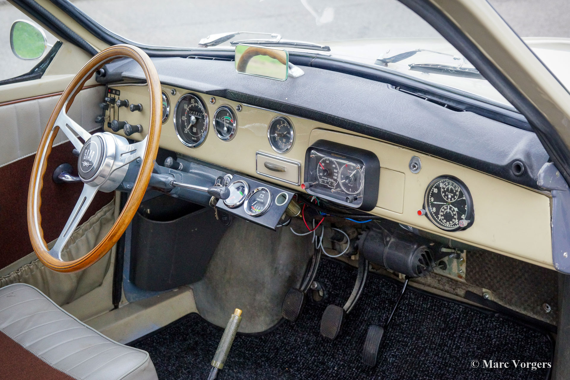 Saab 96 „Zweitakt“, Jahr 1965. Farbe Beige kombiniert mit einem zweifarbigen braun/grauen Stoff mit Vinyl-Innenausstattung. Dieser wunderschöne Saab 96 „Long Nose“ ist in einem sehr guten bis hervorragenden restaurierten Zustand und das Auto zeigt alle originalen Details. Ein Fotobericht der Restaurierung und der Überholung ist vorhanden. Die Zweitakt-Saab-Modelle sind ein Genuss zu fahren, und der Auspuffsound ist einfach fantastisch! Der Saab 96 zeigt die wunderbaren aerodynamischen Linien, für die Saab bekannt sind. Das Armaturenbrett ist gut gefüllt mit schönen Instrumenten und Messgeräten, sogar ein Halda Speedpilot ist vorhanden, ebenso wie eine Flugzeuguhr. Mit dem Halda Speedpilot und den zusätzlichen Hella Spot-Leuchten an der Front präsentiert sich dieser Saab 96 sportlich. Das Auto ist auch mit einem schönen Saab-Lenkrad mit einem Holzkranz ausgestattet, der an die „Monte Carlo“-Version dieses Modells erinnert. Der 3-Zylinder-Zweitaktmotor läuft wunderbar und das 4-Gang-Schaltgetriebe mit Lenkrad-Säulenschaltung funktioniert perfekt. Das elektrische System wurde mit einem Wechselstromdynamo aufgewertet. Dies ist ein begehrtes Saab 96 „Zweitakt“-Modell in einem hervorragenden Zustand!