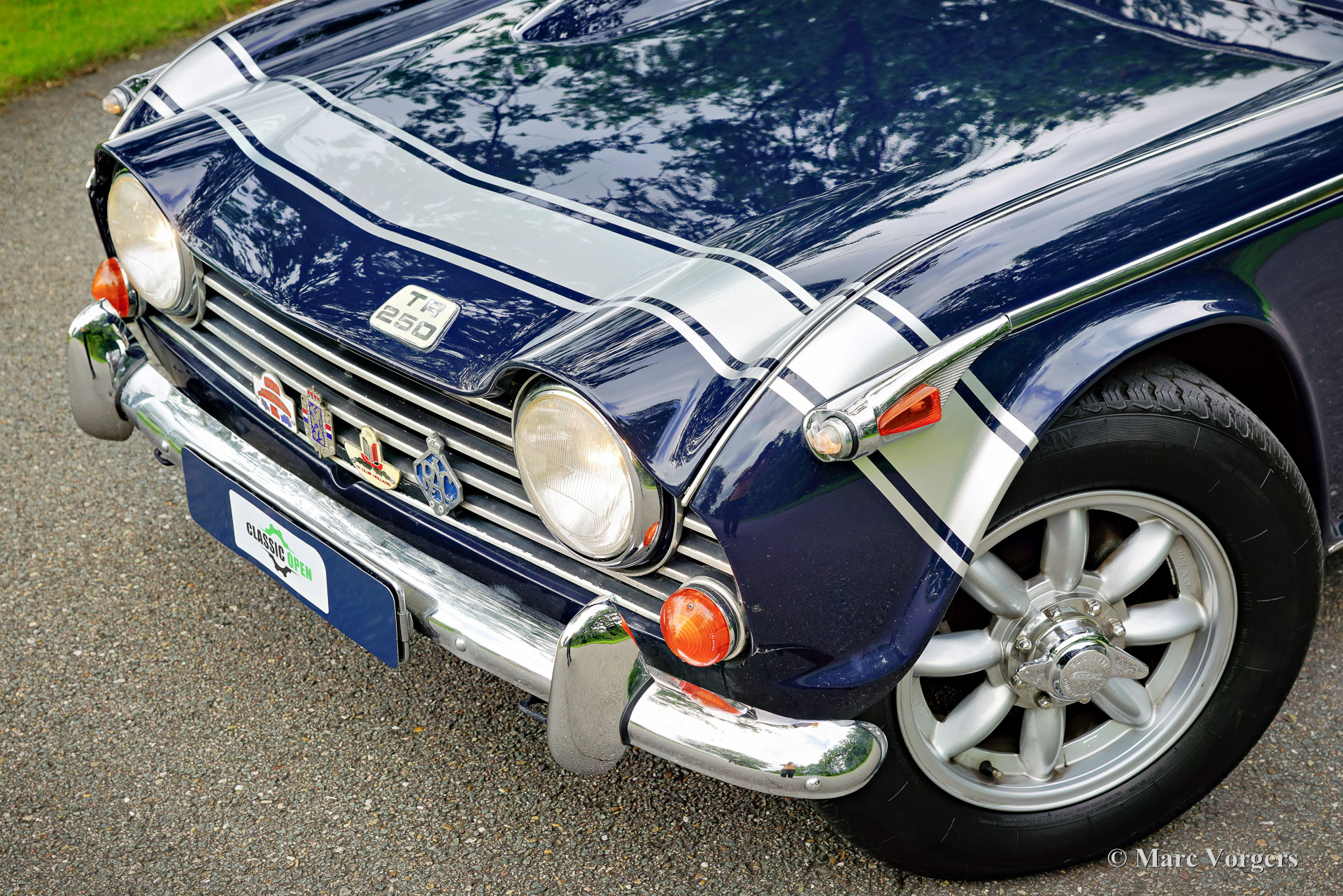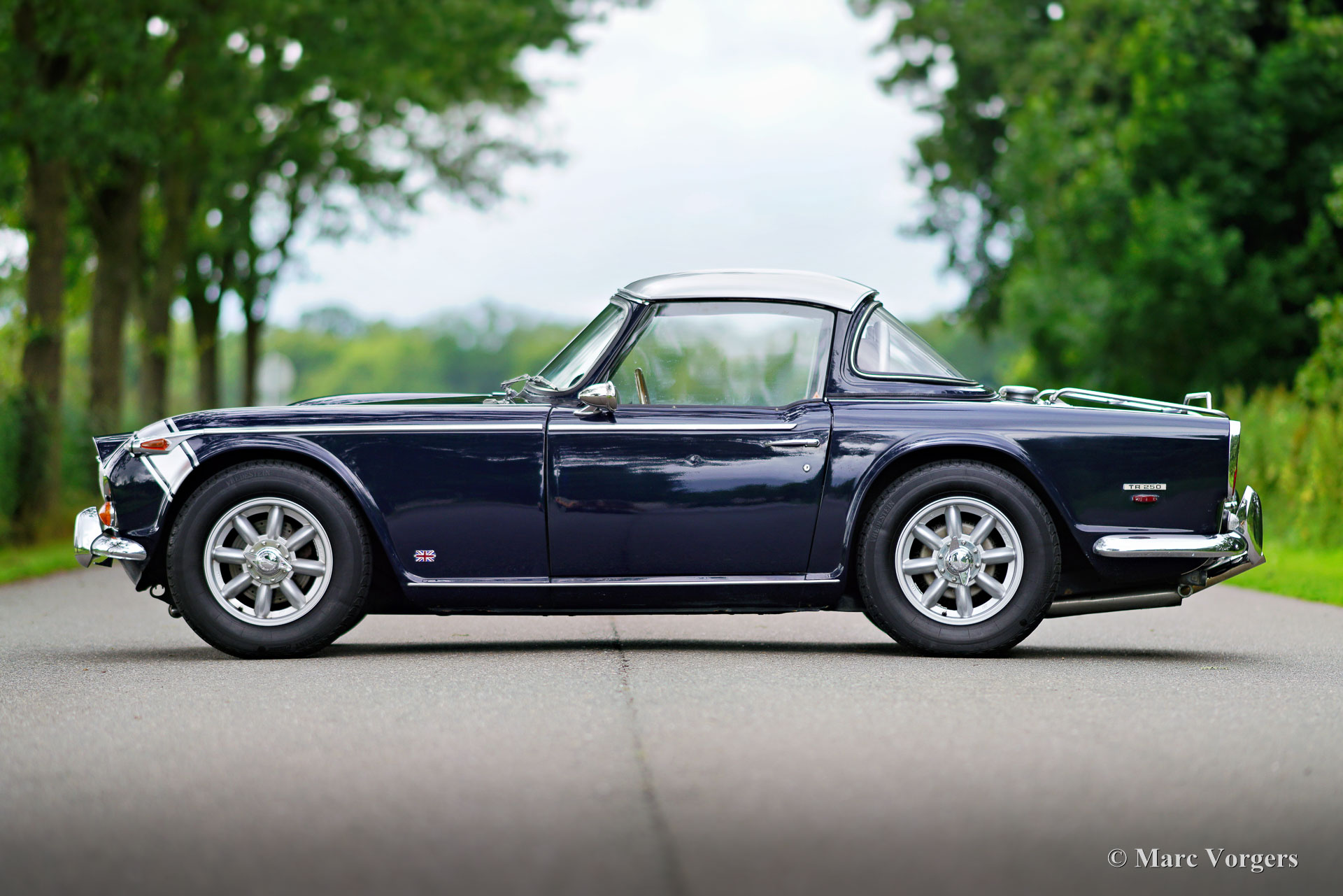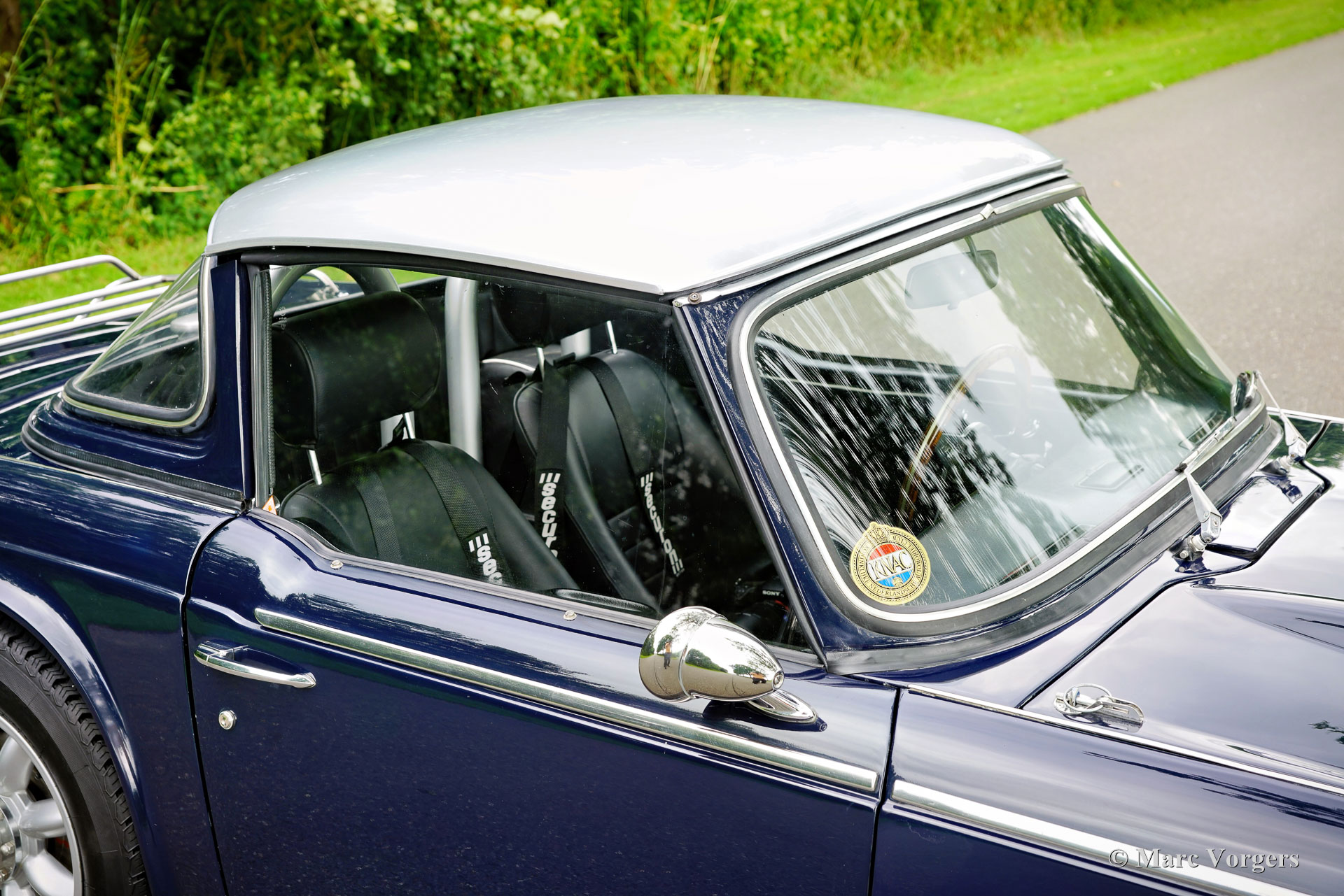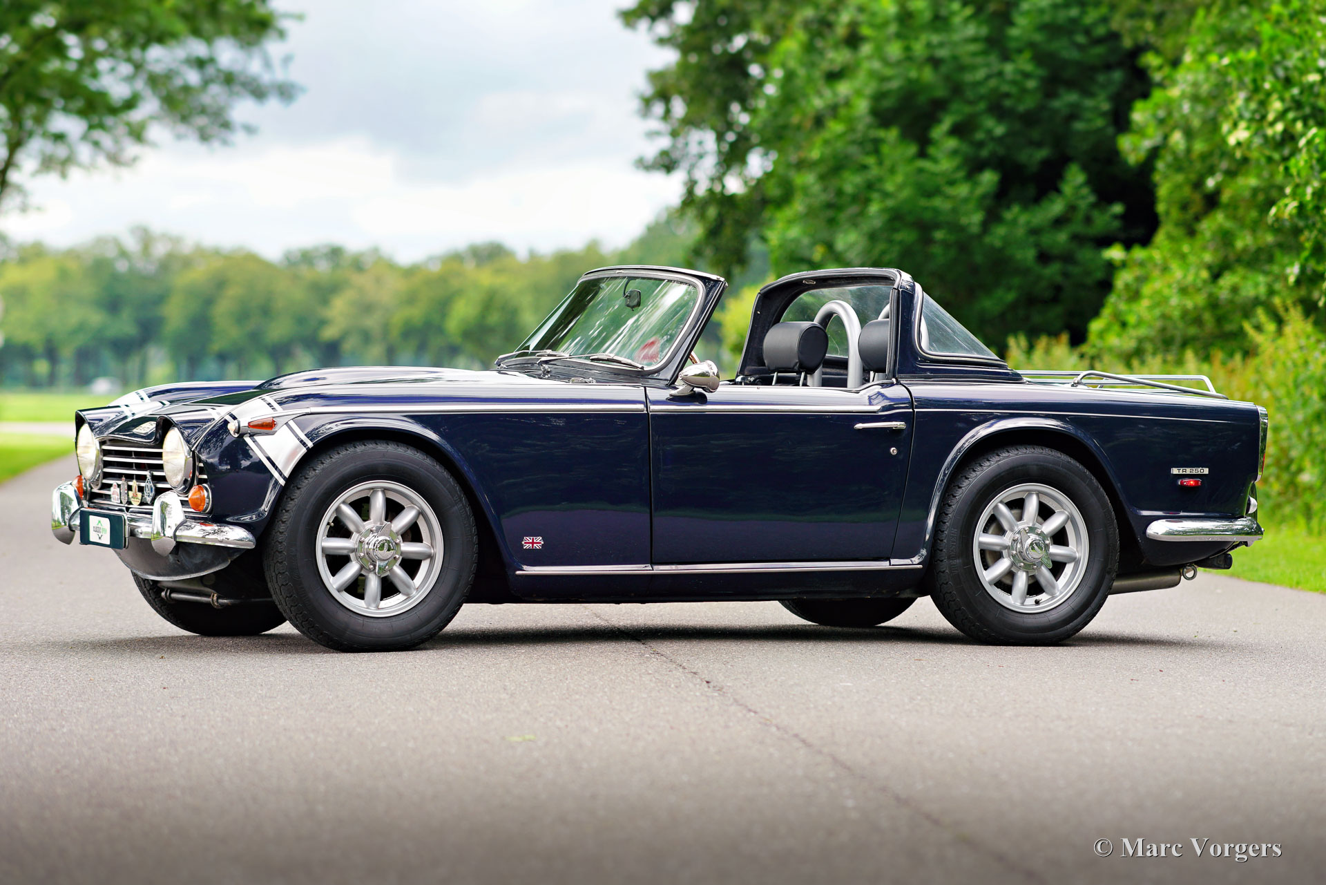 Triumph TR 250, Jahr 1968. Farbe Dunkelblau kombiniert mit einem schwarzen Interieur. Das Auto verfügt über ein begehrtes originales „Surrey Top“ mit einem Heckscheibenrahmen in Wagenfarbe, einem silbermetallic farbiges Dachpaneel und einem schwarzen Vinyl-Faltdach. Das „Surrey Top“ ist eine sehr begehrte Option für Triumph TR 4, TR 5 und TR 250 und war die Inspiration für das Porsche „Targa“-Dach. Der TR 250 ist die amerikanische Version des europäischen Triumph TR 5. Dieses Auto wurde in den USA neu verkauft und vor Jahrzehnten in die Niederlande importiert. Der letzte Besitzer hat seit 2001 Freude an diesem Triumph. Die (Wartungs-)Historie ist seit 2001 dokumentiert. Dieses großartig aussehende Fahrerauto ist in einem guten Zustand und das Auto fährt und klingt wunderbar. Der Besitzer hat an Touren teilgenommen, das Auto weist hier und da und vor allem im Innenraum Gebrauchsspuren auf. Das Auto verfügt über einige begehrte „Fast Road“-Modifikationen. Der Motor wurde nach europäischen TR 5-Spezifikationen gebaut und mit S.U.-Vergasern, elektronischer Zündung und einem Doppelrohr-Sportauspuff ausgestattet. Der Motor liefert rund 130 DIN-PS. Die Aufhängung wurde verstärkt und mit einem Stabilisator, Teleskopstoßdämpfern und Minilite-Rädern mit zentralen Radmuttern aufgerüstet. Darüber hinaus ist dieser schöne TR 250 mit Overdrive, einem großen Aluminium-Benzintank, Ölkühler, elektrischem Kühlgebläse, Schalensitzen, Überrollbügeln hinter den Sitzen, Securon-4-Punkt-Sicherheitsgurten und einem MotoLita-Sportlenkrad mit Holzkranz ausgestattet. Dieser Triumph TR 250 ist ein großartiges und wunderbares Fahrerauto, ein großartiger Begleiter, um historische (Touring-Rallye-)Events zu genießen!
