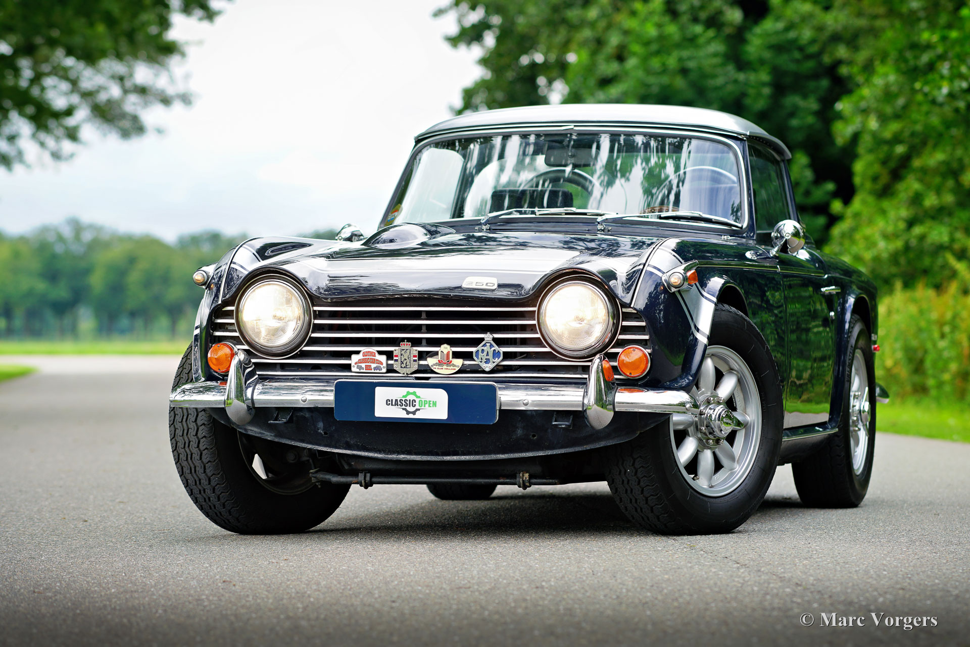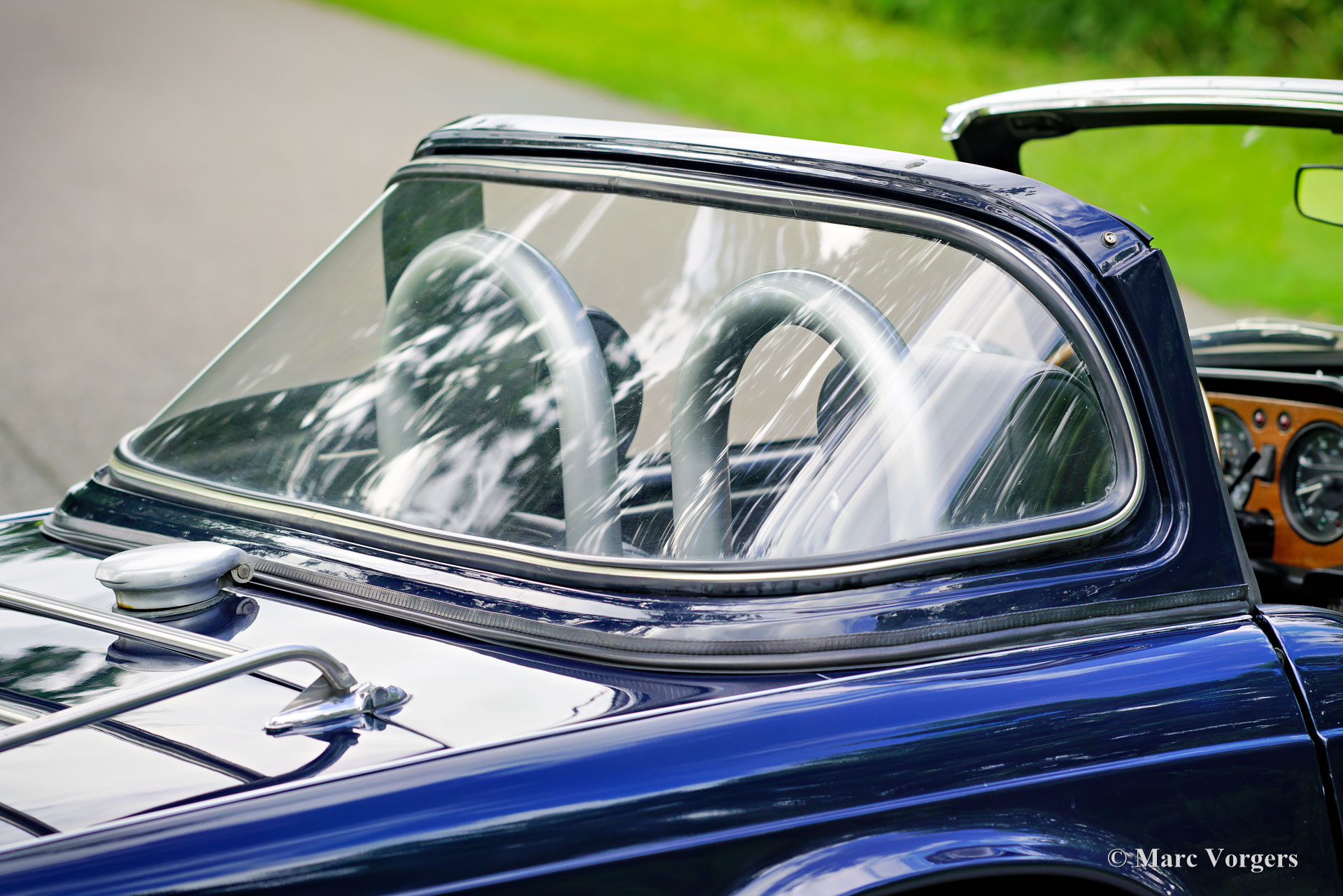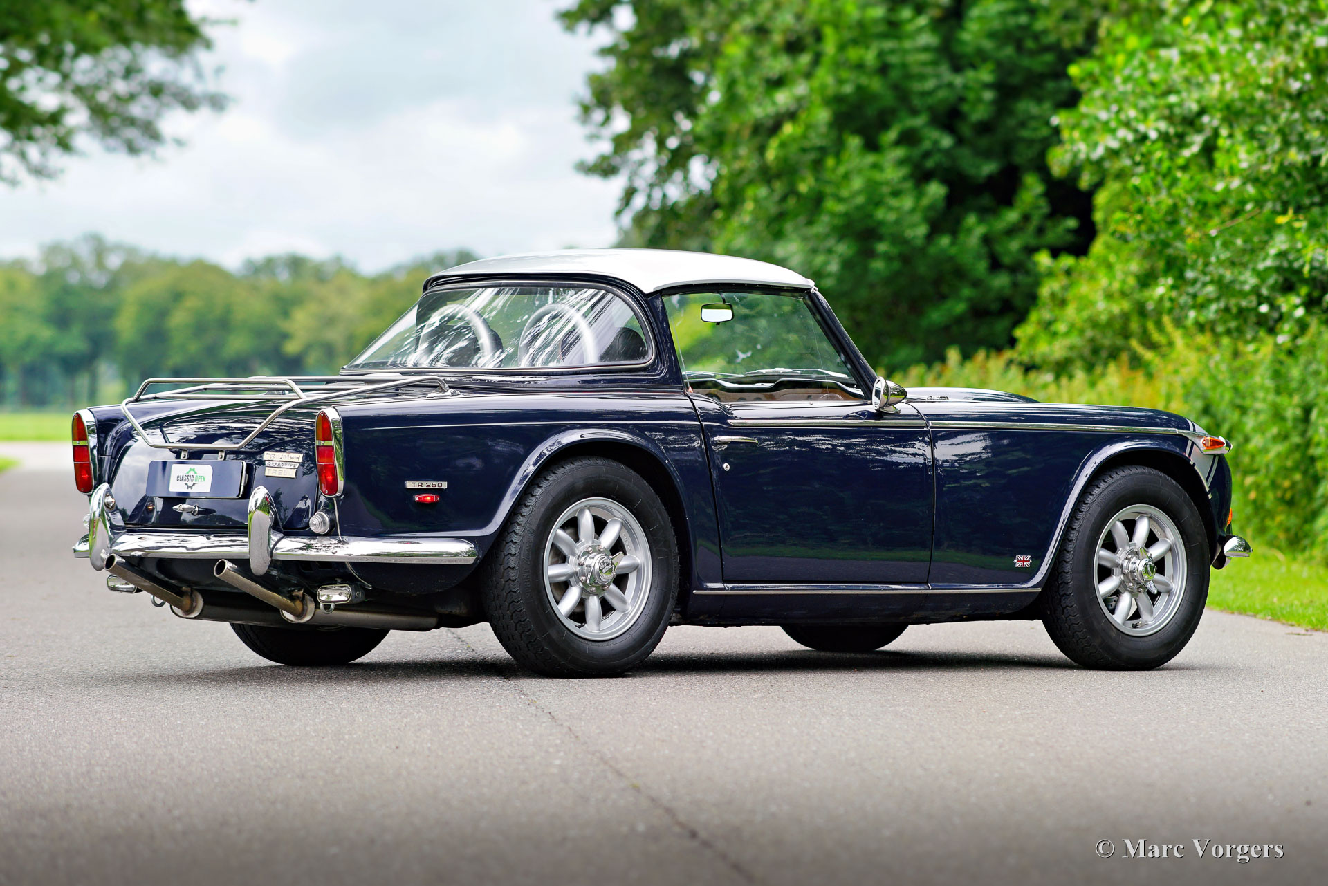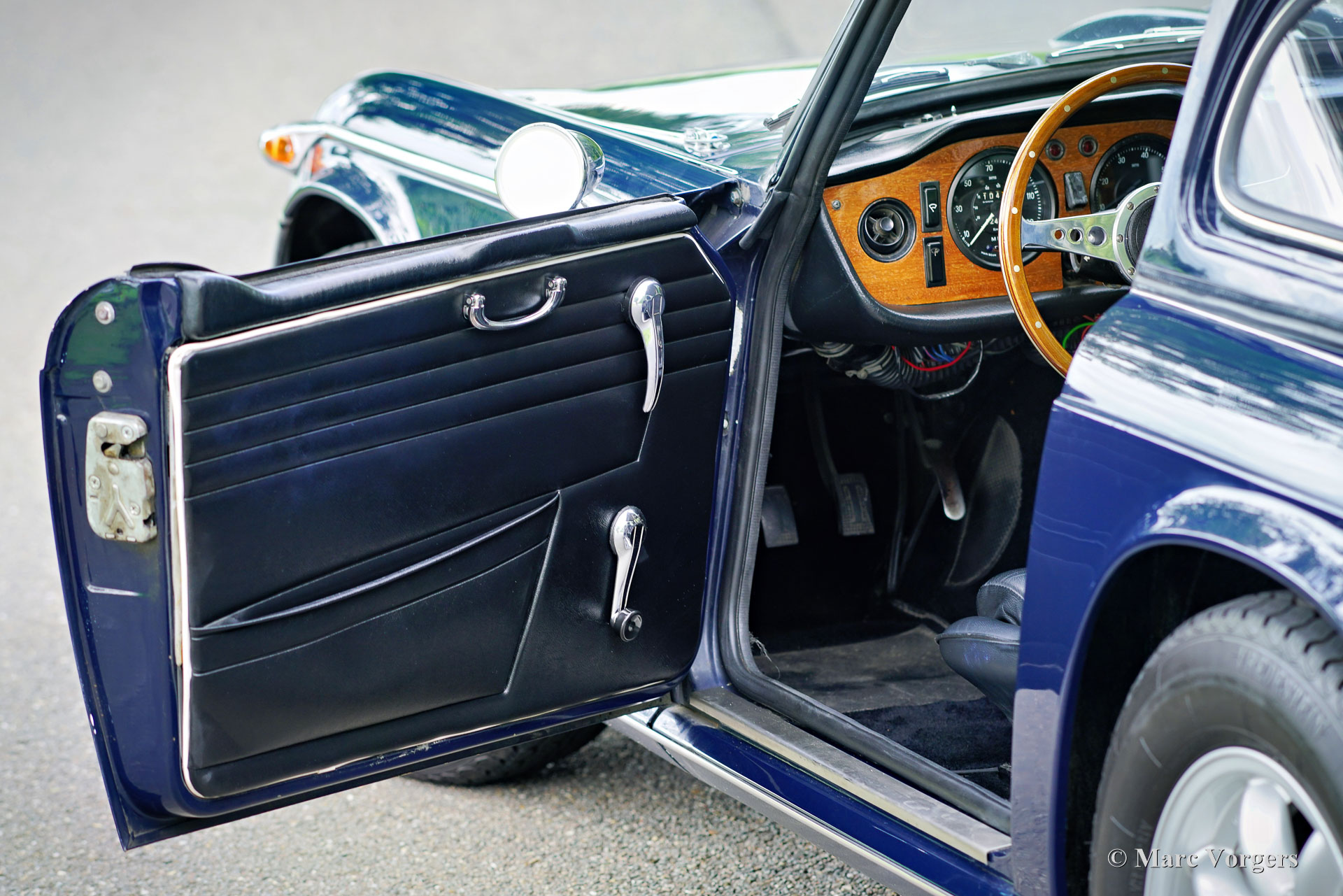 Triumph TR 250, Jahr 1968. Farbe Dunkelblau kombiniert mit einem schwarzen Interieur. Das Auto verfügt über ein begehrtes originales „Surrey Top“ mit einem Heckscheibenrahmen in Wagenfarbe, einem silbermetallic farbiges Dachpaneel und einem schwarzen Vinyl-Faltdach. Das „Surrey Top“ ist eine sehr begehrte Option für Triumph TR 4, TR 5 und TR 250 und war die Inspiration für das Porsche „Targa“-Dach. Der TR 250 ist die amerikanische Version des europäischen Triumph TR 5. Dieses Auto wurde in den USA neu verkauft und vor Jahrzehnten in die Niederlande importiert. Der letzte Besitzer hat seit 2001 Freude an diesem Triumph. Die (Wartungs-)Historie ist seit 2001 dokumentiert. Dieses großartig aussehende Fahrerauto ist in einem guten Zustand und das Auto fährt und klingt wunderbar. Der Besitzer hat an Touren teilgenommen, das Auto weist hier und da und vor allem im Innenraum Gebrauchsspuren auf. Das Auto verfügt über einige begehrte „Fast Road“-Modifikationen. Der Motor wurde nach europäischen TR 5-Spezifikationen gebaut und mit S.U.-Vergasern, elektronischer Zündung und einem Doppelrohr-Sportauspuff ausgestattet. Der Motor liefert rund 130 DIN-PS. Die Aufhängung wurde verstärkt und mit einem Stabilisator, Teleskopstoßdämpfern und Minilite-Rädern mit zentralen Radmuttern aufgerüstet. Darüber hinaus ist dieser schöne TR 250 mit Overdrive, einem großen Aluminium-Benzintank, Ölkühler, elektrischem Kühlgebläse, Schalensitzen, Überrollbügeln hinter den Sitzen, Securon-4-Punkt-Sicherheitsgurten und einem MotoLita-Sportlenkrad mit Holzkranz ausgestattet. Dieser Triumph TR 250 ist ein großartiges und wunderbares Fahrerauto, ein großartiger Begleiter, um historische (Touring-Rallye-)Events zu genießen!