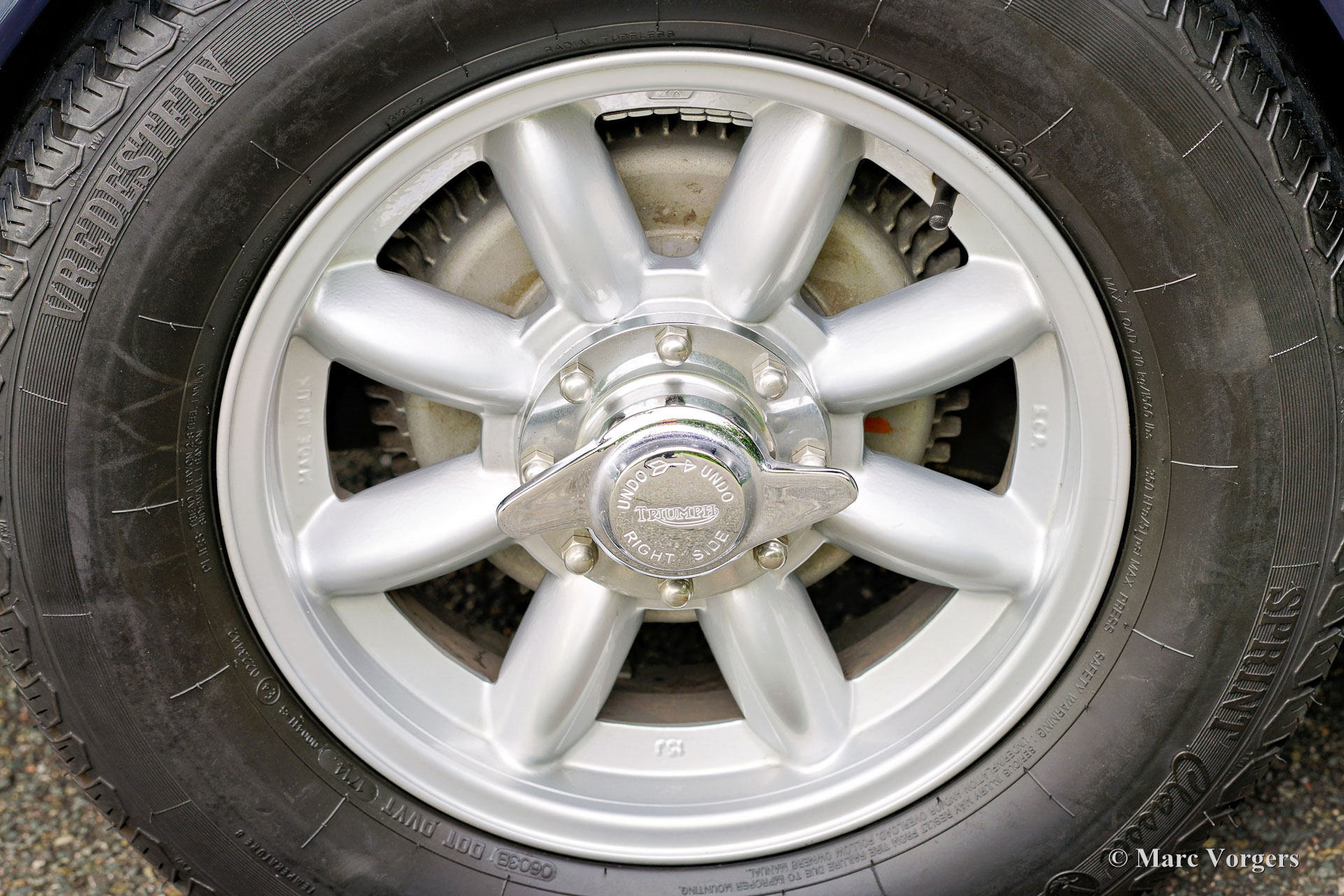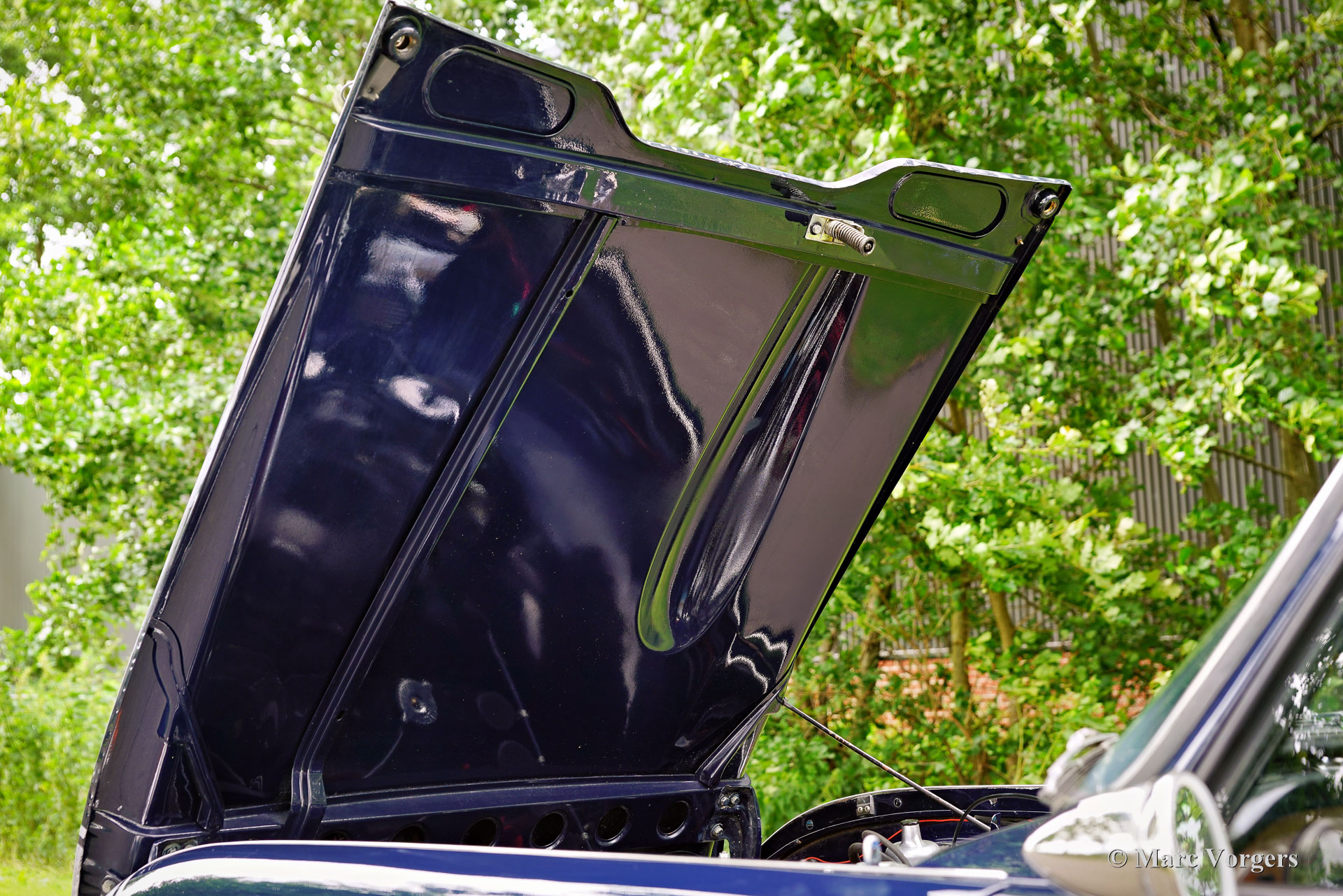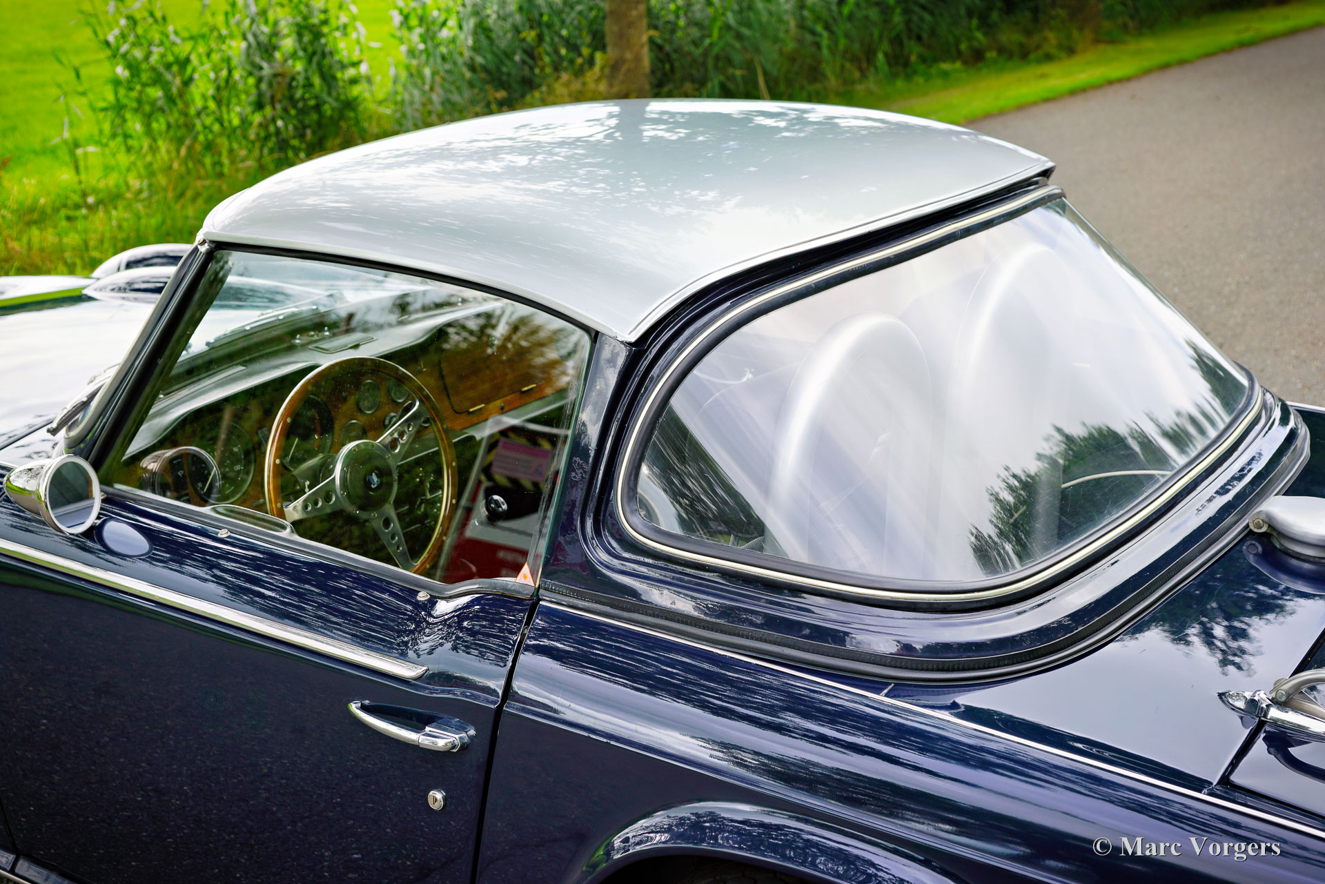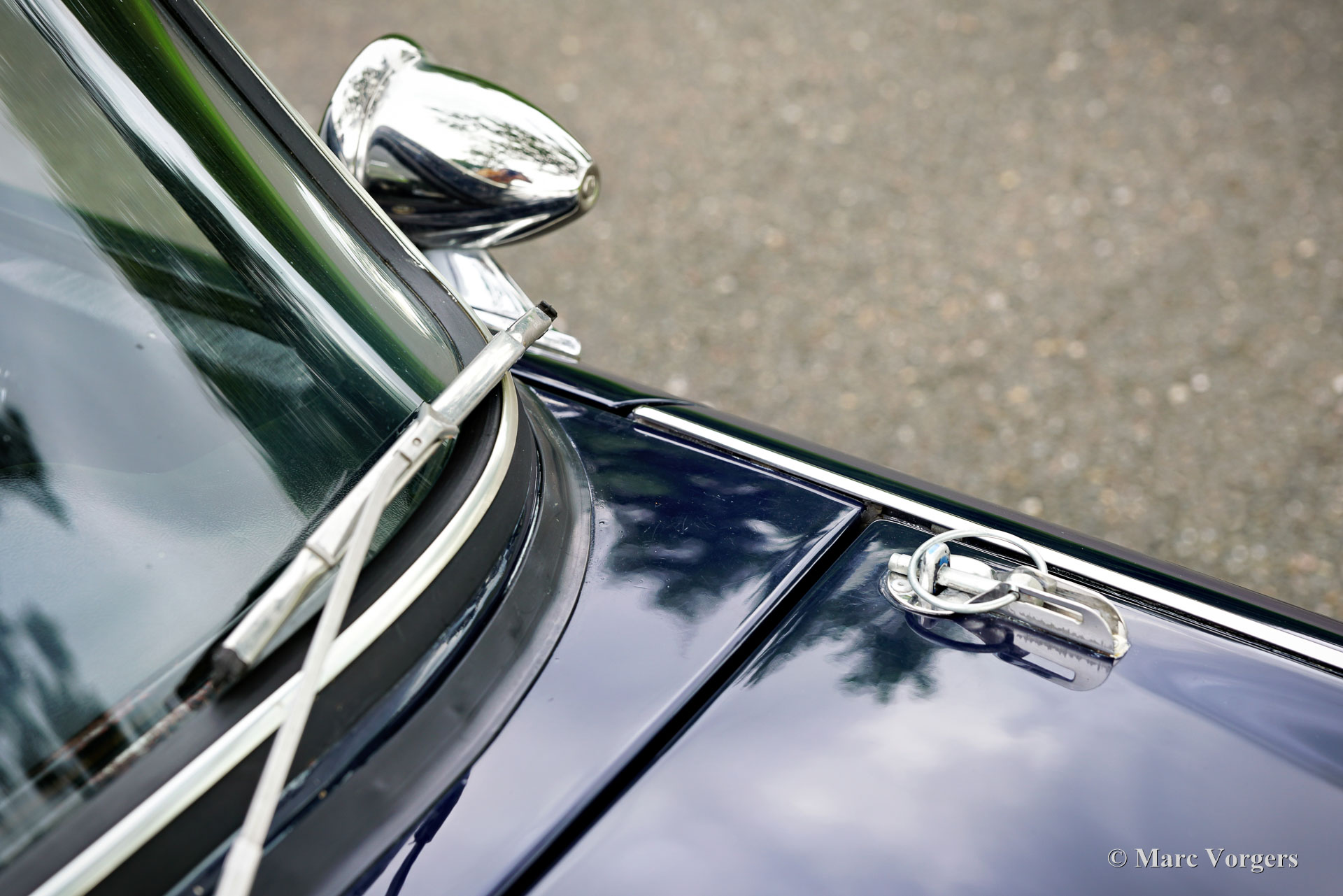Triumph TR 250, Jahr 1968. Farbe Dunkelblau kombiniert mit einem schwarzen Interieur. Das Auto verfügt über ein begehrtes originales „Surrey Top“ mit einem Heckscheibenrahmen in Wagenfarbe, einem silbermetallic farbiges Dachpaneel und einem schwarzen Vinyl-Faltdach. Das „Surrey Top“ ist eine sehr begehrte Option für Triumph TR 4, TR 5 und TR 250 und war die Inspiration für das Porsche „Targa“-Dach. Der TR 250 ist die amerikanische Version des europäischen Triumph TR 5. Dieses Auto wurde in den USA neu verkauft und vor Jahrzehnten in die Niederlande importiert. Der letzte Besitzer hat seit 2001 Freude an diesem Triumph. Die (Wartungs-)Historie ist seit 2001 dokumentiert. Dieses großartig aussehende Fahrerauto ist in einem guten Zustand und das Auto fährt und klingt wunderbar. Der Besitzer hat an Touren teilgenommen, das Auto weist hier und da und vor allem im Innenraum Gebrauchsspuren auf. Das Auto verfügt über einige begehrte „Fast Road“-Modifikationen. Der Motor wurde nach europäischen TR 5-Spezifikationen gebaut und mit S.U.-Vergasern, elektronischer Zündung und einem Doppelrohr-Sportauspuff ausgestattet. Der Motor liefert rund 130 DIN-PS. Die Aufhängung wurde verstärkt und mit einem Stabilisator, Teleskopstoßdämpfern und Minilite-Rädern mit zentralen Radmuttern aufgerüstet. Darüber hinaus ist dieser schöne TR 250 mit Overdrive, einem großen Aluminium-Benzintank, Ölkühler, elektrischem Kühlgebläse, Schalensitzen, Überrollbügeln hinter den Sitzen, Securon-4-Punkt-Sicherheitsgurten und einem MotoLita-Sportlenkrad mit Holzkranz ausgestattet. Dieser Triumph TR 250 ist ein großartiges und wunderbares Fahrerauto, ein großartiger Begleiter, um historische (Touring-Rallye-)Events zu genießen!
