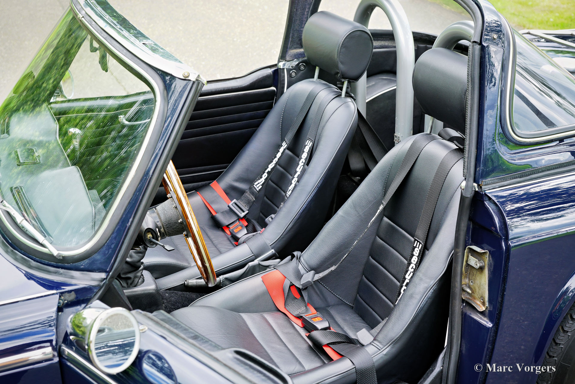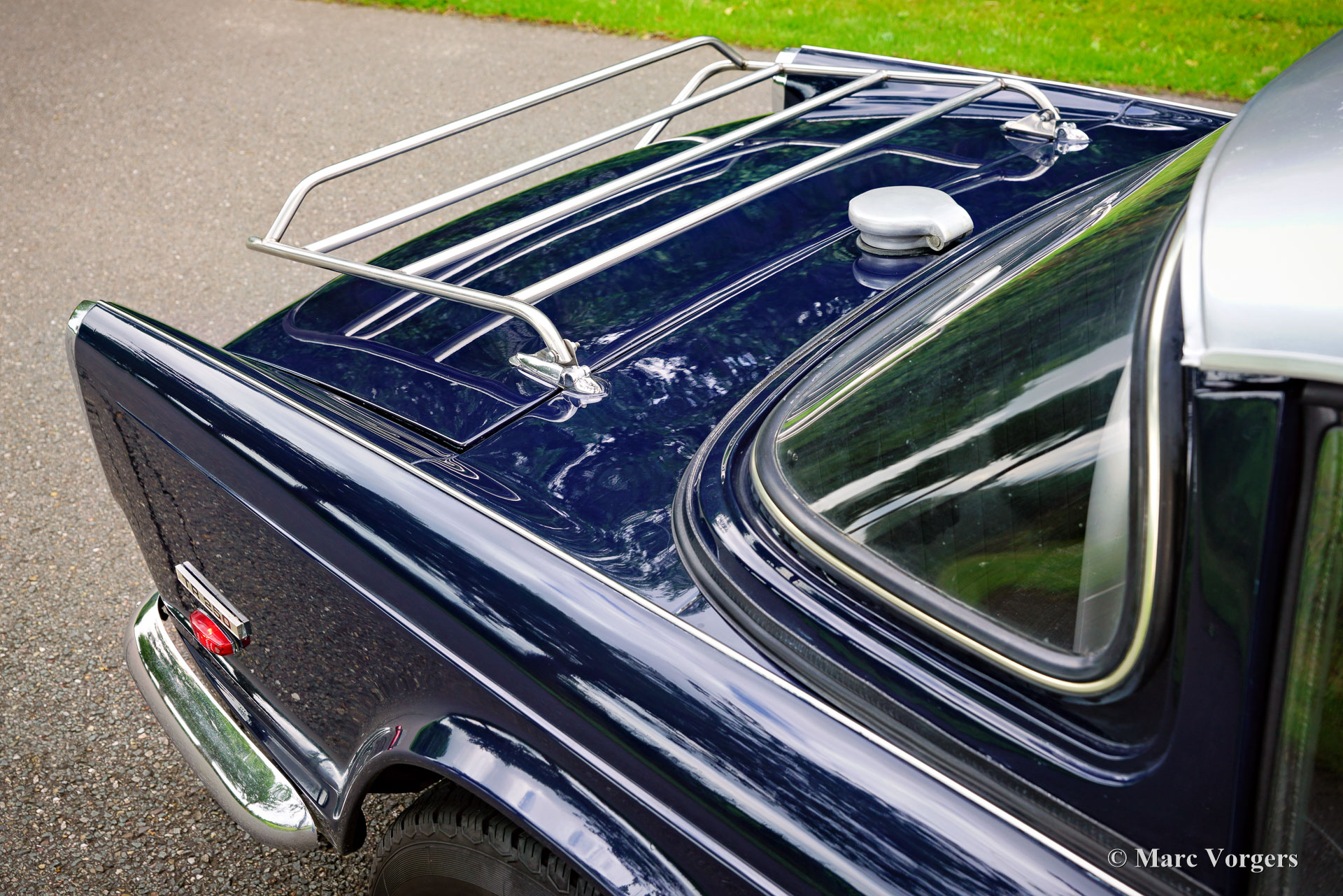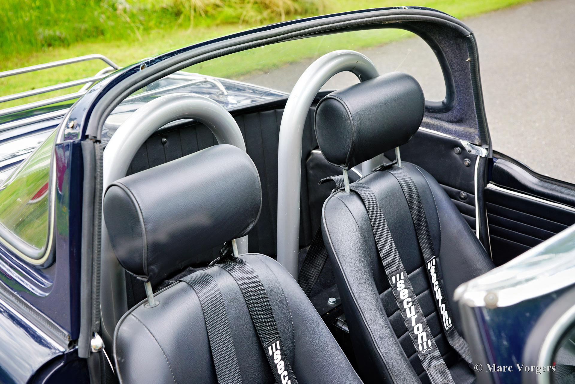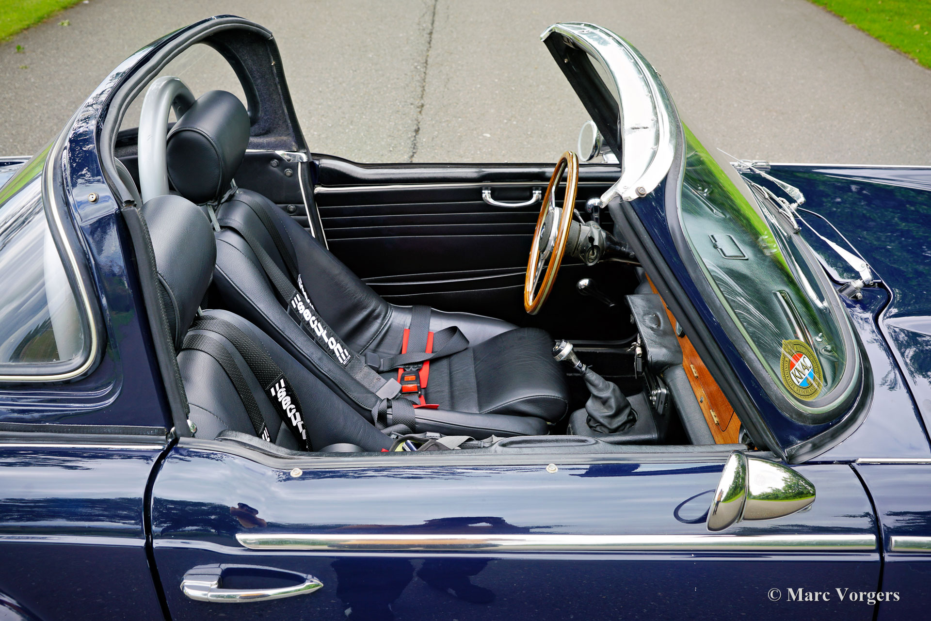 Triumph TR 250, Jahr 1968. Farbe Dunkelblau kombiniert mit einem schwarzen Interieur. Das Auto verfügt über ein begehrtes originales „Surrey Top“ mit einem Heckscheibenrahmen in Wagenfarbe, einem silbermetallic farbiges Dachpaneel und einem schwarzen Vinyl-Faltdach. Das „Surrey Top“ ist eine sehr begehrte Option für Triumph TR 4, TR 5 und TR 250 und war die Inspiration für das Porsche „Targa“-Dach. Der TR 250 ist die amerikanische Version des europäischen Triumph TR 5. Dieses Auto wurde in den USA neu verkauft und vor Jahrzehnten in die Niederlande importiert. Der letzte Besitzer hat seit 2001 Freude an diesem Triumph. Die (Wartungs-)Historie ist seit 2001 dokumentiert. Dieses großartig aussehende Fahrerauto ist in einem guten Zustand und das Auto fährt und klingt wunderbar. Der Besitzer hat an Touren teilgenommen, das Auto weist hier und da und vor allem im Innenraum Gebrauchsspuren auf. Das Auto verfügt über einige begehrte „Fast Road“-Modifikationen. Der Motor wurde nach europäischen TR 5-Spezifikationen gebaut und mit S.U.-Vergasern, elektronischer Zündung und einem Doppelrohr-Sportauspuff ausgestattet. Der Motor liefert rund 130 DIN-PS. Die Aufhängung wurde verstärkt und mit einem Stabilisator, Teleskopstoßdämpfern und Minilite-Rädern mit zentralen Radmuttern aufgerüstet. Darüber hinaus ist dieser schöne TR 250 mit Overdrive, einem großen Aluminium-Benzintank, Ölkühler, elektrischem Kühlgebläse, Schalensitzen, Überrollbügeln hinter den Sitzen, Securon-4-Punkt-Sicherheitsgurten und einem MotoLita-Sportlenkrad mit Holzkranz ausgestattet. Dieser Triumph TR 250 ist ein großartiges und wunderbares Fahrerauto, ein großartiger Begleiter, um historische (Touring-Rallye-)Events zu genießen!
