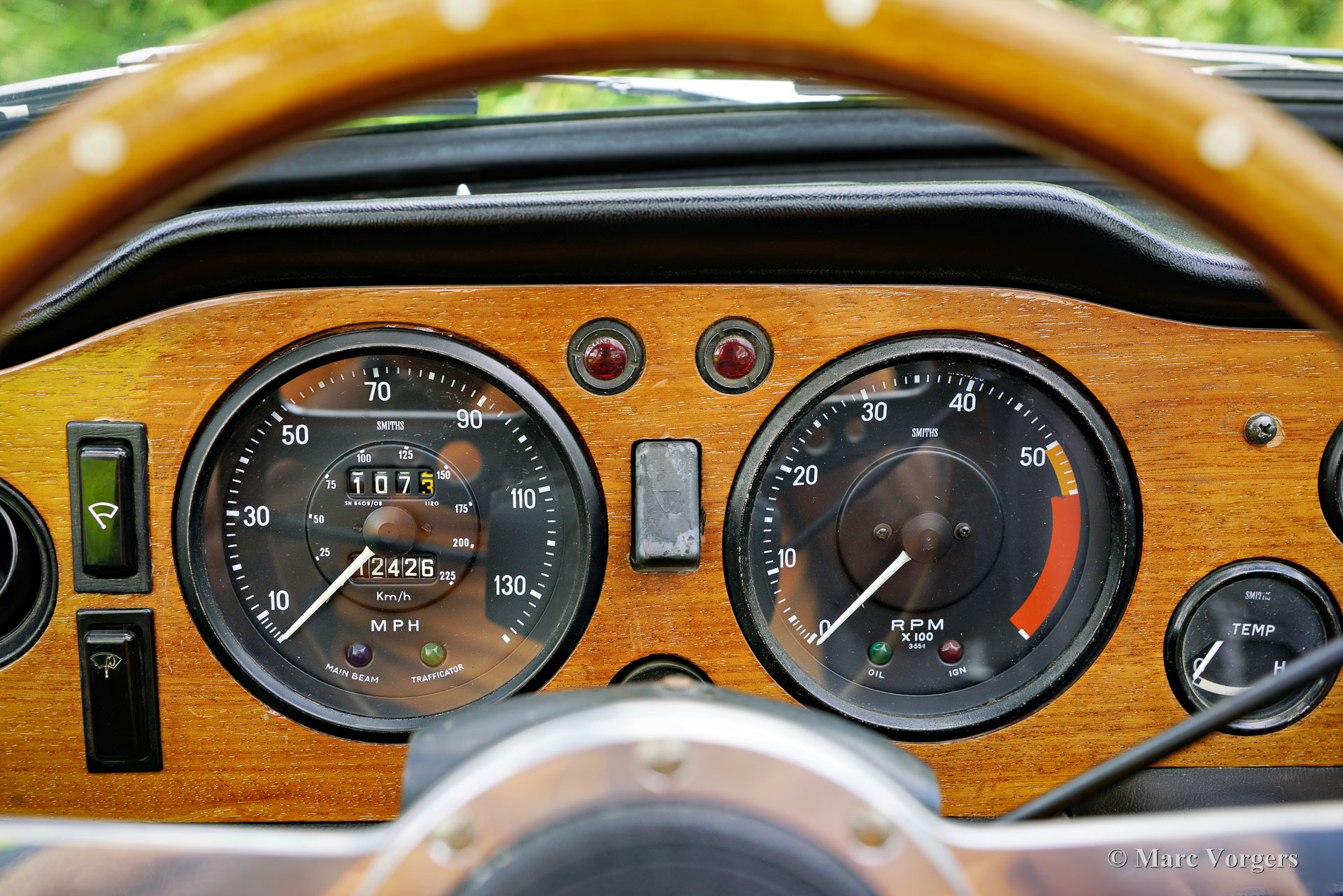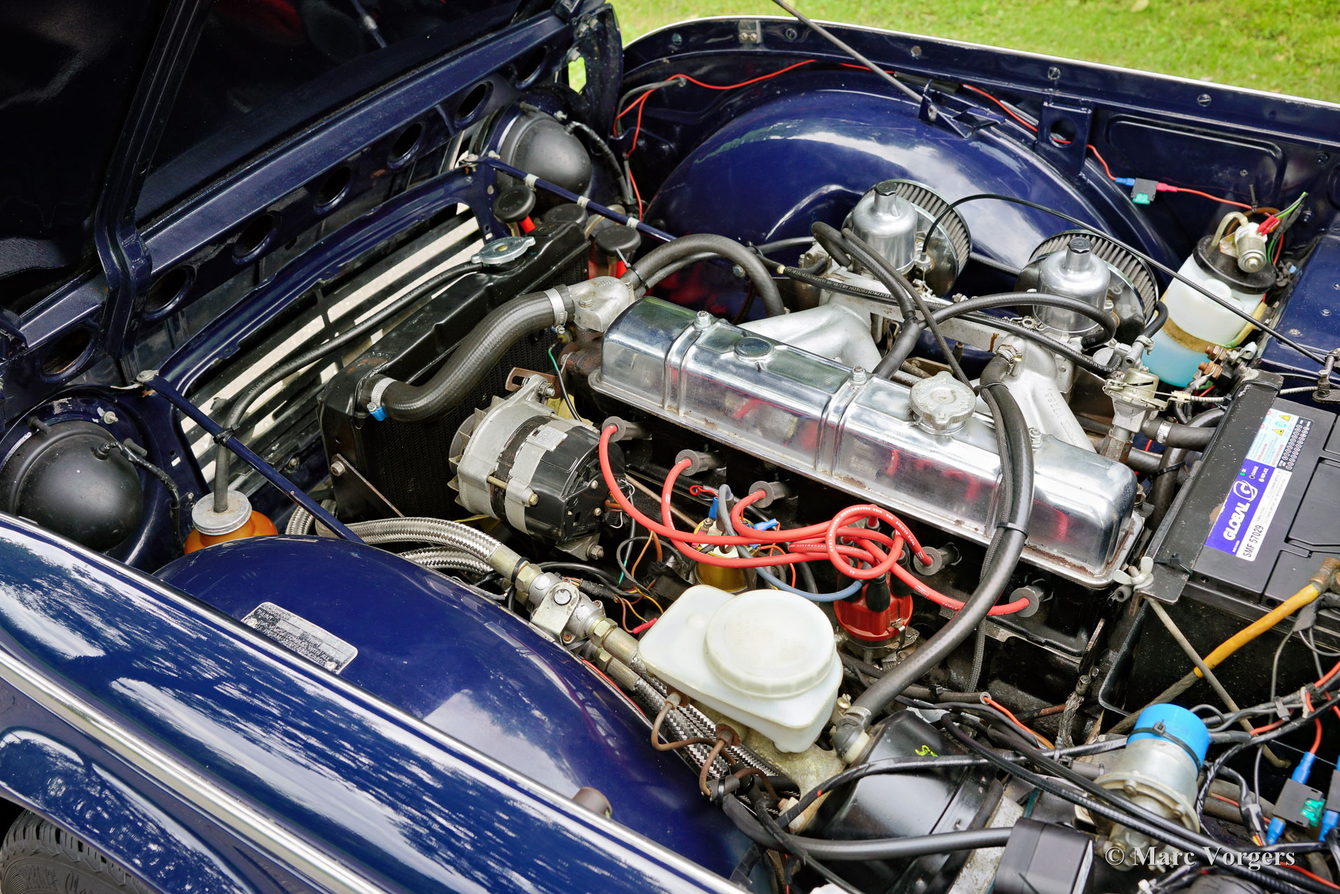 The six cylinder engine originally came from the Triumph 2000 saloon. For use in the TR 5/ TR 250 Triumph enlarged the cylinder capacity up to 2498 cc., fitted a more racy camshaft and petrol injection. Result was that they gained 60 bhp. (TR5) to the standard engine, enough for the engine to be used in a sports car like the TR 5/ TR 250.