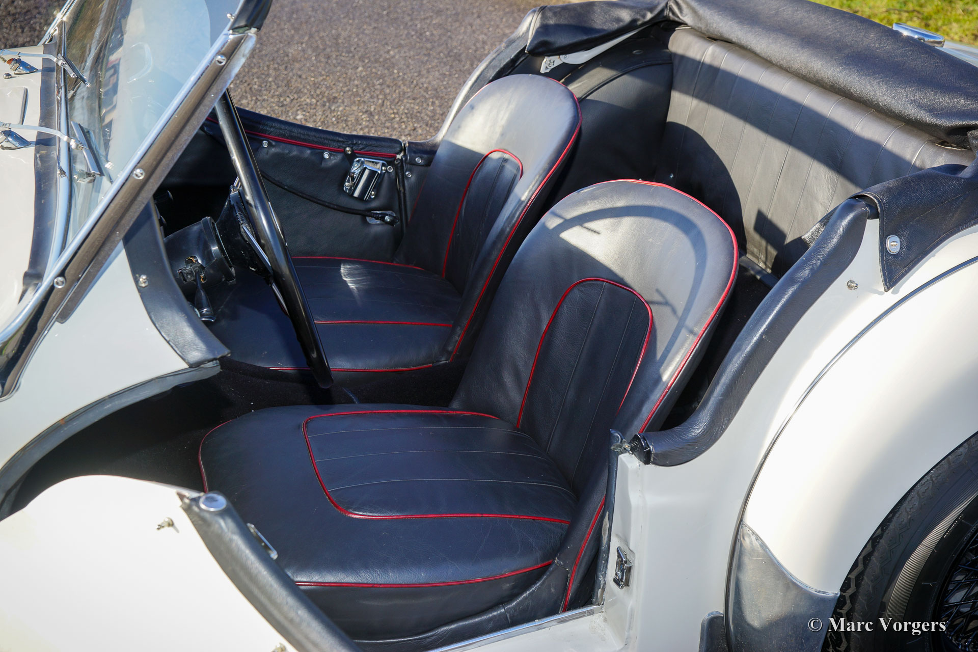 Triumph TR 3, Jahr 1957. Farbe Weiß kombiniert mit einer schwarzen Lederausstattung mit roten Paspeln und schwarzem Teppich. Schwarzes Verdeck, Persenning und Seitenfenster-Rahmen. Dieser wunderbare Triumph TR 3 verfügt über den frühen „Small Mouth“-Kühlergrill und ist werkseitig mit Scheibenbremsen an den Vorderrädern ausgestattet. Es ist deutlich zu erkennen, dass das Auto in der Vergangenheit umfangreich restauriert wurde, dieser TR 3 befindet sich in einem sehr guten und schönen Zustand! Der Triumph TR 3 verfügt über den leistungsstarken und robusten 2-Liter-Vierzylindermotor in Kombination mit einem Vierganggetriebe und Overdrive. Dieses Exemplar hat mit der weißen Karosseriefarbe, der schwarzen Innenausstattung, den schwarzen Speichenrädern und den Ledergurten auf der Motorhaube ein wunderbares sportliches Aussehen. Dieser Triumph wurde verbessert durch den Einbau einer Wechselstrom Lichtmaschine, eines elektrischen Lüfters und eines verbesserten Lenkgetriebes, das eine viel leichtere Lenkung ermöglicht. Dies ist ein wunderbares Englisches Oldtimer für Wochenendausflüge und andere Vintage-Lifestyle-Events!