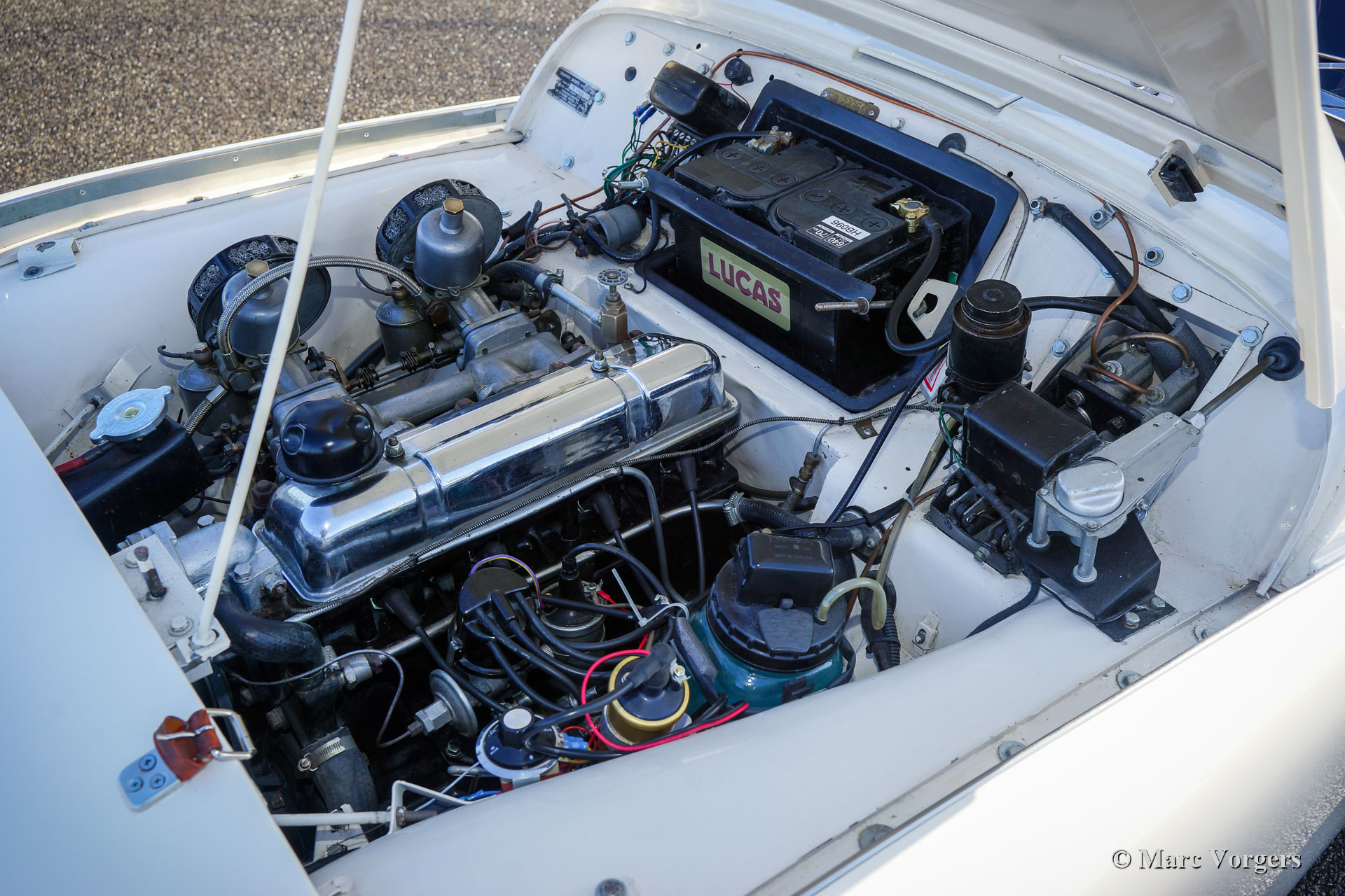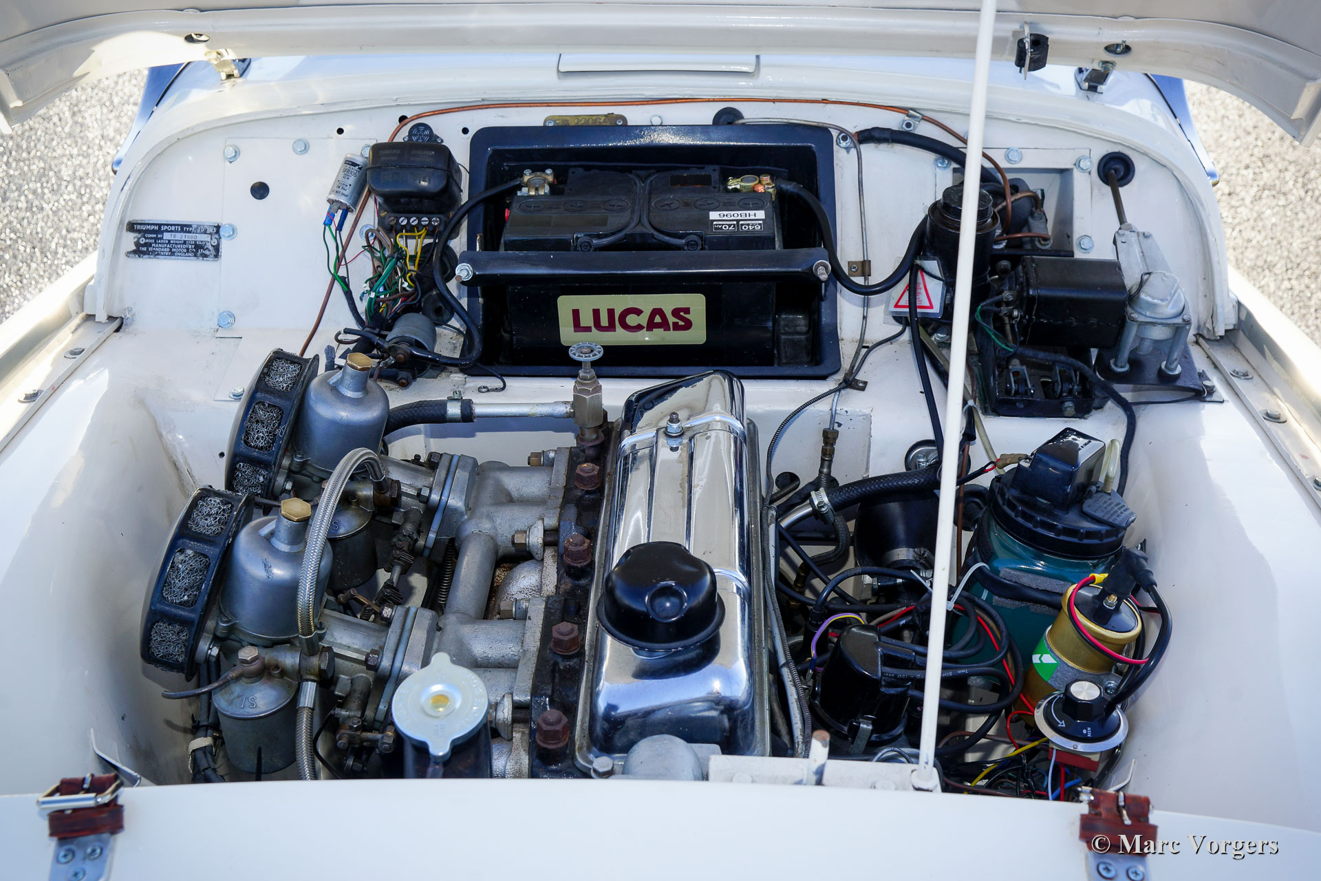 The Triumph TR 3 is a no nonsense sports car; very robust, simple and reliable, a true British sports car all over. The TR 3 was the first production car, off factory, equipped with disc brakes on the front-wheels. The engine was a Standard Vanguard based, cast-iron, long stroke, in-line four cylinder with a displacement of 1991cc. The TR 3 engine was equipped with two carburettors giving a power-output of almost 100 bhp.