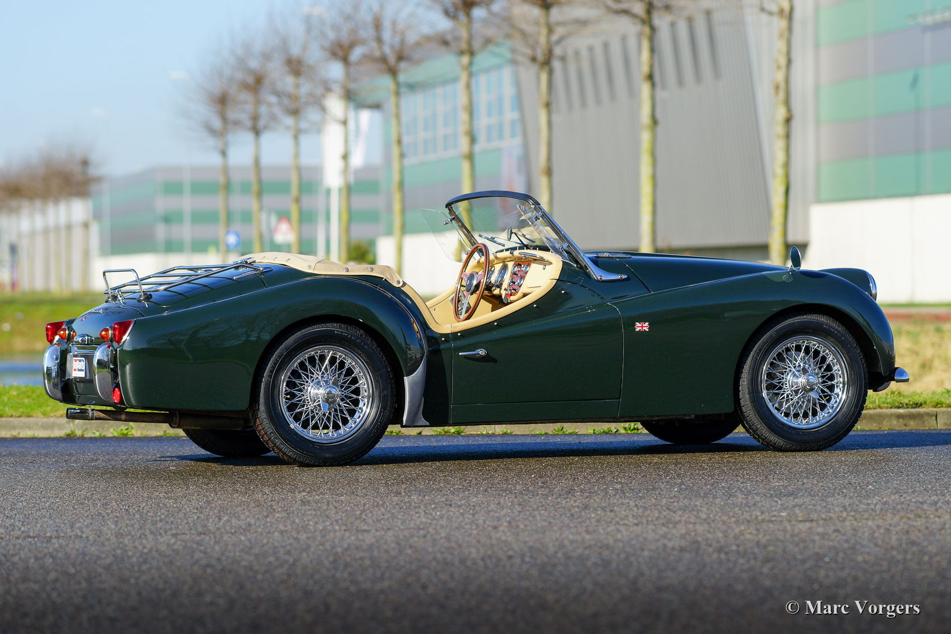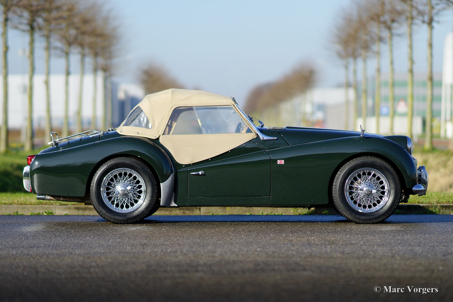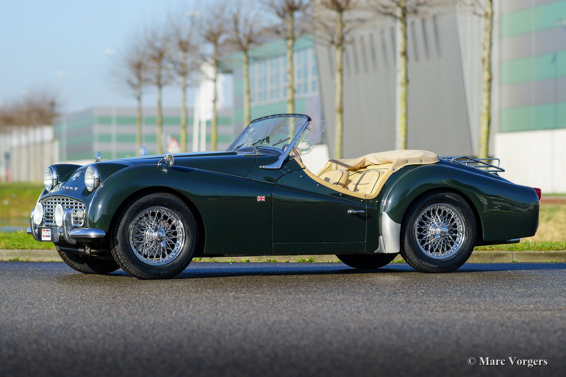 Triumph TR3 A, Jahr 1960. Farbe British Racing Green kombiniert mit einer beige (Biscuit) Lederausstattung mit dunkelgrünen Paspeln. Beigefarbene Mohair-Verdeck und Seitenfenster-Rahmen. Dieser wundervolle Triumph TR3 A wurde im Jahr 1997 aus den USA importiert. Nach seiner Ankunft in den Niederlanden wurde das Auto umfassend in Top-Zustand restauriert. Das Lenkgetriebe wurde gegen ein moderneres Getriebe ausgetauscht, um die Lenkung zu verbessern, die jetzt leicht und präzise ist. Dieser TR3 A ist in ausgezeichnetem Zustand und das Auto fährt perfekt! Das Auto verfügt über Overdrive, neue Chrom-Speichenräder, zusätzliche Lampen vorne, ein MotoLita-Lenkrad mit Holzkranz, eine Chrom-Gepäckablage, eine elektronische Zündung, K & N Sportluftfilter und eine Aluminium-Ventildeckel. Der 2,2-Liter-Vierzylinder-Reihenmotor zieht stark und es klingt fantastisch! Ein sehr schönes Beispiel!