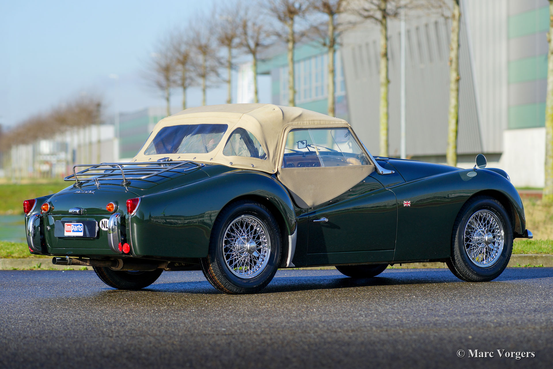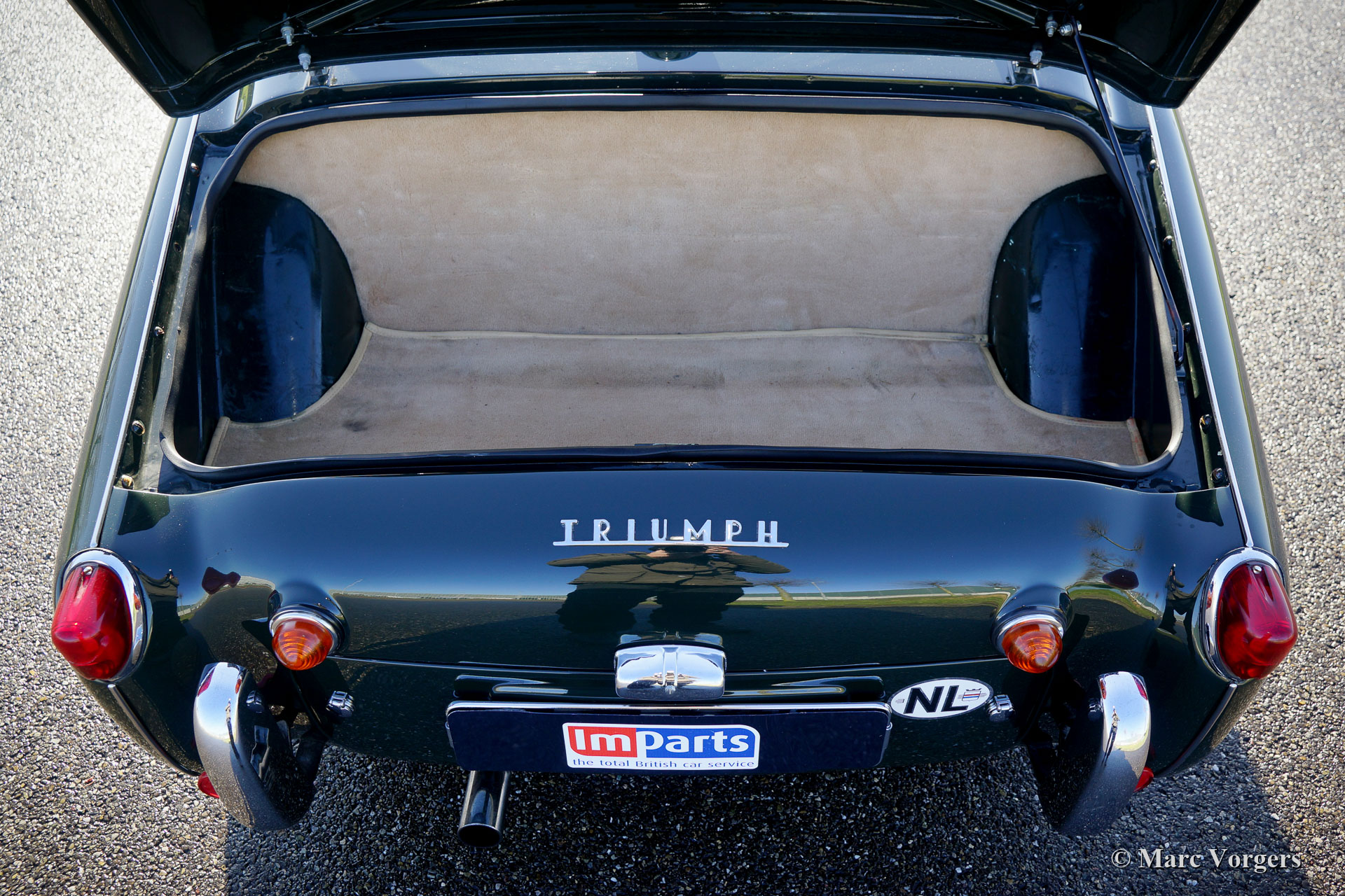 The Triumph TR 3 was uprated twice during the entire production period. In 1957 the car became a wider grille, door handles on the outside and slightly recessed headlamps and was named TR 3a then. In 1960-61 the cylinder capacity was enlarged to 2138 cc. giving a capacity of 104 bhp. and extra torque. Also the fully synchronized TR4 gearbox was incorporated. The car was then named TR 3b. The TR 3 is a pure two-person roadster, a classic generously giving you the fifties British sports car feeling, rough but honest. It comes with a simple soft-top for weather protection. Separate clip-on side screens can additionally be attached to the doors.