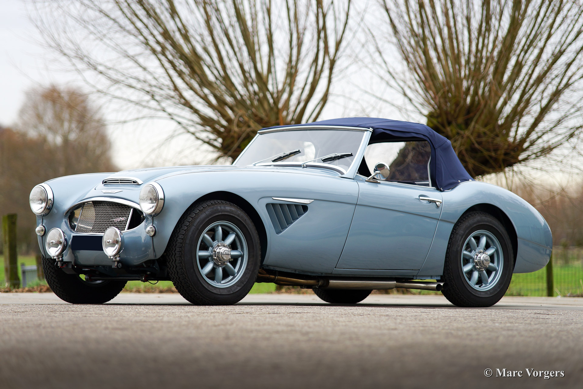 Austin Healey 100/6 (BN-4), year 1957. Colour Ice blue metallic with a blue leather interior and a blue soft top. This fantastic Austin Healey 100/6 was recently extensively restored and overhauled, the automobile is in superb (excellent++) condition!