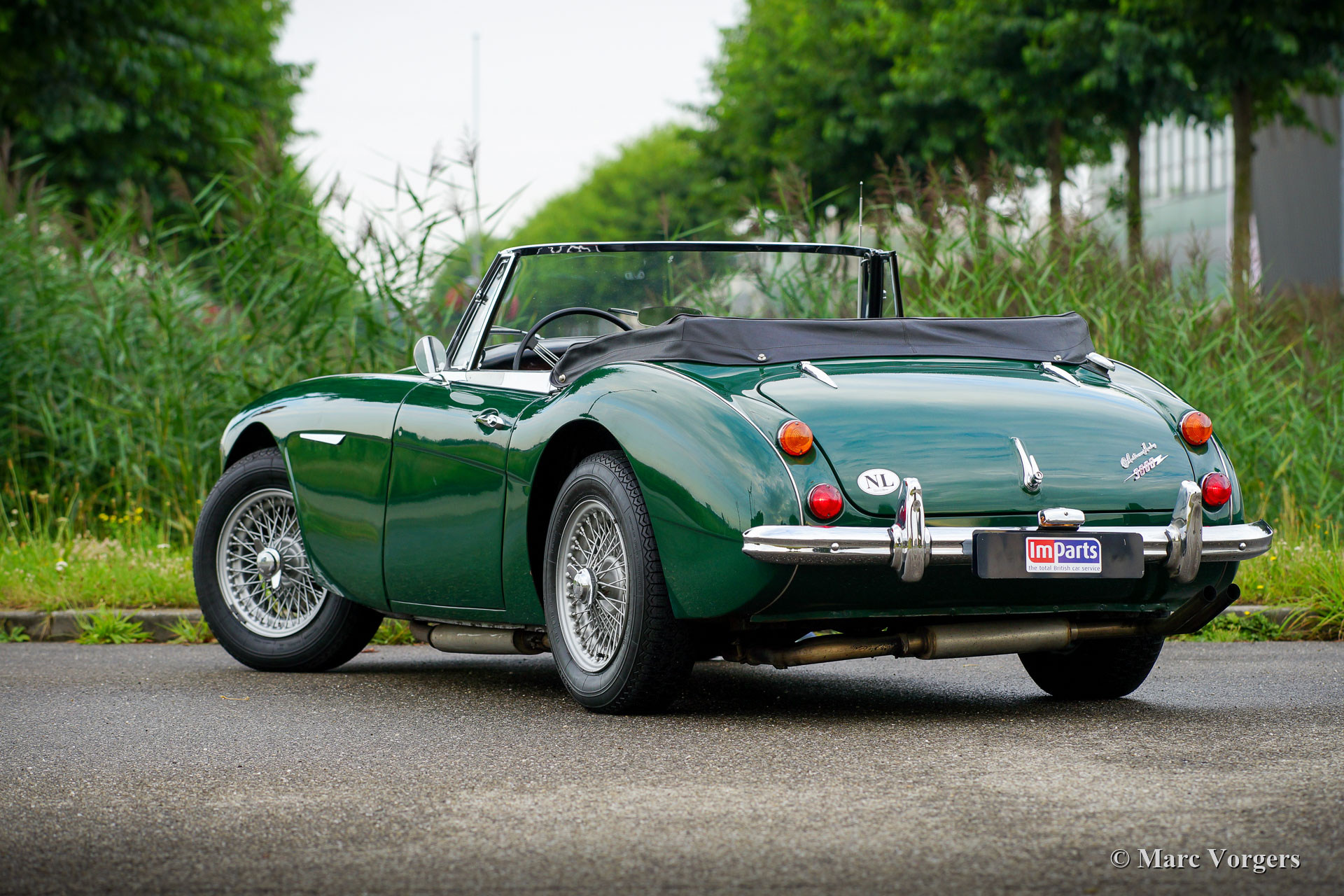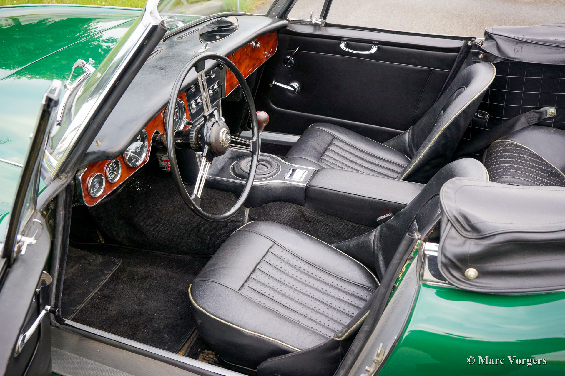 Austin Healey 3000 Mk III Phase 2, Jahr 1966. Farbe British Racing Green kombiniert mit einem schwarzen Kunstleder-Interieur. Schwarzes Verdeck und Hauben Abdeckung. Dieser Austin Healey ist ein echtes Fahrerauto in einem angemessener bis guten Originalzustand. Das Auto wurde in der Vergangenheit aus den USA importiert und nie restauriert. Das Auto muss seit vielen Jahrzehnten dunkel und trocken in der Garage stehen, da sich die Original-Vinylpolsterung noch in besonders gutem Zustand befindet und die silbernen Paspeln an den Sitzen nur geringfügig vom Sonnenlicht verfärbt sind. Die Fußmatten wurden erneuert und die Karosserie wurde in der Vergangenheit neu lackiert. Die Lackierung weist mehrere Alters- und Gebrauchsspuren auf. Unter der Motorhaube sieht es ziemlich rau aus, aber mechanisch funktioniert alles wie es sein soll. Der Reihensechszylinder-Motor ist ausgestattet mit drei Weber-Vergasern und einer Aluminium-Ventildeckel. Darüber hinaus verfügt das Auto über Overdrive- und silber lackierten Speichenräder. Dies ist ein sehr gut fahrender „Big Healey“ der letzten Serie mit einem superschönen Auspuff ‚Soundtrack‘ und offensichtlichen Alters- und Gebrauchsspuren, ein Fahrerauto.