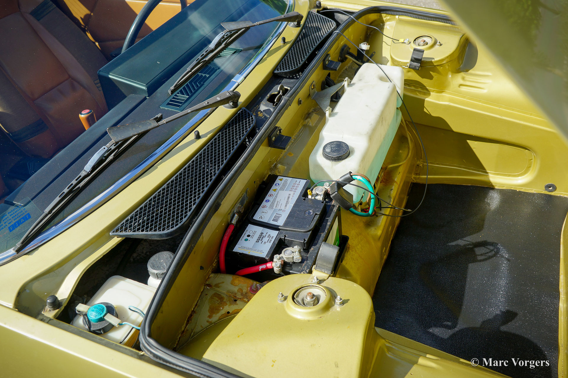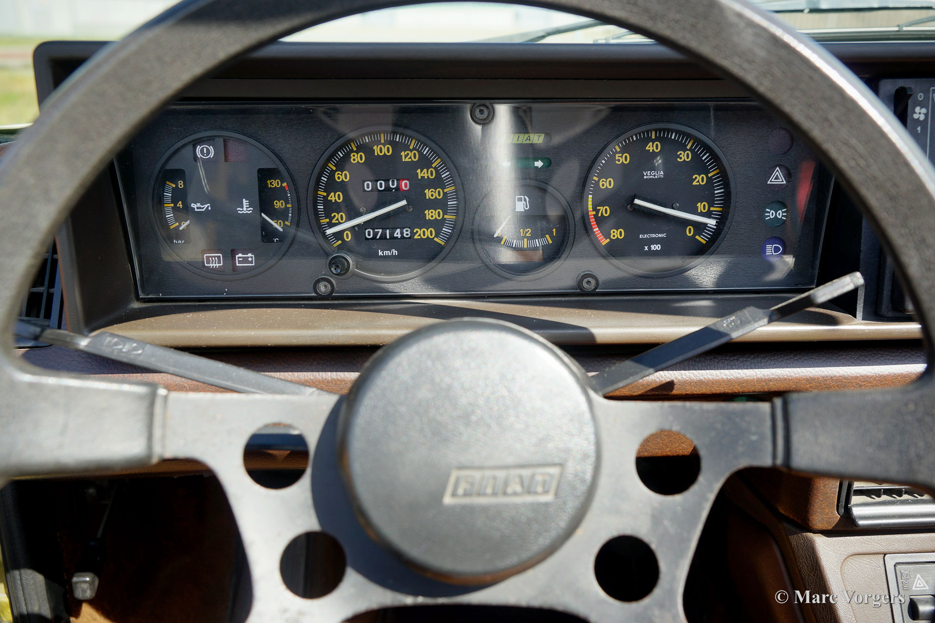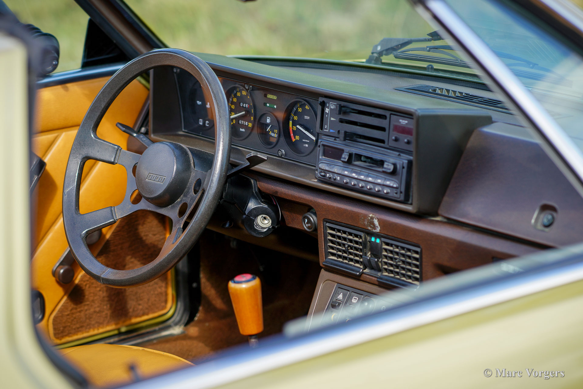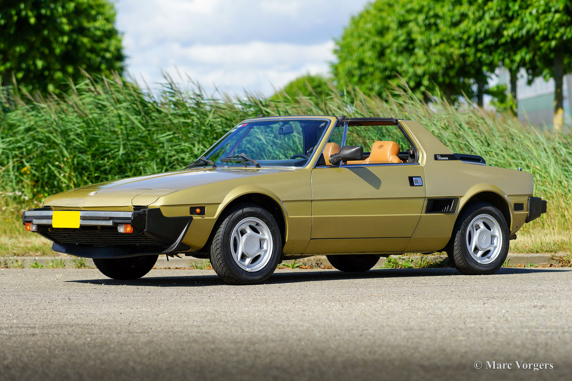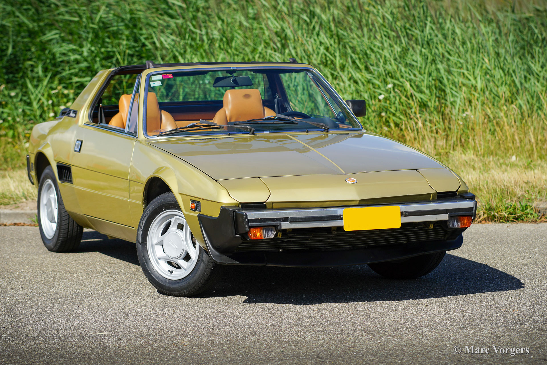Fiat X1/9 Five Speed, Jahr 1981. Farbe Goldmetallic kombiniert mit einer zweifarbigen braunen Kunstlederausstattung. Der Fiat X1/9 ist ein bemerkenswertes zweisitziges „Spider-Coupé“ mit Mittelmotor, das von Bertone entworfen wurde. Der X1/9 verfügt über eine abnehmbare Dachplatte, die im vorderen Gepäckraum verstaut werden kann. Das Reserverad ist raffiniert hinter dem Beifahrersitz verstaut. Der X1/9 wurde 1972 vorgestellt und die zweite Serie mit dem Namen „Five Speed“ wurde 1978 eingeführt. Dieser schöne Fiat X1/9 Five Speed befindet sich in einem guten Originalzustand, das Auto hat 107.000 Kilometer von neu gefahren. Das Auto zeigt alle Originaldetails und einige Gebrauchs- und Altersspuren (etwas Korrosion an der vorderen unteren Ecke des rechten vorderen Kotflügels). Dieser schöne Fiat ist mit einem 1500-cm³-Vierzylindermotor und einem manuell betätigten Fünfganggetriebe ausgestattet. Dieser Fiat X1/9 Five Speed ist ein sehr originelles Beispiel und ein entzückendes Fahrerauto.