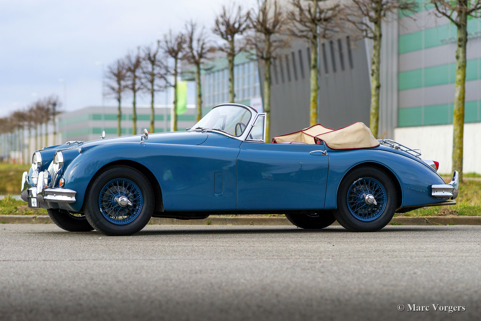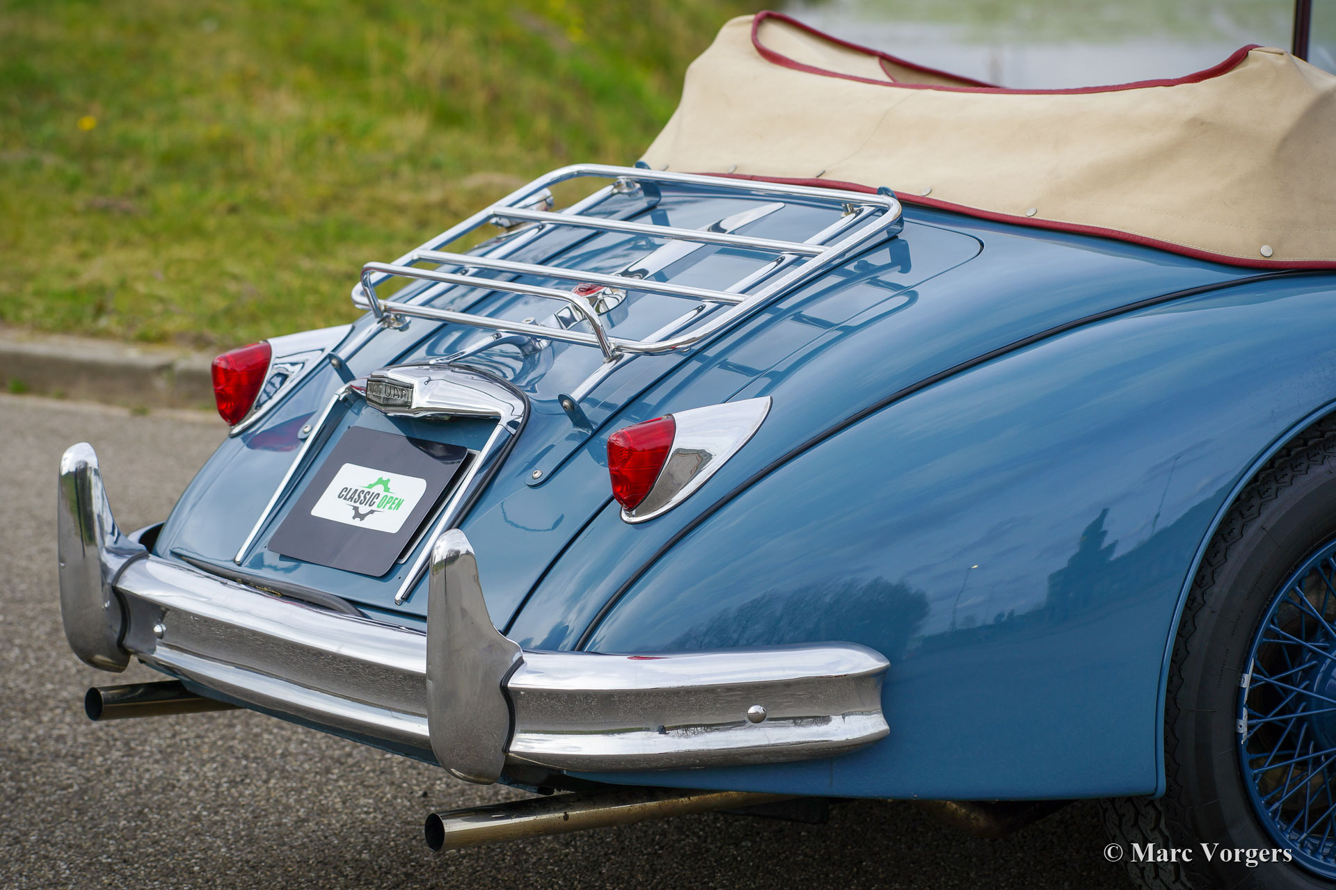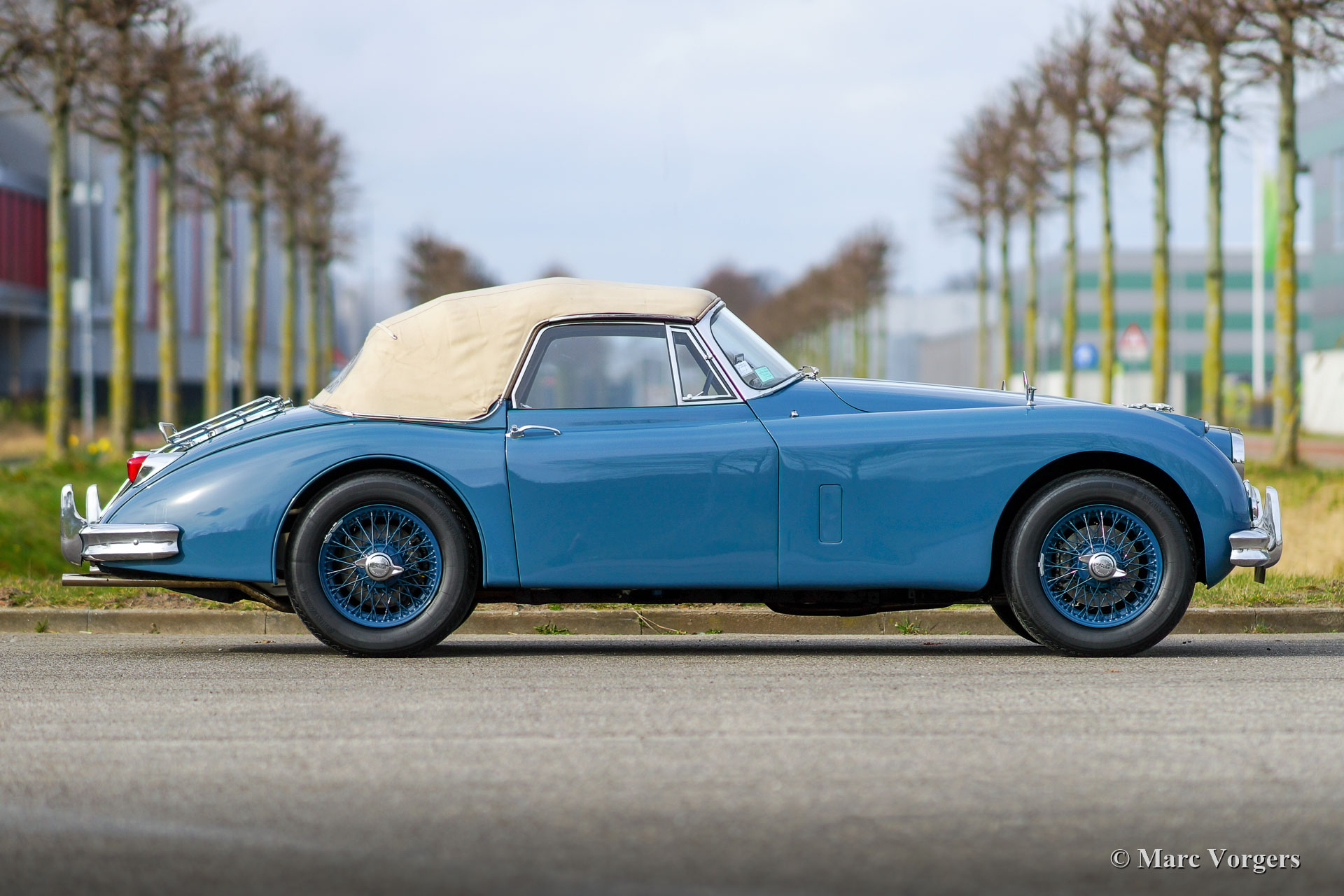 Jaguar XK 150 DHC, 1959. Farbe blau ‚Cotswold-Blue‘ kombiniert mit blauen Speichenrädern und einer roten Lederausstattung mit rotem Teppich. Dieser prächtige Jaguar XK 150 DHC (Drop Head Coupé) wurde in den USA neu verkauft. Das Automobil wurde über die Jahre gut gewartet und gepflegt, das Auto befindet sich in einem guten bis sehr guten Fahrerzustand mit leichten Gebrauchs- und Altersspuren. Dieser Jaguar XK 150 DHC ist ein echter „Hingucker“ mit seinem schlanken Aussehen, der wunderschönen Farbgebung und dem sportlichen Auspuffsound. Dieser XK 150 bietet nicht nur Show, sondern dem neuen stolzen Besitzer auch jede Menge Fahrt! Das Auto ist mit einem leistungsstarken 4.2-Liter-Motor (Jaguar E-Type mit 265 PS), einem modernen 5-Gang-Schaltgetriebe und einer Edelstahl-Auspuffanlage ausgestattet. Dieser Jaguar XK 150 fährt beeindruckend kraftvoll! Auch für die Bremsleistung ist bestens gesorgt, das Auto verfügt über Servo-Scheibenbremsen an allen vier Rädern. Darüber hinaus ist dieser wunderschöne Jaguar mit Sicherheitsgurten, breitstrahlenden Lucas SFT576-Nebelscheinwerfern vorne und einem verchromten Gepäckträger auf dem Kofferraumdeckel ausgestattet. Dies ist ein beeindruckendes Jaguar XK 150 DHC-Fahrerauto, das Sie in vollen Zügen genießen können!