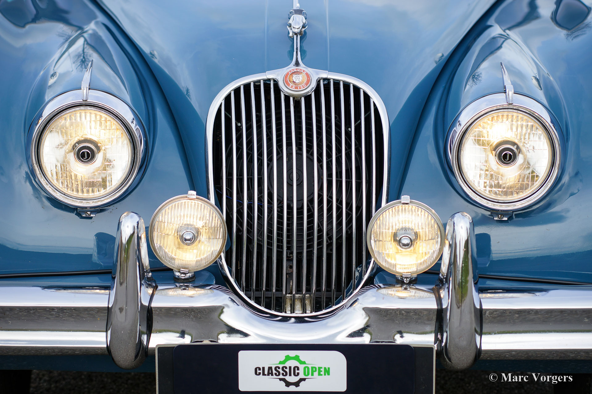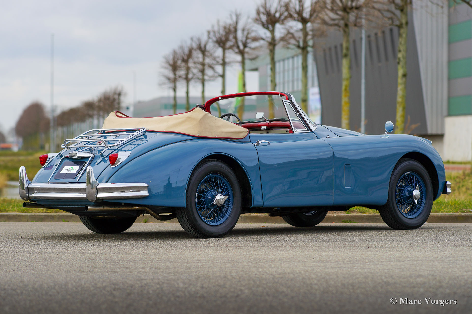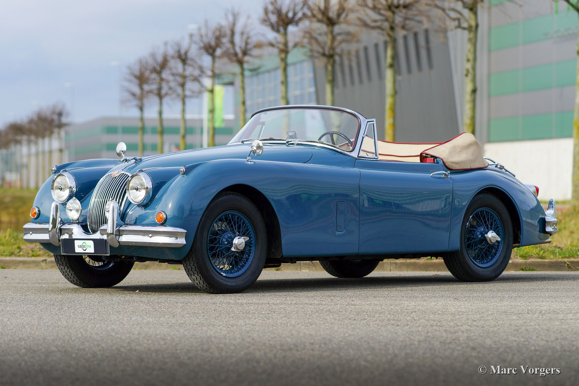 Jaguar XK 150 DHC, 1959. Farbe blau ‚Cotswold-Blue‘ kombiniert mit blauen Speichenrädern und einer roten Lederausstattung mit rotem Teppich. Dieser prächtige Jaguar XK 150 DHC (Drop Head Coupé) wurde in den USA neu verkauft. Das Automobil wurde über die Jahre gut gewartet und gepflegt, das Auto befindet sich in einem guten bis sehr guten Fahrerzustand mit leichten Gebrauchs- und Altersspuren. Dieser Jaguar XK 150 DHC ist ein echter „Hingucker“ mit seinem schlanken Aussehen, der wunderschönen Farbgebung und dem sportlichen Auspuffsound. Dieser XK 150 bietet nicht nur Show, sondern dem neuen stolzen Besitzer auch jede Menge Fahrt! Das Auto ist mit einem leistungsstarken 4.2-Liter-Motor (Jaguar E-Type mit 265 PS), einem modernen 5-Gang-Schaltgetriebe und einer Edelstahl-Auspuffanlage ausgestattet. Dieser Jaguar XK 150 fährt beeindruckend kraftvoll! Auch für die Bremsleistung ist bestens gesorgt, das Auto verfügt über Servo-Scheibenbremsen an allen vier Rädern. Darüber hinaus ist dieser wunderschöne Jaguar mit Sicherheitsgurten, breitstrahlenden Lucas SFT576-Nebelscheinwerfern vorne und einem verchromten Gepäckträger auf dem Kofferraumdeckel ausgestattet. Dies ist ein beeindruckendes Jaguar XK 150 DHC-Fahrerauto, das Sie in vollen Zügen genießen können!