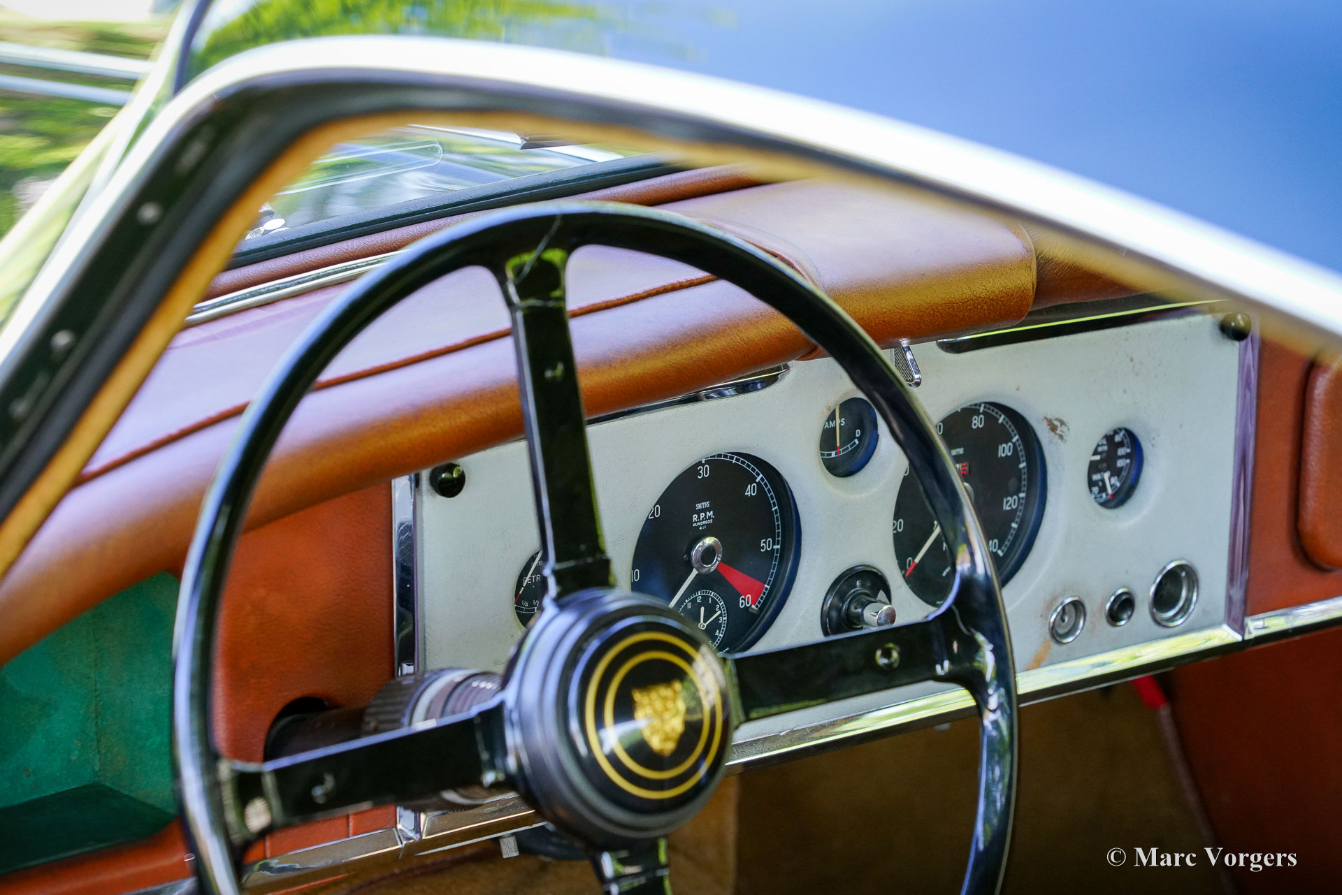 The XK 150 replaced the Jaguar XK 140 in 1957. The undercarriage of the XK 150 was for the greater part equal to the XK 140’s, but its bodywork was new and broader. Though its design was again very refined, it was somewhat less dynamic as compared with the XK 120 and XK 140. The bodywork was less sleek and the design of the characteristic wing lines was now less markedly sloping. The increased width of the bodywork resulted in a wider grille which, in line with the best Jaguar’s tradition, was delicately integrated in its design. The XK 150 was the first of XK series with an unbroken panoramic windscreen.