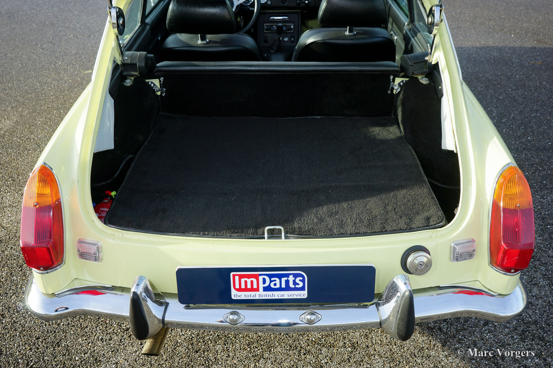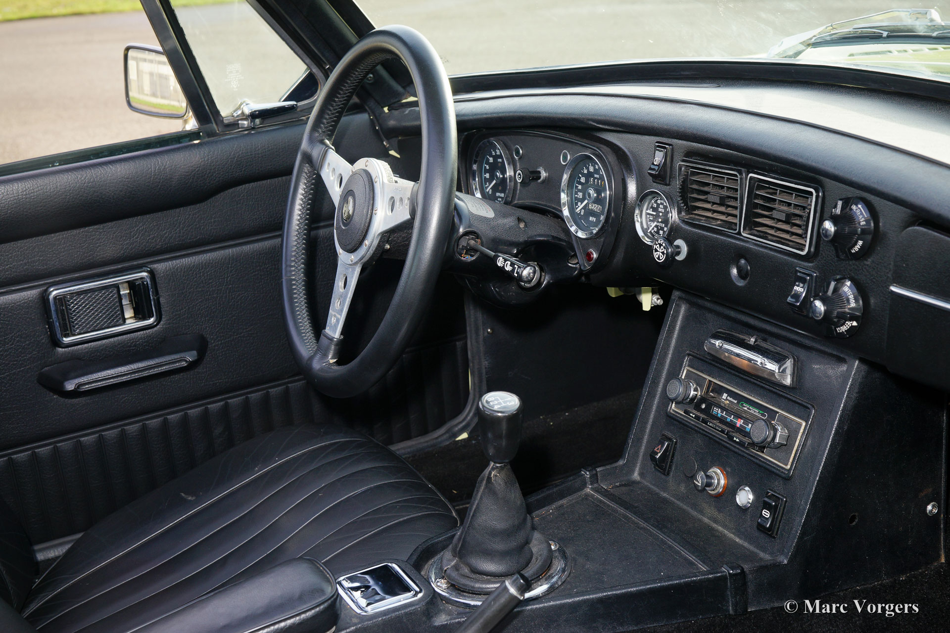 The MG B was the first MG (Morris Garage) built of unitary construction bodywork. The MG B GT V8 was built between 1973 and 1976. In 1970, Ken Costello, a garage owner, installed a Rover 3500 V8 engine in an MG B. MG took over the idea, though engine capacity of the Rover V8 in the MG did not produce 180 hp. at 5500 rpm. but 140 hp. at 5000 rpm. Influenced by the American rules on safety, later models were equipped with synthetic rubber bumpers. Many of the later, built from 1974 until 1976, "rubber-bumper" models are now converted into "chrome-bumper" models. The car shown in these pictures is a original chrome bumper car fitted with the original MG B GT V8 rims.
