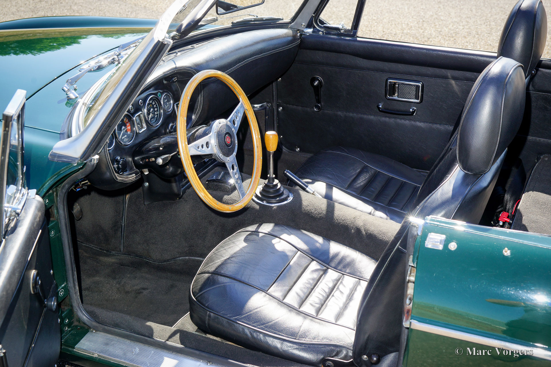 MG MGC Roadster, Jahr 1969. Farbe British Racing Green kombiniert mit einem schwarzen Interieur. Schwarze Ledersitze mit Kopfstützen und schwarzem Teppich. Beiges „pack away“ Softtop (wird im Kofferraum verstaut). Dieser fantastische MGC Roadster ist in einem sehr guten Zustand und das Auto fährt wunderbar. Das Auto wurde sehr gut gewartet und gepflegt; der letzte Besitzer hegte den Wagen seit 2018. Der MGC ist das Sechszylinder-Schwesterauto des MGB, der Motor leistet satte 145 SAE-PS. Das Fahrgefühl ist eine Mischung aus dem „Big Healey“ und dem kompakten MGB, und der Auspuffsound ist wunderbar! Äußerlich sieht der MGC auf den ersten Blick genauso aus wie der MGB, Kenner erkennen ihn an der speziellen Motorhaube, die mit „Power-Wulsten“ versehen ist, um den großen Motor und seine Doppelvergaser aufzunehmen. Dieser feine MGC ist ausgestattet mit OVERDRIVE, verchromten Speichenrädern, einem MotoLita-Lenkrad mit Holzkranz, einem Edelstahlauspuff und Servobremsen mit Doppelservos. Der MGC Roadster ist ein fantastisches Oldtimer Reisecabrio!