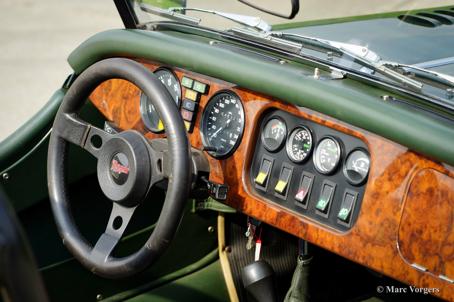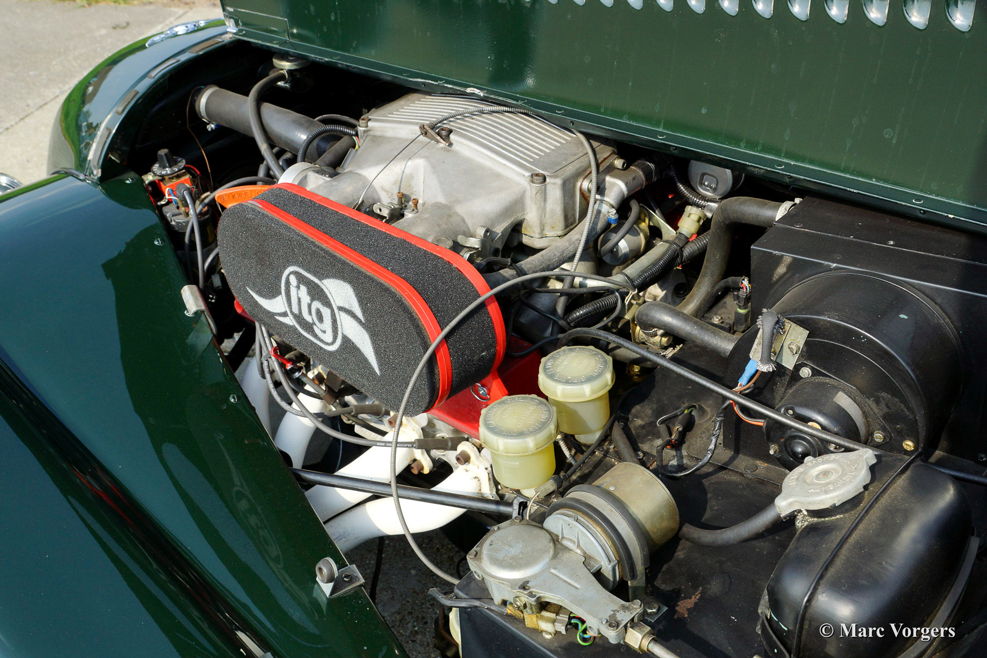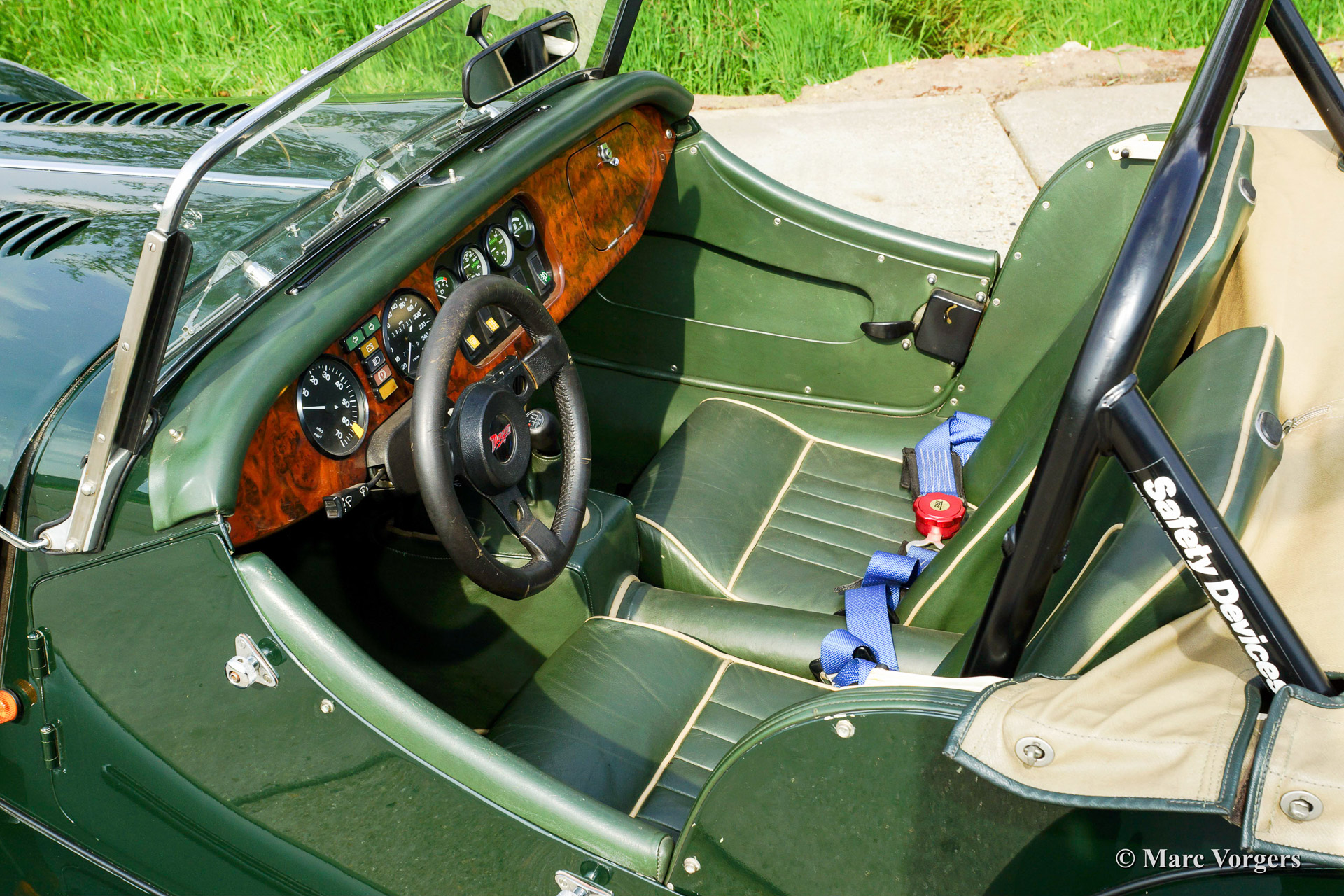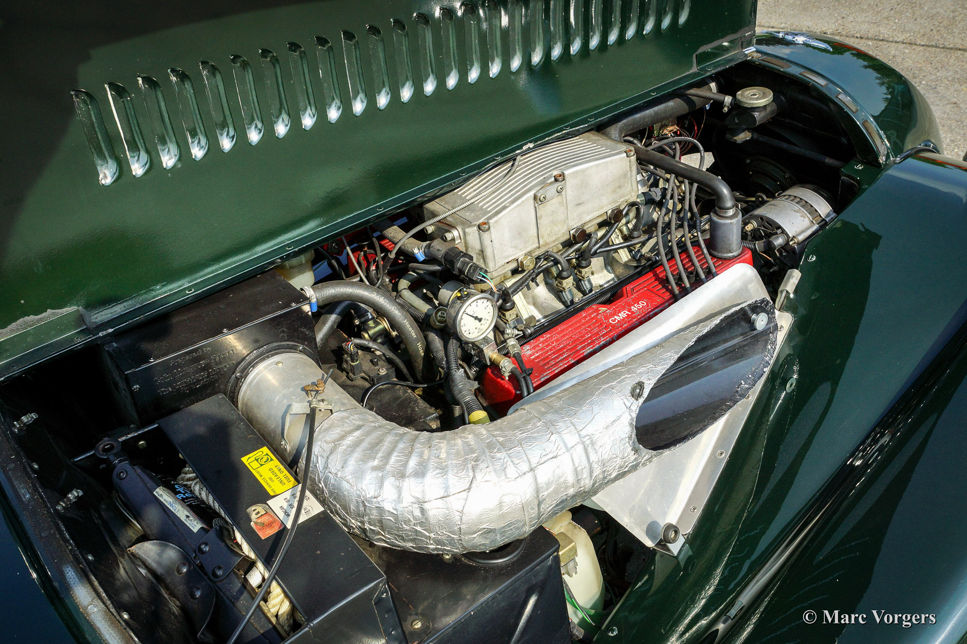 Morgan +8, Jahr 1987. Farbe British Racing Green mit einem grünen Lederausstattung. Crème Vinyl Persenning (tonneu cover). Dieser herrliche Morgan wurde neu verkauft in den Niederlanden. Das Auto kommt von dem ersten Besitzer, der das Auto für 46.000 unvergessliche Kilometer genossen hat. Das Auto ist in einem hervorragenden Originalzustand! In den frühen 1990er Jahren, als der Wagen 1200 Kilometer gefahren hatte, wurde dieser Morgan hervorragend von Colin Musgrove Racing in England abgestimmt. MusgroveSie erhöhte den Hubraum des Rover 3,9 Liter-V8-Motor bis zu 4,5 Liter. Der Motor ist mit Cosworth Kolben, einem geschmiedeten Kurbelwelle der Marke Crane, einer Sportnockenwelle, größeren Ventilen, einem leichteren Schwungrad, ein ‚double Plenum‘ Einlasskrummer und eine spezielle Abgasanlage ausgestattet. Der Motorblock ist mit Querschrauben verstärkt. Mit 295 (!) Gemessene Pferdestärken an den Hinterrädern beschleunigt dieser Morgan von 0-100 km / h in 4,2 Sekunden, Super Car Niveau! Natürlich sind das Fahrwerk und die Bremsen dieser Gewalt angepasst. Die hintere Aufhängung ist mit ein Panhard Stange und ‚anti-tramp‘ Stange ausgerüstet. Rundum sind Koni Stoßdämpfer montiert. Die Serienbremsen wurden durch innenbelüftete Scheibenbremsen rundum ersetzt und Bremskraft wird durch spezielle AP-Rennsättel gegeben. Zur zusätzlichen Sicherheit ist ein Überrollbügel angebracht und sind Vierpunkt Sicherheitsgurte montiert. Trotz der umfangreichen Tuning, der massiven Drehmoment und Leistung, ist dieser Morgan noch immer ‚gemütlich‘ und recht Komfortabel zu Fahren. Der Fahrer darf dabei nie vergessen was es unter der Haube und unter dem Gaspedal gibt. Dieser Morgan kann der schnellste ‚Strassen‘ Morgan +8 in Europa sein, nur für erfahrene Fahrer geeignet.