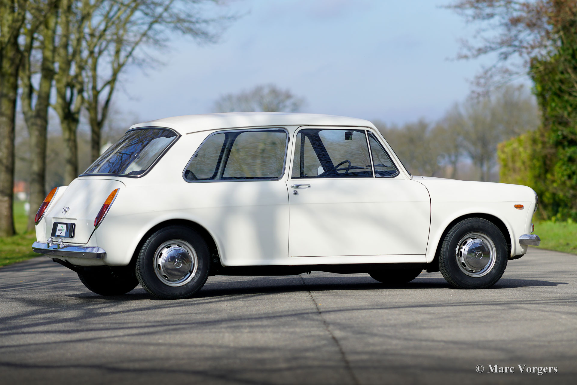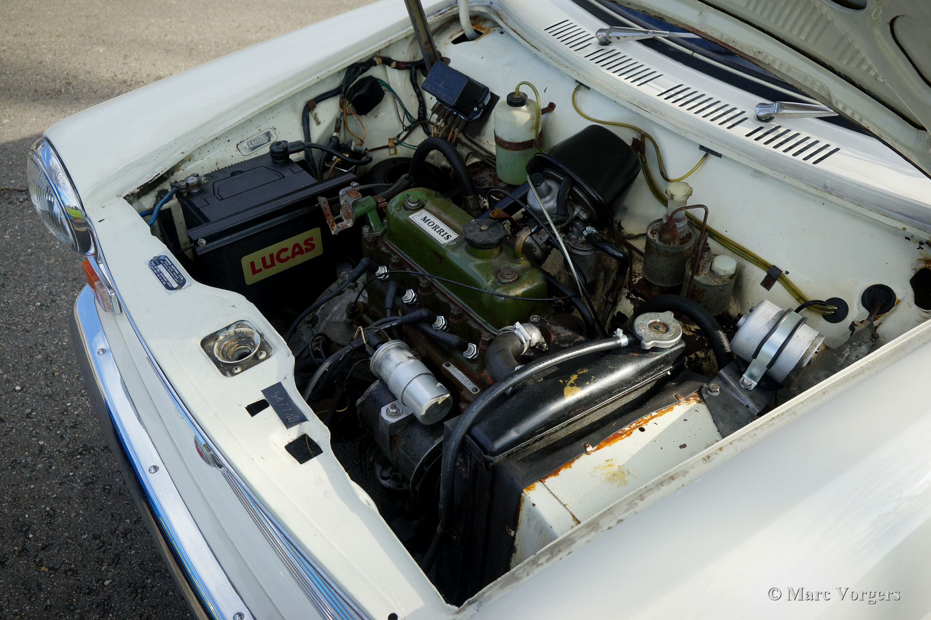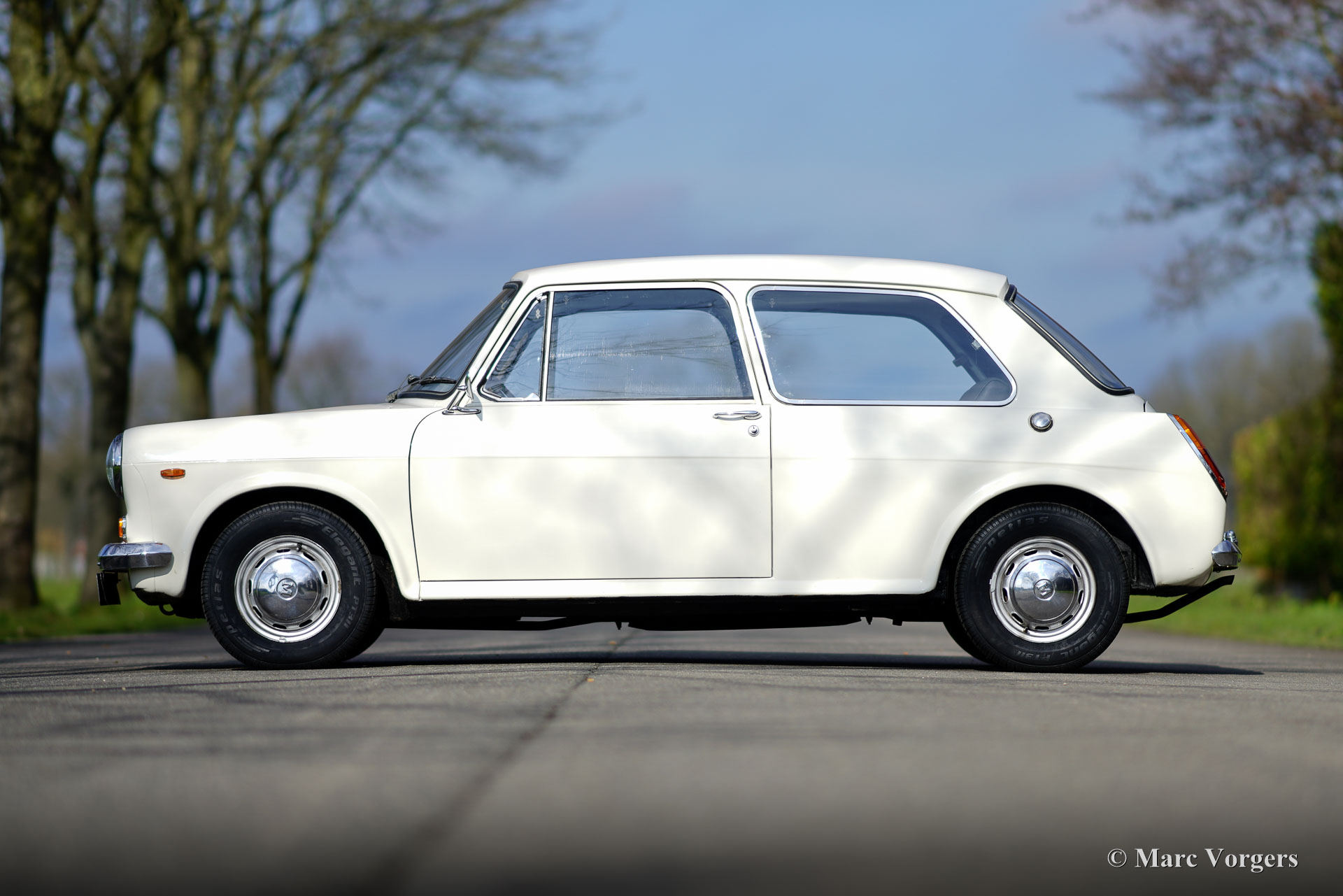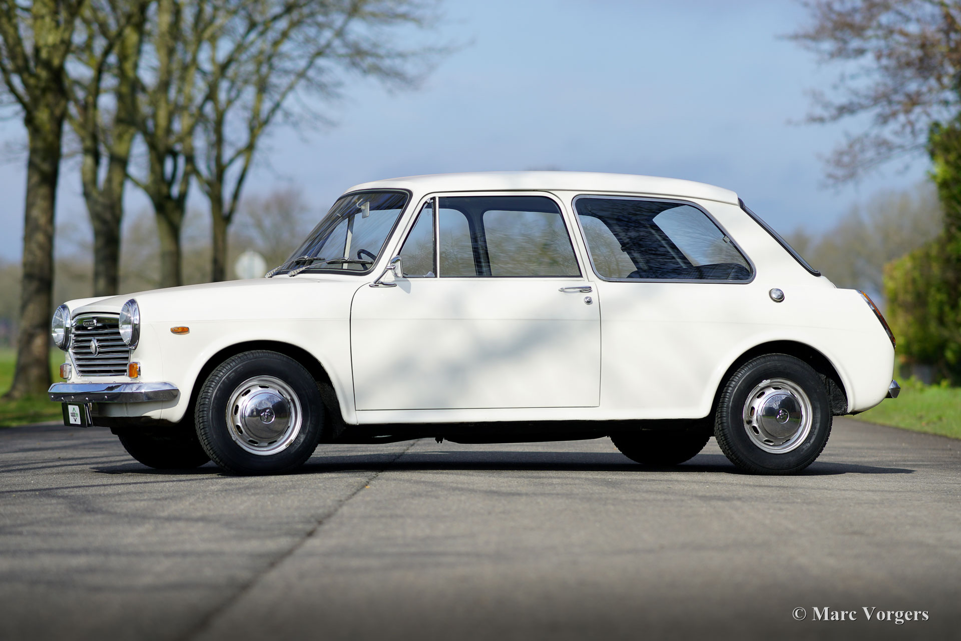 Morris 1100, Jahr 1970. Farbe Weiß kombiniert mit schwarzem Kunstleder-Interieur und grauem Teppich. Dieser Morris 1100 wurde in den Niederlanden neu verkauft. Das Auto stammt vom zweiten Besitzer, der den Morris seit 1982 schätzt! Gleich nach dem Kauf im Jahr 1982 erhielt der Wagen eine neue Lackierung in der Originalfarbe. Der 40 Jahre alte Lack ist immer noch in einem sehr guten Zustand und die Karosserie ist vollkommen intakt. Der Morris hat knapp 100.000 Kilometer gefahren. Das Auto fährt perfekt, der Motor läuft wunderbar und das Getriebe schaltet wie es soll. Die innovative „Hydrolastic“-Federung funktioniert hervorragend und verleiht dem Auto ein angenehmes Fahrgefühl. Dieser Morris 1100 ist in einem sehr guten und super originalen Zustand! Der Innenraum ist sehr geräumig und bietet Platz für fünf Passagiere. Der Morris 1100 war auch mit anderen Kühlergrills und „Marken“-Abzeichen als Austin Glider, Wolseley, MG und Riley mit dem Codenamen ADO16 erhältlich. Ein frühes Beispiel für „Badge Engineering“, das im modernen Automobilbau die Norm ist. Das Auto hat einen kompletten Service, eine neue Benzinpumpe und vier neue Reifen erhalten. Der Morris 1100 ist ein weiteres Innenraumwunder, das von Alec Issigonis, dem Vater des legendären Mini, entworfen wurde.