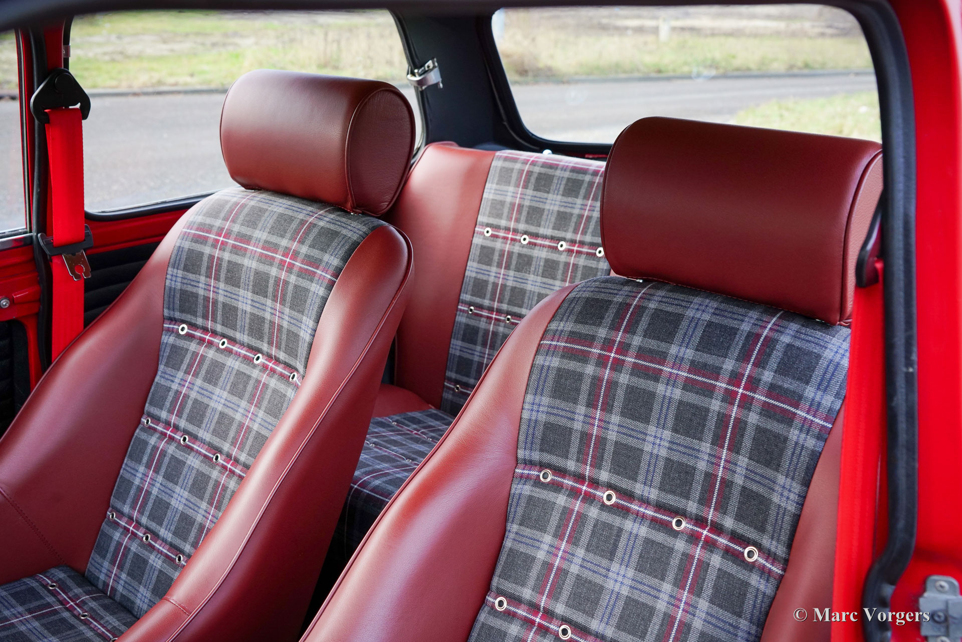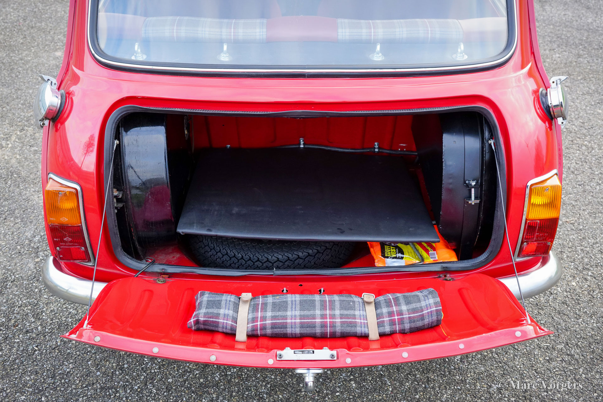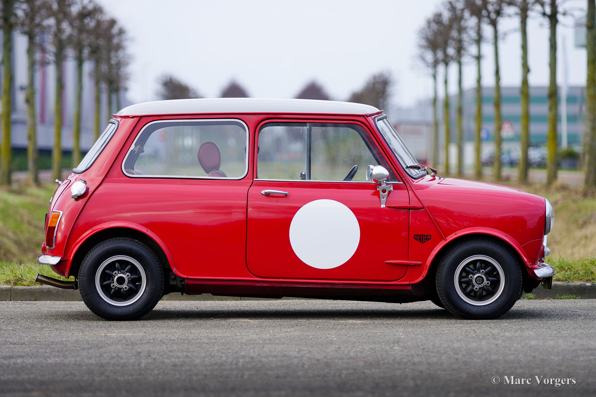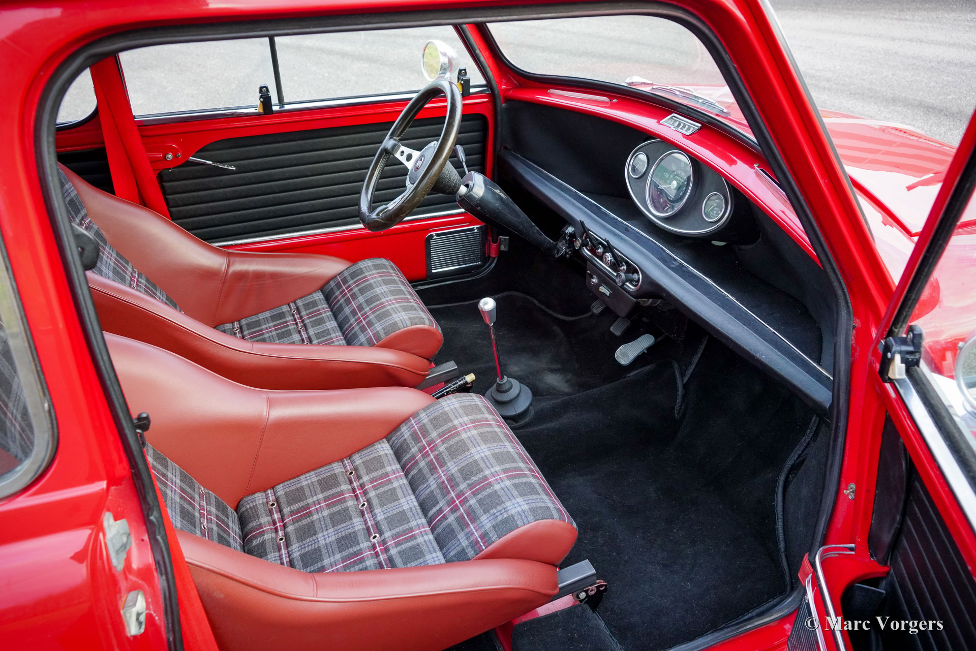 Morris Mini Cooper MK2, Jahr 1970. Außenfarbe Tartanrot kombiniert mit einem in „Sky Mist“ lackierten Dach. Maßgeschneiderte dunkelrote/graue Leder-/Stoffausstattung mit schwarzem Teppich. Dieser fantastische Mini Cooper wurde im British Leyland Werk ‚Sebutal‘ in Portugal zusammengebaut und in Portugal neu verkauft. Im Jahr 2020 wurde das Auto in die Niederlande importiert. Dieser Morris Mini Cooper wurde in der Vergangenheit restauriert und überholt. Das Auto verfügt über einen leistungsstarken Cooper S 1275-cm³-Motor, der mit zwei S.U.-Vergasern, elektronischer Zündung und anderen Upgrades ausgestattet ist, die den Cooper S-Spezifikationen entsprechen. Ein Bremskraftverstärker sorgt für zusätzliche Bremskraft. Der Sportauspuff erzeugt einen großartigen Klang, der an das Dröhnen der siegreichen Mini Cooper erinnert, die in den 1960er Jahren so viele Rallyes gewonnen haben. Das Auto ist mit zwei Benzintanks (daher die beiden Schnellfüller-Tankdeckel an den hinteren Kanten!), ausgestellten Radkästen, Swift Tune-Rennspiegeln, einem Ölwannenschutz und atemberaubenden „Rose Petal“-Leichtmetallrädern ausgestattet! Diese kleine Taschenrakete ist in einem ausgezeichneten Zustand und das Fahrerlebnis ist fantastisch! Dieses wunderbare Exemplar verfügt über eine maßgeschneiderte Innenausstattung mit wunderbaren Schalensitzen, die mit dunkelrotem Leder und grau kariertem Stoff bezogen sind. Historische Dokumentation ist vorhanden. Der Morris Mini war bei seiner Einführung im Jahr 1959 eine Revolution, und die Modelle Cooper und Cooper S erwiesen sich auf der Rennstrecke und bei Rallyewettbewerben als sensationelle Autos. Der Mini wurde zu einer Ikone der Popkultur der 1960er Jahre und gilt als eines der einflussreichsten Autos des 20. Jahrhunderts. Dies ist Ihre Chance, ein wunderbares Exemplar zu kaufen, das Ihnen ein breites Grinsen ins Gesicht zaubern wird!