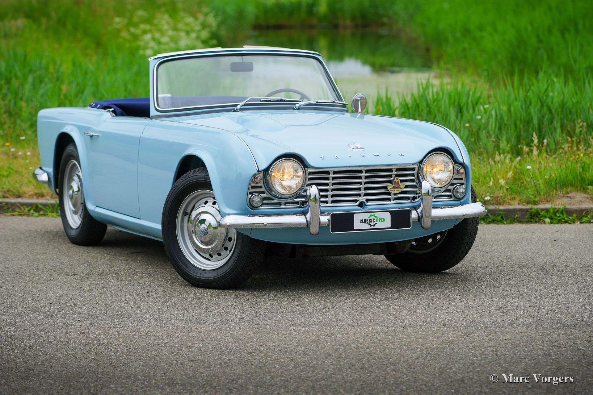 Triumph TR 4, Jahr 1963. Farbe Wedgwood Blue kombiniert mit einer dunkelblauen Lederausstattung getrimmt mit weißen Paspeln und blauem Teppich. Blaue Persenning und ein schwarzes Verdeck. Dieser wunderschöne Triumph TR 4 wurde vor zwanzig Jahren umfangreich restauriert, das Automobil ist in einem sehr guten und wunderschönen Zustand! Ein Fotobericht der Restaurierung ist vorhanden. Dieser TR 4 zeigt alle originalen Details der frühen Modelle, wie das wunderschöne Armaturenbrett aus weißem Metall, die Stahlräder mit verchromten Radkappen und das originale Lenkrad. Das Außendesign stammt vom italienischen Stardesigner Michelotti. Der TR 4 kombiniert den Charakter des echten britischen Sportwagens mit einem raffinierten italienischen Stil. Der kraftvolle Vierzylindermotor leistet 100 PS und läuft perfekt. Die Kraft wird über ein Vierganggetriebe, das mit einem Overdrive ausgestattet ist, auf die Hinterräder übertragen. Dies ist ein schwer zu findender früher TR 4 in einem sehr guten und schönen Zustand!