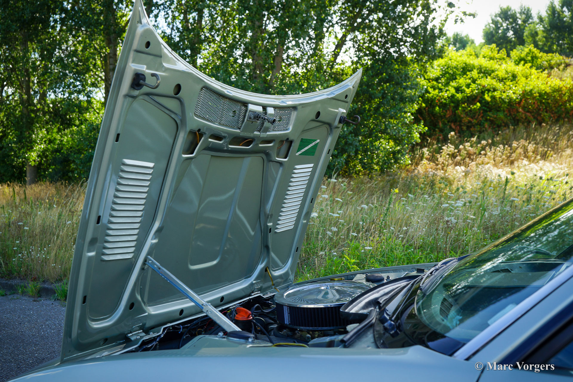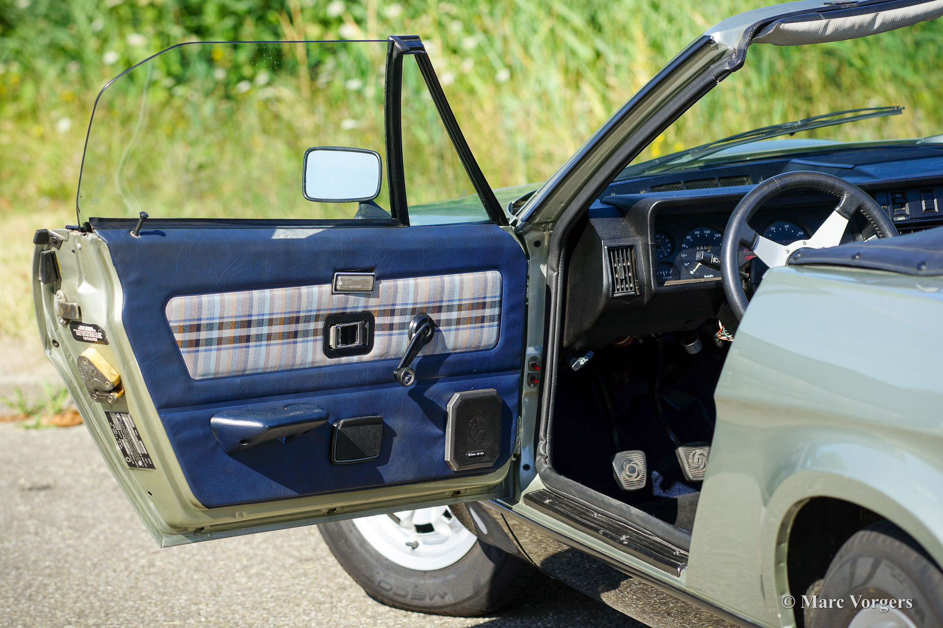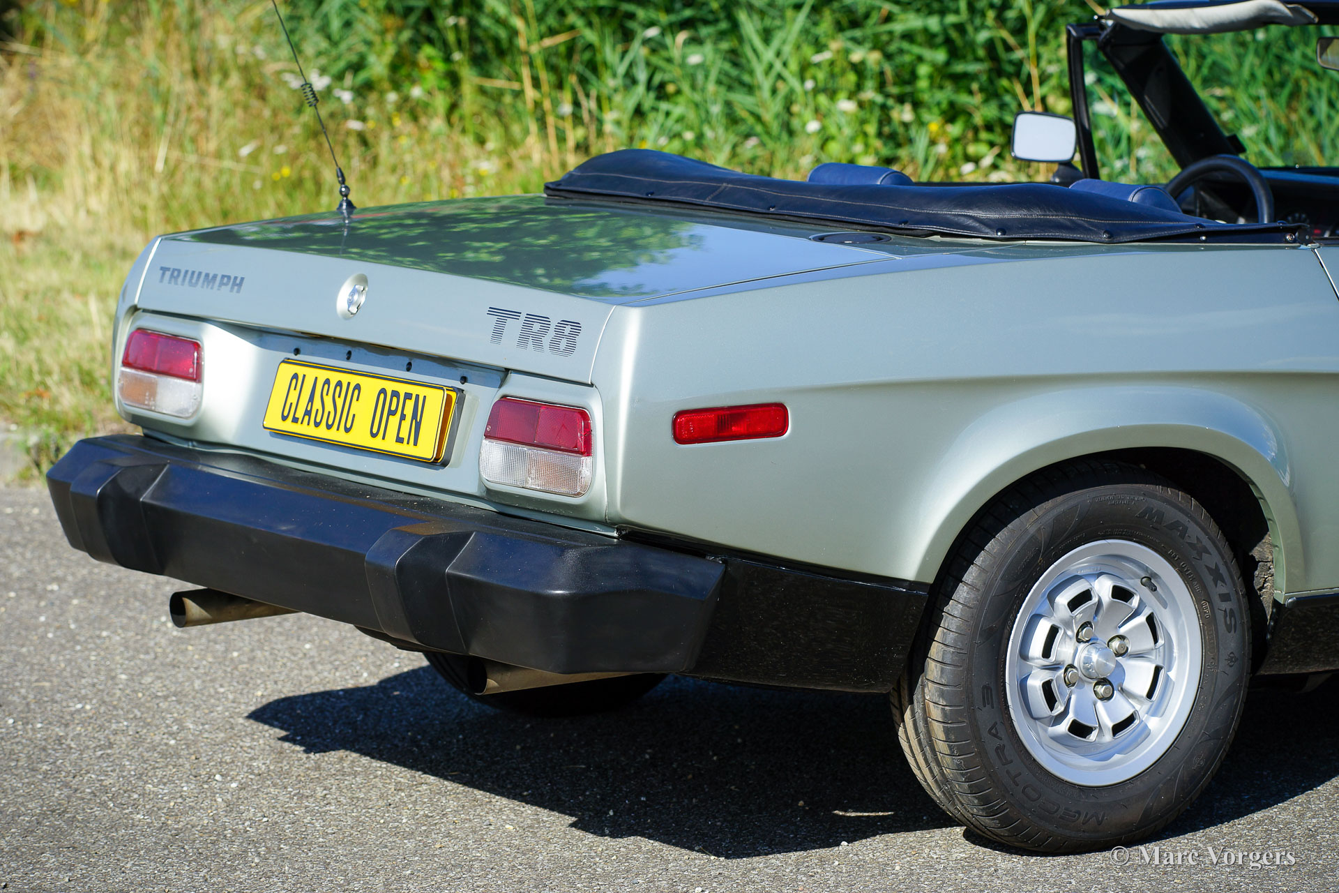 Triumph TR 8, Jahr 1980. Farbe ‘Cashmere Gold’ metallic (helles Grün) kombiniert mit einem blauen Kunstleder-Interieur und blauem Teppich. Die Mittelbahnen der Sitze und die Mitte der Türverkleidungen sind mit kariertem Stoff bezogen. Verdeck aus schwarzem Mohair, Verdeck Abdeckung aus schwarzem Vinyl. Dieser großartige Triumph TR 8 wurde in den USA neu verkauft, das Auto wurde 1989 in den Niederlanden zugelassen. Seit 1992 hatte das Auto drei Besitzer. Dieser Triumph TR 8 ist in einem sehr guten Zustand und das Auto fährt und klingt großartig. Die originale Innenausstattung ist wunderschön und der Motorraum ist wunderschön detailliert. Der 3,5-Liter-Rover-V8-Motor ist getunt und mit einem neuen Edelbrock-Vergaser ausgestattet. Der Wagen wurde auf einem Prüfstand eingestellt und eine Leistung von 225 PS ermittelt. Das Auto ist rundherum mit neuen Federn und Stoßdämpfern ausgestattet. Es wurde eine moderne elektronische Zündung sowie neue 185/70-13-Reifen eingebaut. Die originalen Alufelgen sind pulverbeschichtet. Dieser schicke Triumph TR 8 ist mit einem Fünfgang-Schaltgetriebe, einem Sportlenkrad, einem Philips-Radio und einer doppelten Auspuffanlage ausgestattet. Dies ist ein sehr schönes und gutes Exemplar!