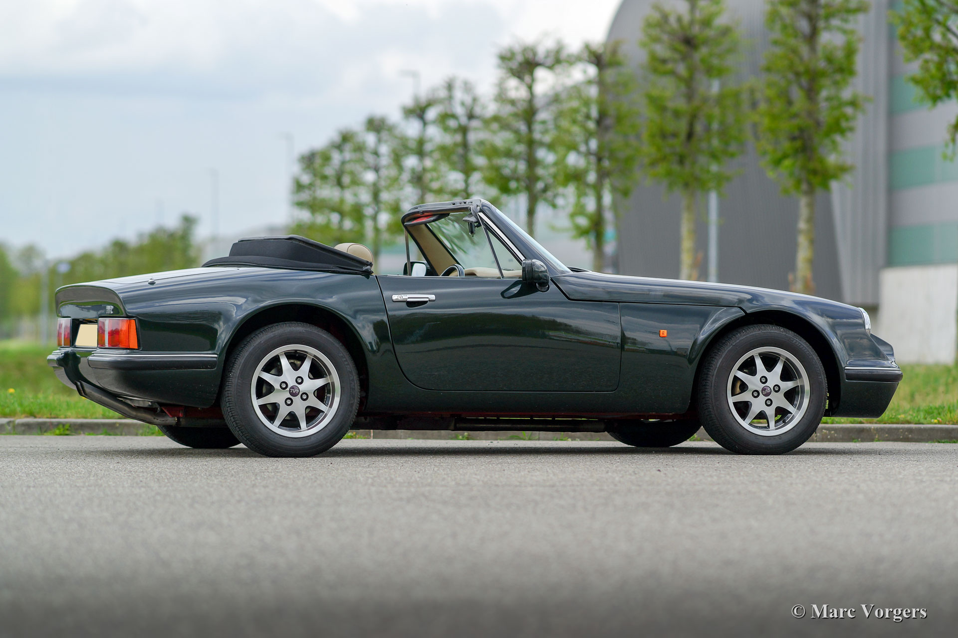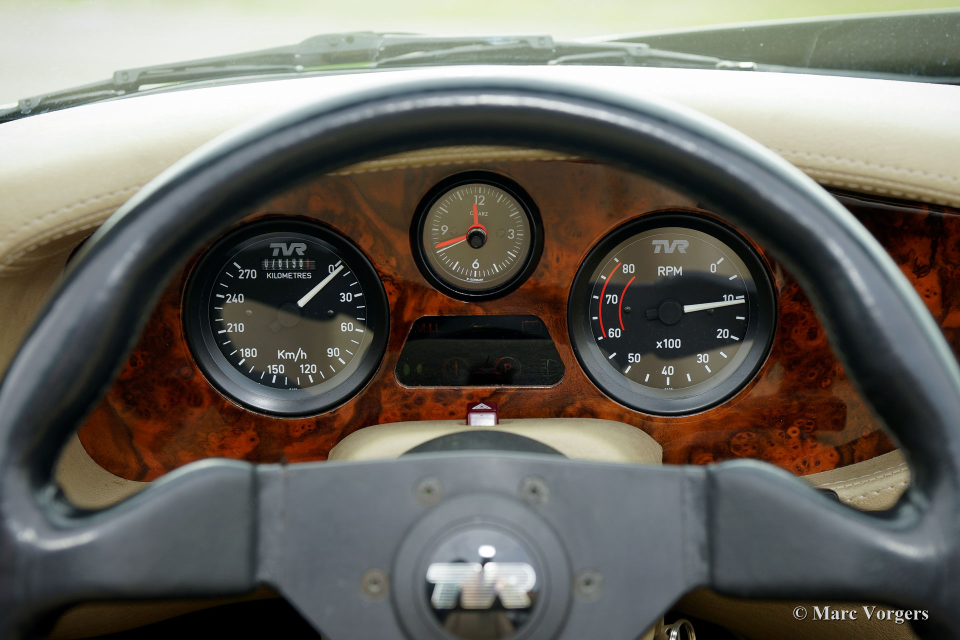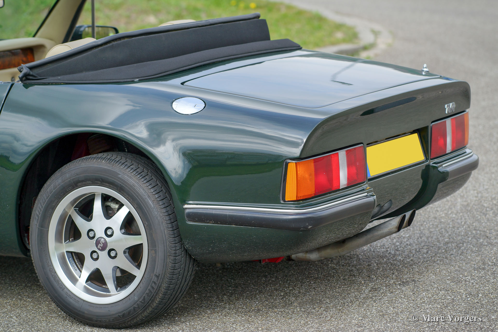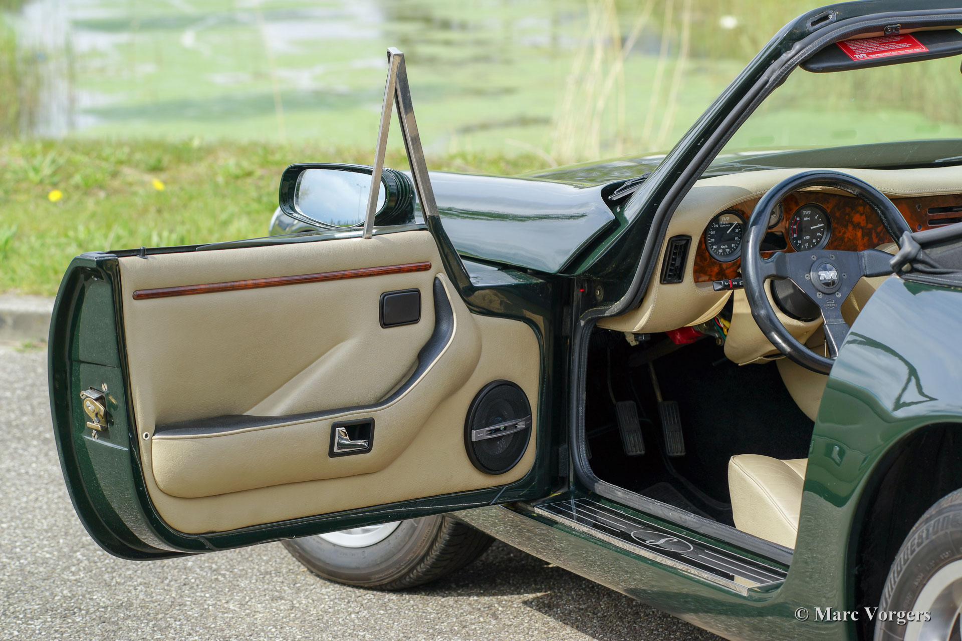 TVR S4C V6, Jahr 1994. Farbe British Racing Green kombiniert mit einem beigen Lederinterieur. Dies ist eine seltene TVR, es wurden nur 34 Fahrzeuge dieses Modells gebaut, von denen nur 4 Fahrzeuge mit Linkslenkung ausgestattet waren. Das Auto wurde in der Schweiz neu verkauft, im Jahr 2016 wurde das Auto in die Niederlande importiert. Von neuem ist das Auto nur 78.000 Kilometer gefahren und das Auto wurde von vier Eigentümern geschätzt. Dieser TVR S4C verfügt über einen 2,9-Liter-Ford-V6-Benzineinspritzmotor, der mit einem manuell betriebenen 5-Gang-Getriebe gekoppelt ist. Der S4C V6 verfügt über alle Spezifikationen des TVR V8 S mit Scheiben-Bremse rundum und die breite Karosserie. Die (Service) Historie ist vollständig bekannt und dokumentiert.