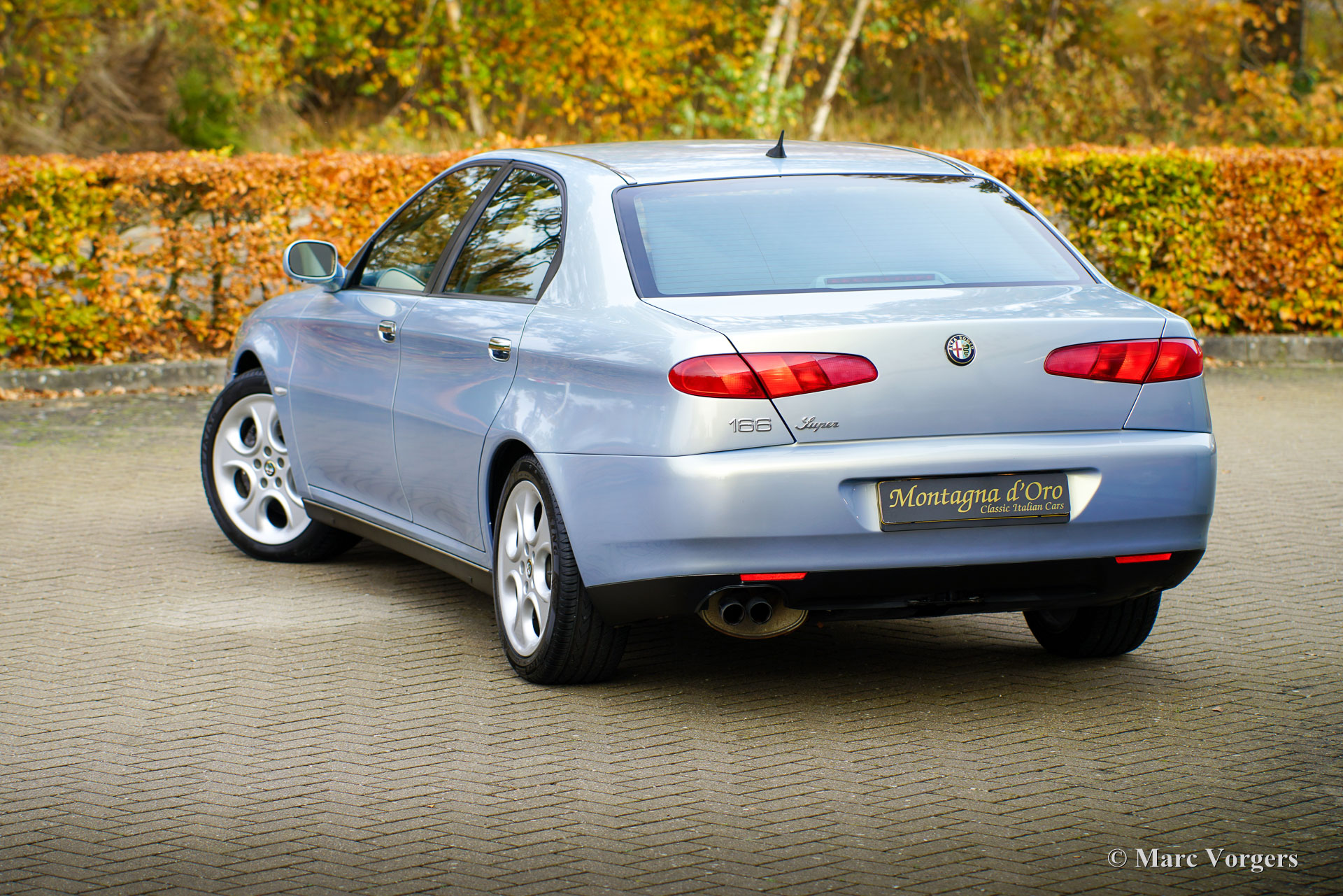 Alfa Romeo 166 Super 3.0 V6, Jahr 2000 (Erstzulassung 27. Januar 2000). Fahrgestellnummer: ZAR936000*00034571*, Motornummer: AR*34301*. Lackfarbe: Azzurro Nuvola 414B. Ein wunderschönes Silbermetallic mit Perlmutt-Effekt; der Lack schimmert je nach Lichteinfall hellgrün, hellblau oder violett. Der Innenraum ist mit schwarzem Leder, dunkelgrauem Teppich und schwarzen Fußmatten ausgestattet. Dieser prächtige Alfa Romeo 166 Super 3.0 V6 wurde in den Niederlanden ausgeliefert. Seitdem hat dieser hervorragend erhaltene Wagen nur 61.234 Kilometer zurückgelegt. Das Fahrzeug befindet sich in einem atemberaubenden und exzellenten Originalzustand! Es wurde über die Jahre hinweg lückenlos gewartet; die letzte Inspektion erfolgte im Mai 2024 bei 60.100 Kilometern. Dabei wurde auch der Zahnriemen erneuert. Der Alfa Romeo 166 basierte auf einer überarbeiteten Plattform mit verbessertem Fahrwerk und bot im Vergleich zum Vorgänger, dem 164, mehr Komfort und Stabilität. Zu den herausragendsten Varianten zählte der 3.0 V6 24V mit dem legendären Busso-Motor. Dieser Saugmotor leistete 226 PS und 275 Nm Drehmoment und ermöglichte eine Höchstgeschwindigkeit von 243 km/h. Mit etwas Geschick und dem Sechsganggetriebe beschleunigte er in unter 8 Sekunden von 0 auf 100 km/h. Dieses Topmodell verfügt über eine edle Lederausstattung, Leichtmetallfelgen, Klimaautomatik und das Alfa-eigene Integrated Control System mit Farbdisplay. Der zwischen 1998 und 2002 produzierte 3.0 V6 Super wurde zu einem Premiumpreis angeboten, was seine Position an der Spitze der Modellreihe widerspiegelte. Dieses hervorragend erhaltene Originalfahrzeug mit geringer Laufleistung dürfte Sammler und Liebhaber begeistern, die höchste Qualität suchen!