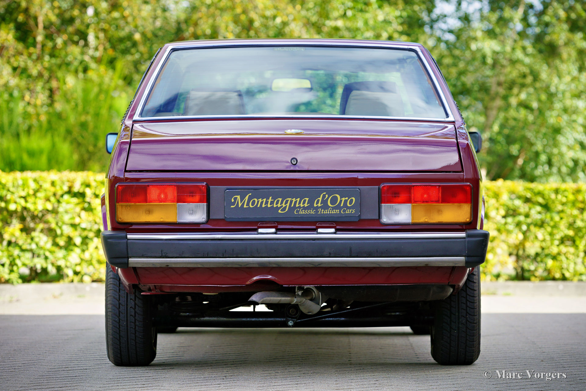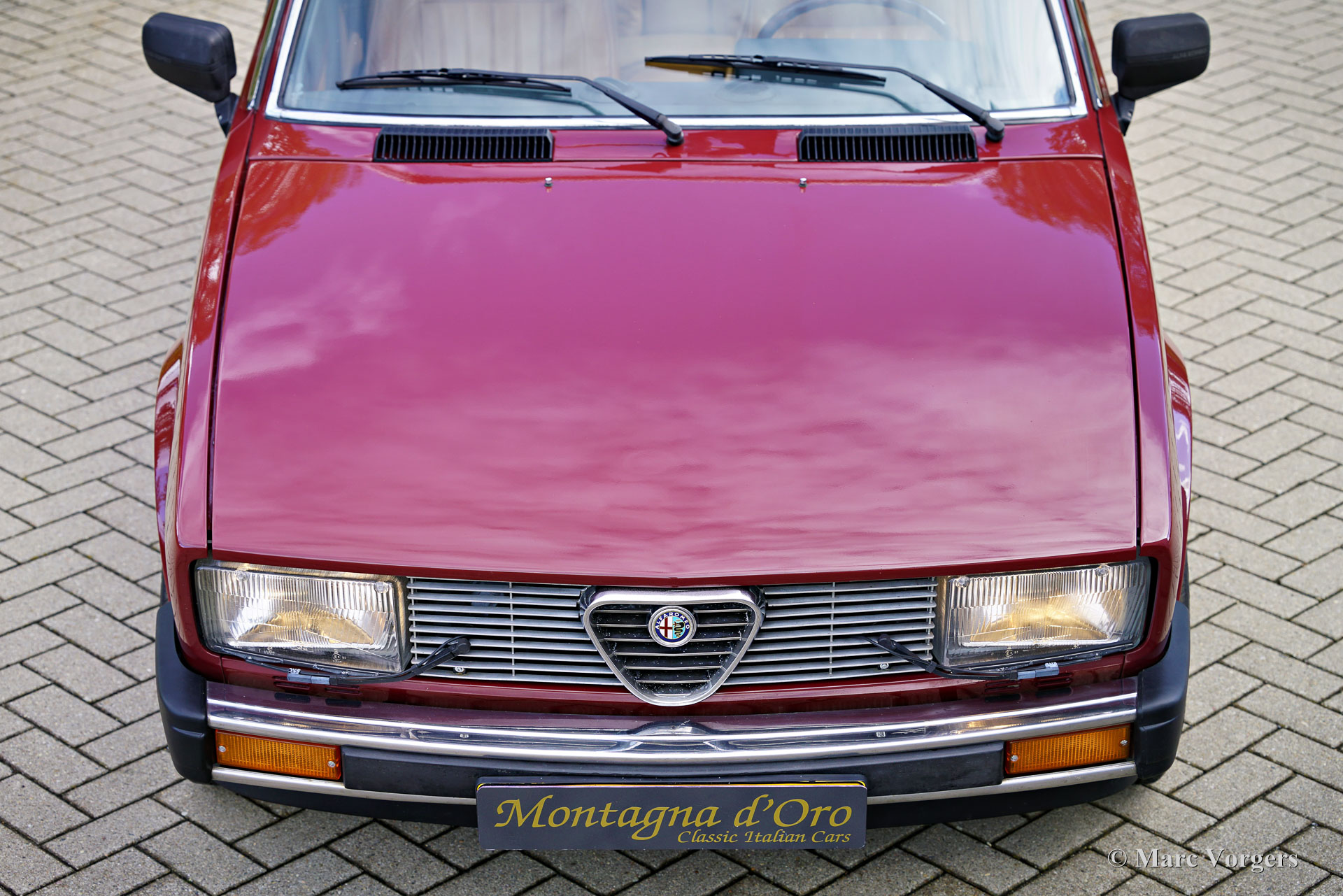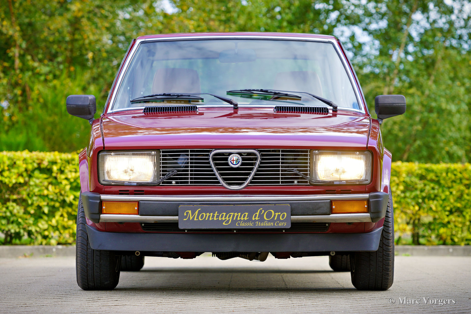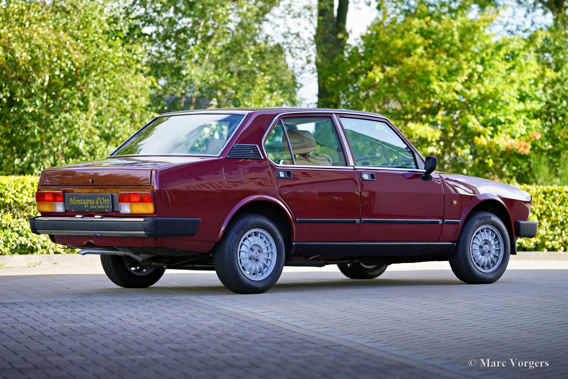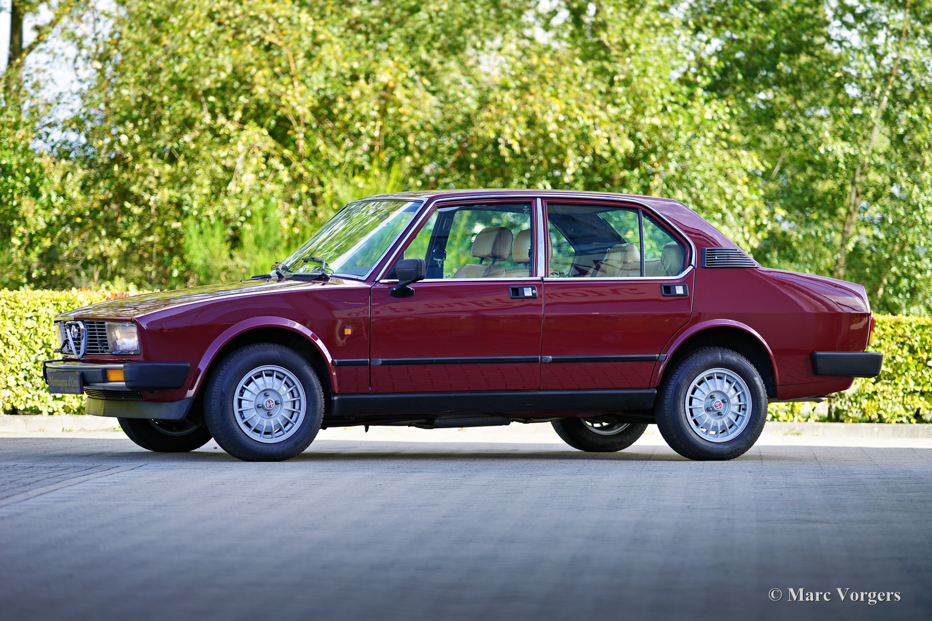 Alfa Romeo Alfetta 2000 „Trintignant“, Baujahr 1984. Farbe Dunkelrot (Rosso Veneziano AR 537) kombiniert mit hellbrauner Lederausstattung, hellbraunem Teppich und schwarzen Schutzmatten. Dieser Alfa Romeo Alfetta 2000 „Trintignant“ ist eine spezielle limitierte Auflage, von der nur 100 Fahrzeuge gebaut wurden. Dieses Auto hat die Nummer 073, wie auf einer Plakette auf der Mittelkonsole angegeben ist. Jean Louis Trintignant war ein französischer Schauspieler und Rallyefahrer. In den 1980er Jahren gab er einer Werbekampagne seinen Namen, die für seine Aussage „Alfa Romeo hat recht, manche Autos haben noch eine Seele“ berühmt wurde. Diese begehrte Alfetta wurde in den Jahren 2020-2021 professionell restauriert und das Auto ist in einem hervorragenden Zustand! Während der Restaurierung wurden die originalen Vordersitze und die Rückbank gegen Ledersitze aus einem Alfa Romeo 156 ausgetauscht. Der Tacho zeigt derzeit 32.778 Kilometer an. Die Alfa Romeo Alfetta ist eine der ausgewogensten und am besten zu fahrenden sportlichen 4-türigen Limousinen der 1970er und 1980er Jahre. Das Layout mit Frontmotor und Transaxle-Getriebe in der Nähe der Hinterachse sorgt dafür, dass die Alfetta eine nahezu ideale Gewichtsverteilung hat. Der Vollaluminiummotor mit zwei obenliegenden Nockenwellen, das Fünfganggetriebe und die De-Dion-Hinterachse vervollständigen den sportlichen Hintergrund der Alfetta. Diese limitierte Auflage „Trintignant“ ist ein ganz besonderes Exemplar in wunderbarem Zustand!