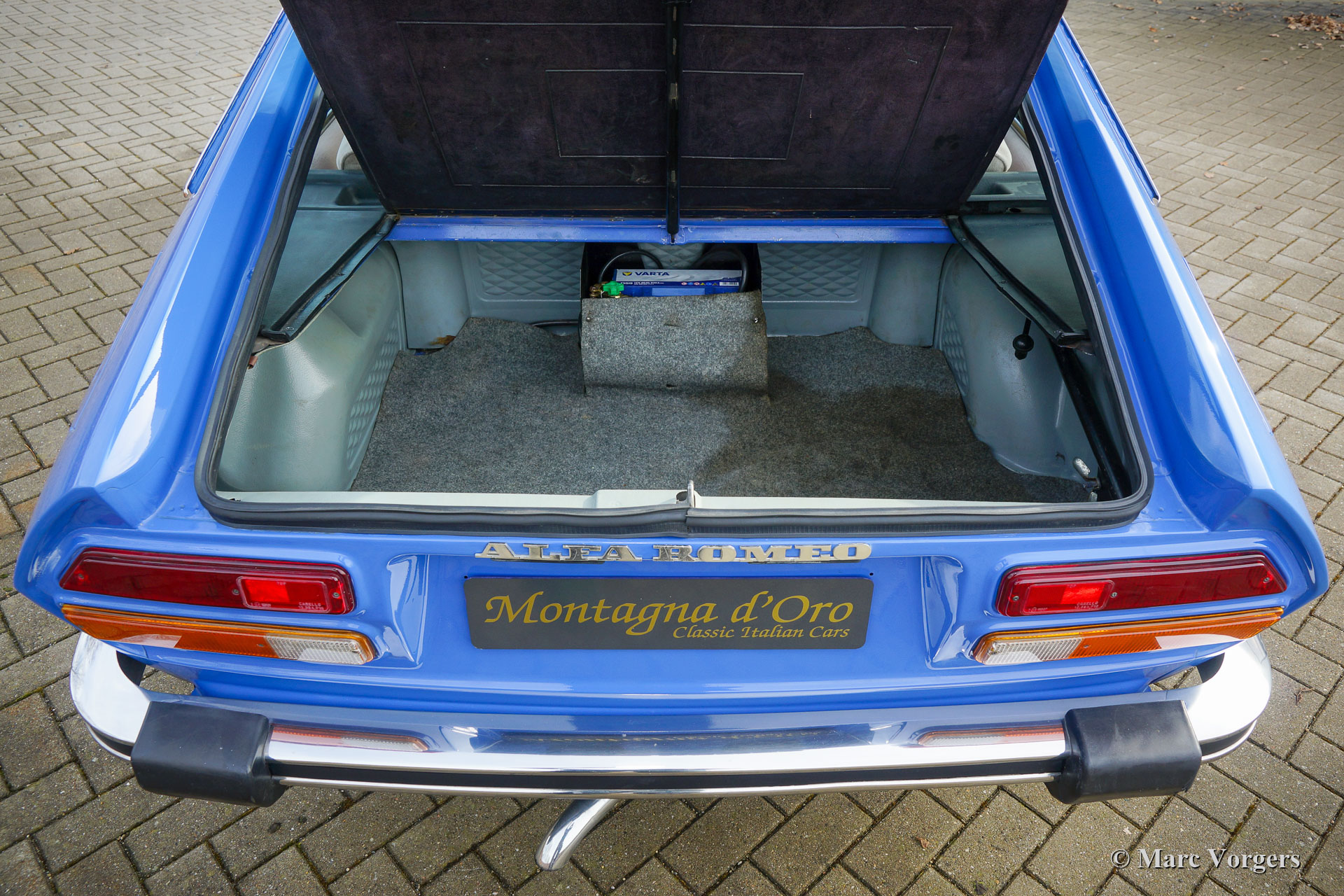 Alfa Romeo Alfetta GTV 2000, Jahr 1976. Fahrgestellnummer AR11636 * 000225X *, Motornummer AR01623 * 000212X *. Farbe blau (Azurro Le Mans AR 348) kombiniert mit einem hellbeigen Stoff Interieur und braunem Teppich. Dieser wunderschöne Alfa Romeo GTV 2000 wurde in Italien neu verkauft, der erste Besitzer war Pietro Gallettie aus Raguso. Unglaublich besonders ist die Tatsache, dass das Auto ab Werk mit einer Klimaanlage ausgestattet war. Wir haben das Auto kürzlich aus Italien importiert, das Auto hat noch ein italienisches Kennzeichen. Von Neu ist das Auto nur 71.290 Kilometer gefahren und es ist durchweg in einem außergewöhnlich guten und super originalen Zustand! Es sind nur minimale Gebrauchsspuren und Altersspuren festzustellen. Der Innenraum ist völlig original, der Teppich ist von der Sonne etwas verfärbt. Der Maschinenraum ist super sauber und zeigt alle Originaldetails. Die Karosserie bietet eine wunderbare Passform und eine sehr gute Lackierung. Die Unterseite ist sauber und trocken und zeigt einen guten Auspuff und frische Stoßdämpfer. Das Alfa Romeo wurde kürzlich in Italien vollständig gewartet und das Auto kommt gut dokumentiert. Das Serviceheft und die Original-Garantiekarte sind vorhanden. Dieser Alfa Romeo Alfetta GTV 2000 fährt sich perfekt. Der GTV 2000 war für viele ein Kindheitstraum. Dieses wundervolle Beispiel ist eine echte Zeitreisemaschine, die die tief empfundene Leidenschaft des Autos der 1970er Jahre zurückbringen wird!
