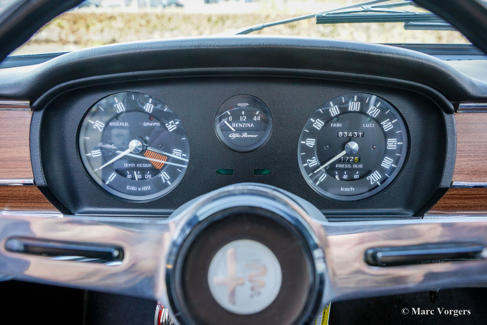 Alfa Romeo Giulia 1300 TI, Baujahr 1969. Fahrgestellnummer AR10539*1070104*, Motornummer AR00539*62659*. Karosseriefarbe Dunkelgrau (Antracite Inglese AR 736) kombiniert mit schwarzer Kunstlederausstattung und anthrazitfarbenem (dunkelgrauem) Teppich. Dieser wunderschöne Alfa Romeo Giulia befindet sich in einem sehr schönen und sehr guten Originalzustand. Die Karosserie wurde in der Vergangenheit in der Originalfarbe neu lackiert. Der Innenraum ist vollständig original und in sehr gutem Zustand mit nur geringen Gebrauchsspuren. Die schwarzen Türverkleidungen, die am unteren Rand leichte Abnutzungsspuren aufweisen, werden durch einwandfreie Exemplare ersetzt. Montagna d’Oro verkaufte dieses Schmuckstück vor neun Jahren (Februar 2017), und das Fahrzeug wurde nun in Zahlung gegeben. Der Kilometerzähler zeigt aktuell 83.434 Kilometer an, und dieser feine Alfa Romeo verfügt über eine lückenlose jährliche Servicehistorie. Ende der 1960er-Jahre war der Alfa Romeo Giulia eine geräumige und äußerst begehrte Sportlimousine mit servounterstützten Scheibenbremsen, einem Vierzylinder-Aluminiummotor mit zwei obenliegenden Nockenwellen, einem 5-Gang-Getriebe und allen Instrumenten, die sich ein sportlicher Fahrer wünschte. Dieses sehr originale, technisch sehr gute, und optisch hervorragende Exemplar ist ausgestattet mit zeitgenössischen (seltene) SEV Marchal 662 Halogen Scheinwerfern, wunderschönen Cromodora-Leichtmetallfelgen und K&N-Sportluftfiltern an den Weber-Doppelvergasern!