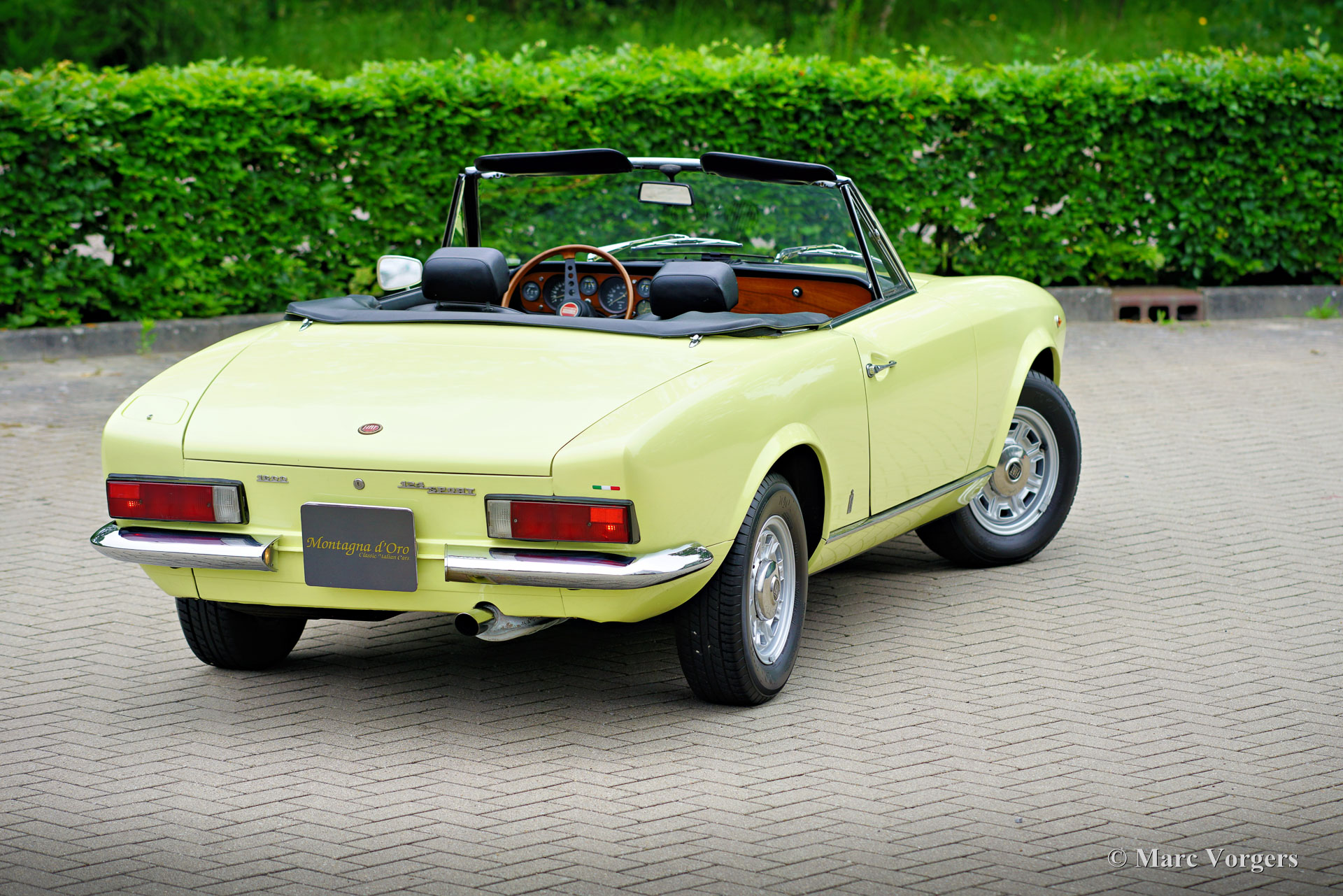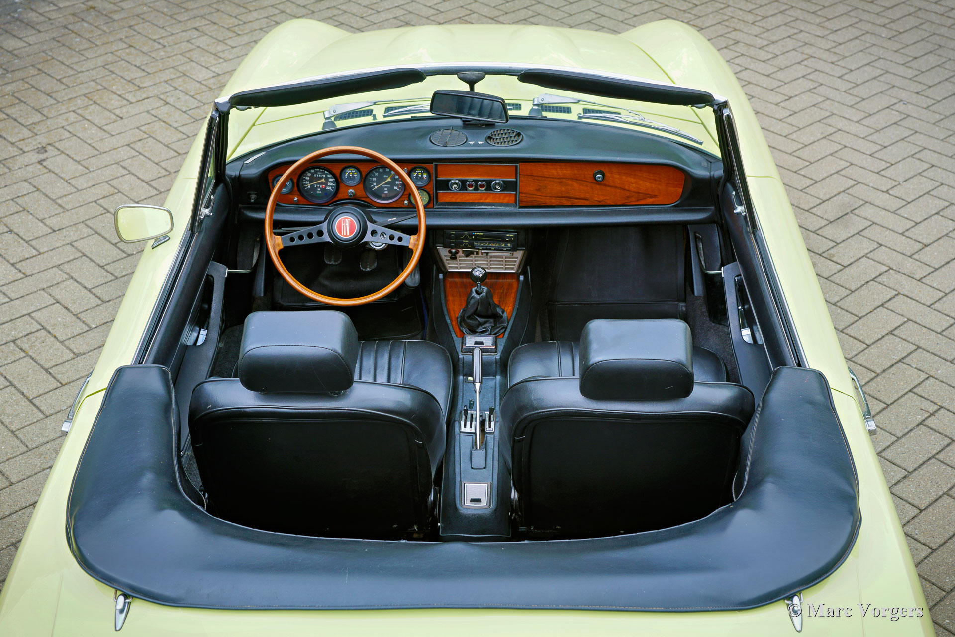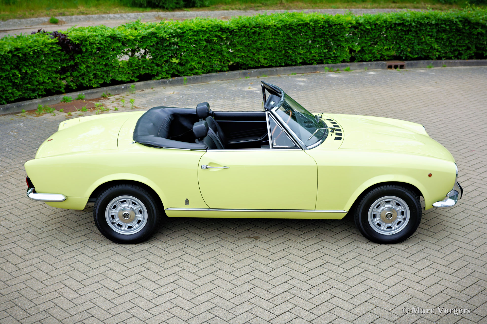 Fiat 124 Sport Spider 1600 (BS1), Jahr 1972. Farbe Gelb (Colorado Yellow 241) kombiniert mit einer schwarzen Kunstlederinnenausstattung mit anthrazitfarbenem Teppich. Das Verdeck ist aus schwarzem Mohair Stoff, die Verdeck Abdeckung ist aus schwarzem Vinyl. Dieser wunderschöne Fiat 124 Sport Spider wurde neu in den USA verkauft und im Juni 1993 in die Niederlande importiert. Die vollständige amerikanische Historie inklusive Wartungsrechnungen ist bis 1992 vorhanden. Nach der Ankunft in den Niederlanden wurde der Fiat auf europäische Spezifikationen umgebaut, unter anderem mit Chromstoßstangen, europäischen Scheinwerfer und einer Tachoanzeige in km/h statt Meilen. Die Rechnungen für den Umbau und einige andere Arbeiten belaufen sich auf 17.000 niederländische Gulden (heute 15.500 € nach indexierter Berechnung). Spätere Wartungsrechnungen sind ebenfalls vorhanden, wir haben selten ein so gut dokumentiertes Auto gesehen! Dieser Fiat 124 Sport Spider ist in einem sehr guten bis ausgezeichneten Zustand und das Auto fährt perfekt. Das Auto verfügt über einen 1592-cm³-Vierzylindermotor mit zwei obenliegenden Nockenwellen und einer Leistungsabgabe von 108 DIN-PS. Mit einem Fünfganggetriebe, einem Gewicht von knapp 1000 kg und einer Höchstgeschwindigkeit von 185 km/h wird sich der Fiat 124 Sport Spider bequem in den modernen Verkehr einmischen. Die großartig aussehende Karosserieform wurde von Pininfarina gezeichnet. Der Innenraum zeigt den Übergang in die 1970er Jahre mit einem der letzten holzfurnierten Armaturenbretter und sportlicher „geschwärzter“ Chromverkleidung (Instrumentenblenden und Lenkradmitte in Mattschwarz), um (Sonnen) Blendung zu vermeiden. Dies war eine neue Erkenntnis, die von Rallye- und Rennwagen übernommen wurde. Dieser wunderschöne Fiat 124 Sport Spider sieht in diesen Farben und mit den originalen Leichtmetallrädern wie ein Bild aus.