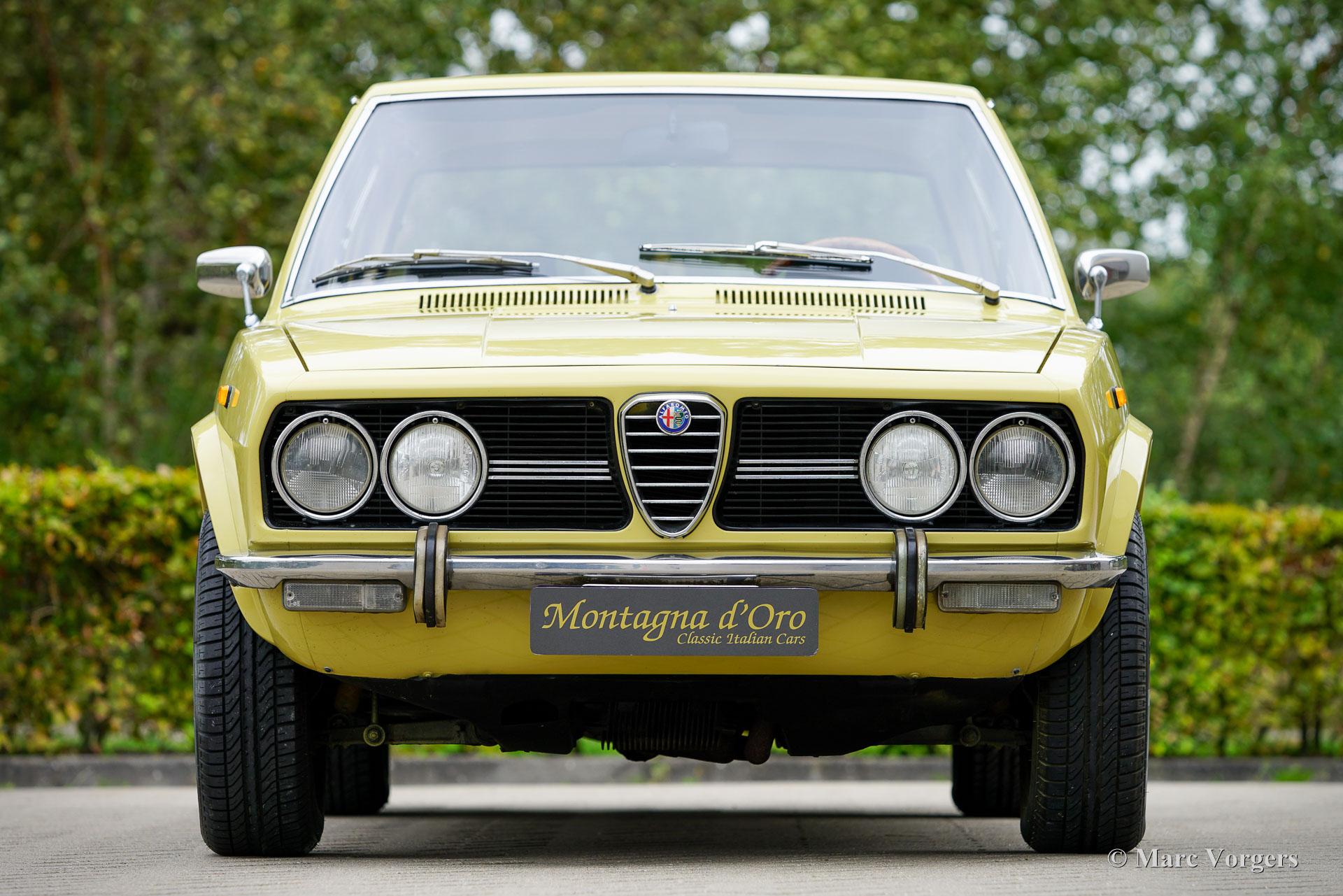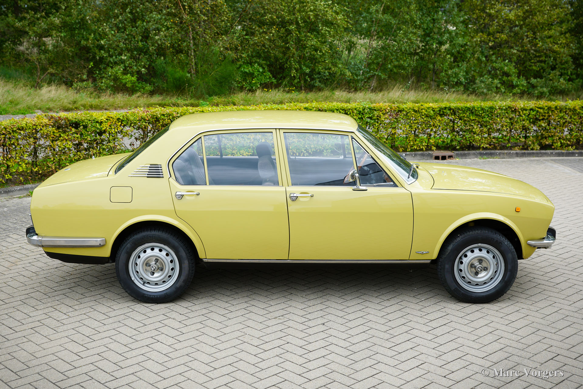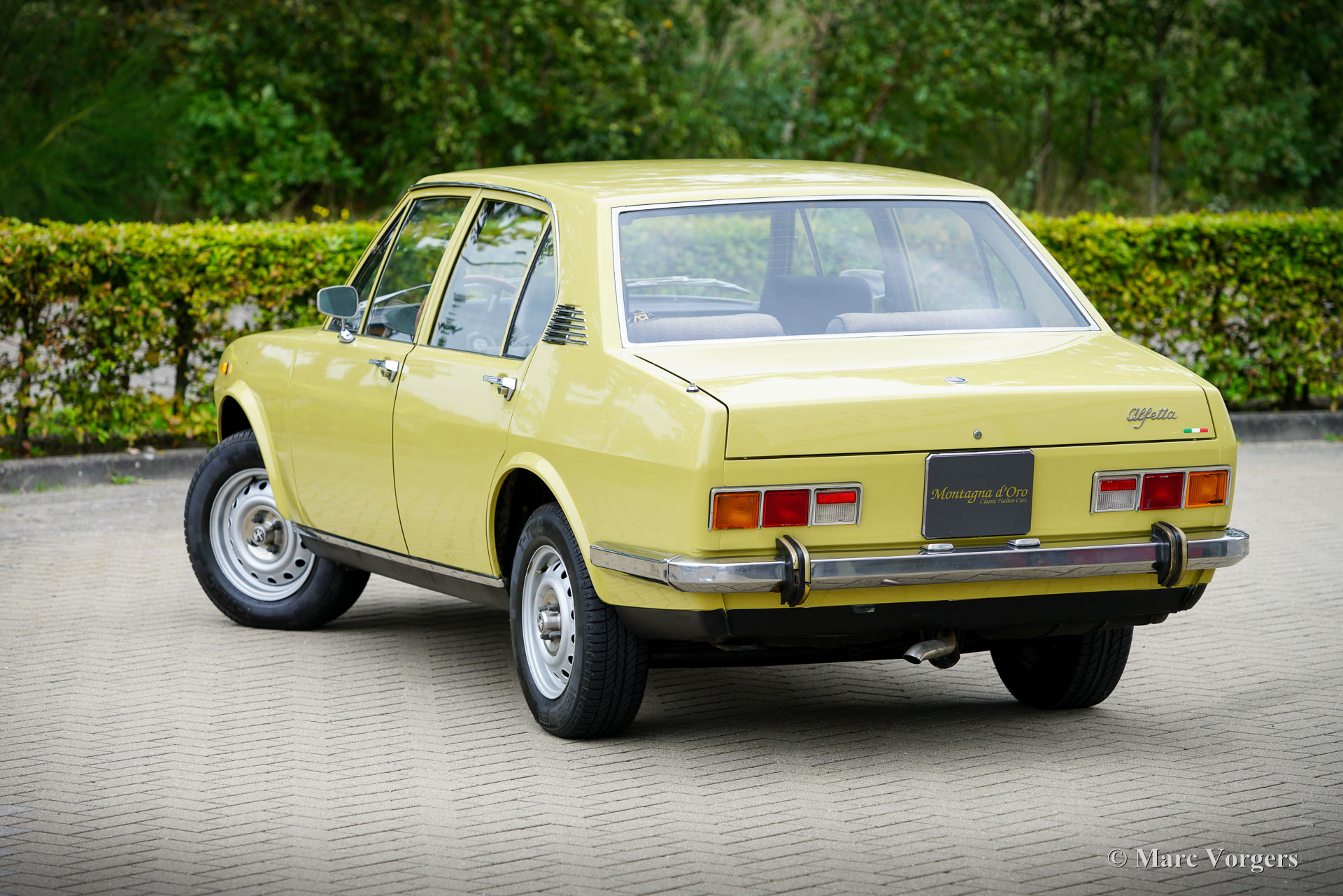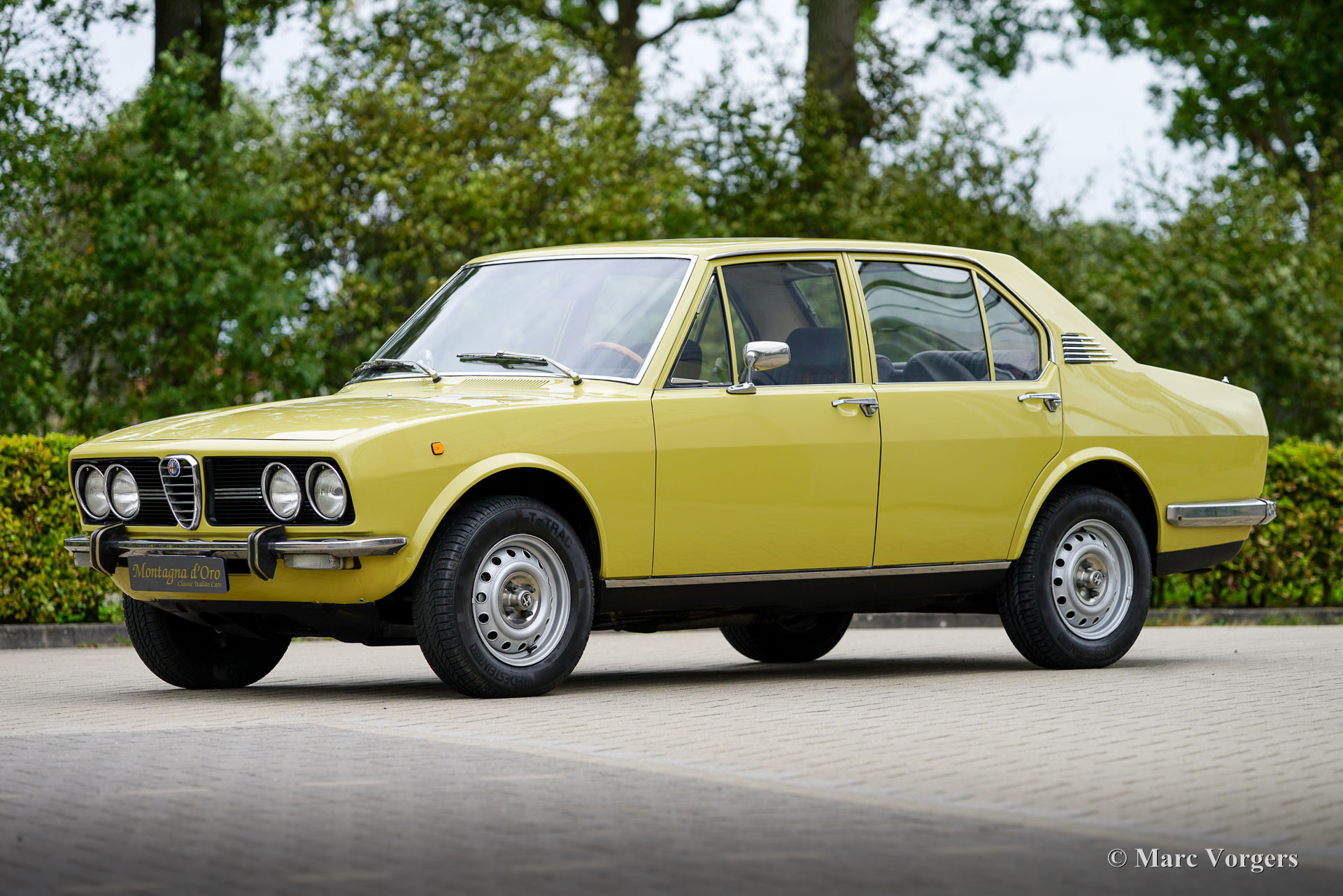 Alfa Romeo Alfetta 1800, Jahr 1972. Farbe blassgelb (Giallo Piper, AR-Farbcode AR116) kombiniert mit einer blauen Stoffausstattung. Diese prächtige Alfetta 1800 wurde neu in Italien verkauft, das Auto wurde im Dezember 2001 in die Niederlande importiert. Der Tachostand beträgt derzeit 65,679 Kilometer. Die Alfettas aus den frühen 1970er Jahren sind in unserer Zeit ein seltener Anblick. Dieses schöne Exemplar ist in einem sehr guten Zustand. Die solide Karosserie wurde in der Vergangenheit in der Originalfarbe neu lackiert. Das Auto wurde im Laufe der Jahre gut gewartet und gepflegt; Service- und Reparaturrechnungen liegen vor. Der Alfa Romeo Alfetta wurde 1972 vorgestellt. Es war die erste mittelgroße Alfa Romeo-Limousine seit zehn Jahren. Alfa Romeo führte beim Alfetta das neue hinten montierte „Transaxle“-Getriebe / Achsantrieb ein, dass eine nahezu perfekte Gewichtsverteilung von 50/50 ermöglichte. Zusammen mit der Einzelradaufhängung, dem sportlichen und leistungsstarken Aluminium-Twin-Cam-Motor, den Scheibenbremsen an allen vier Rädern und dem Fünfganggetriebe war der Alfetta eine echte Sportlimousine! Dieses schöne Exemplar vermittelt das von den Designern beabsichtigte Fahrerlebnis, eine wunderbare Mischung aus Komfort und Sportlichkeit. Der Motorsound ist Musik in den Ohren des Enthusiasten. Das Auto wird gut dokumentiert und komplett mit zwei Originalschlüsselsätzen geliefert.