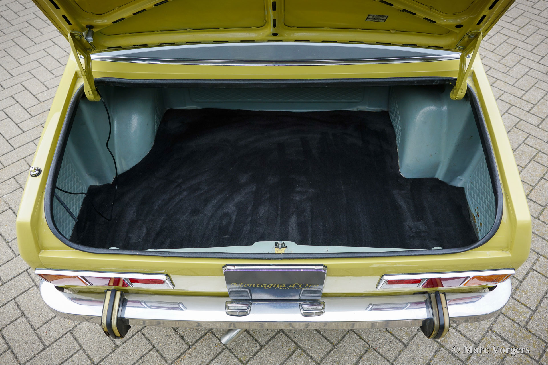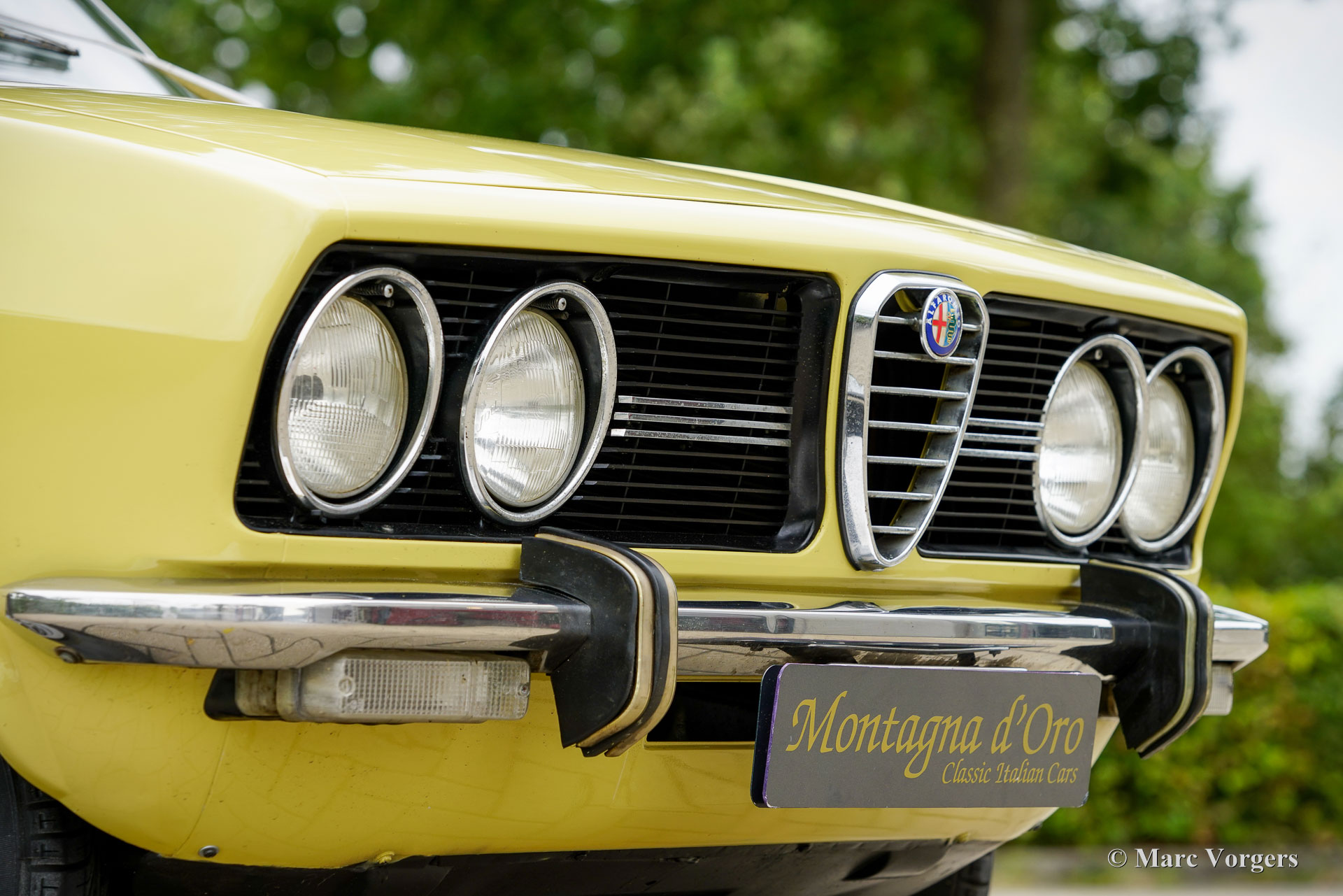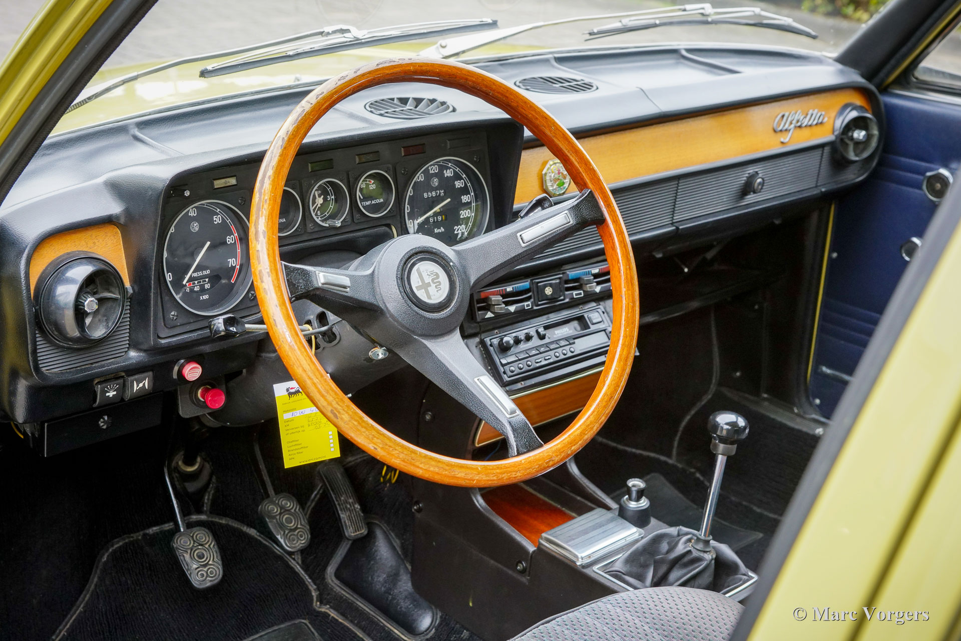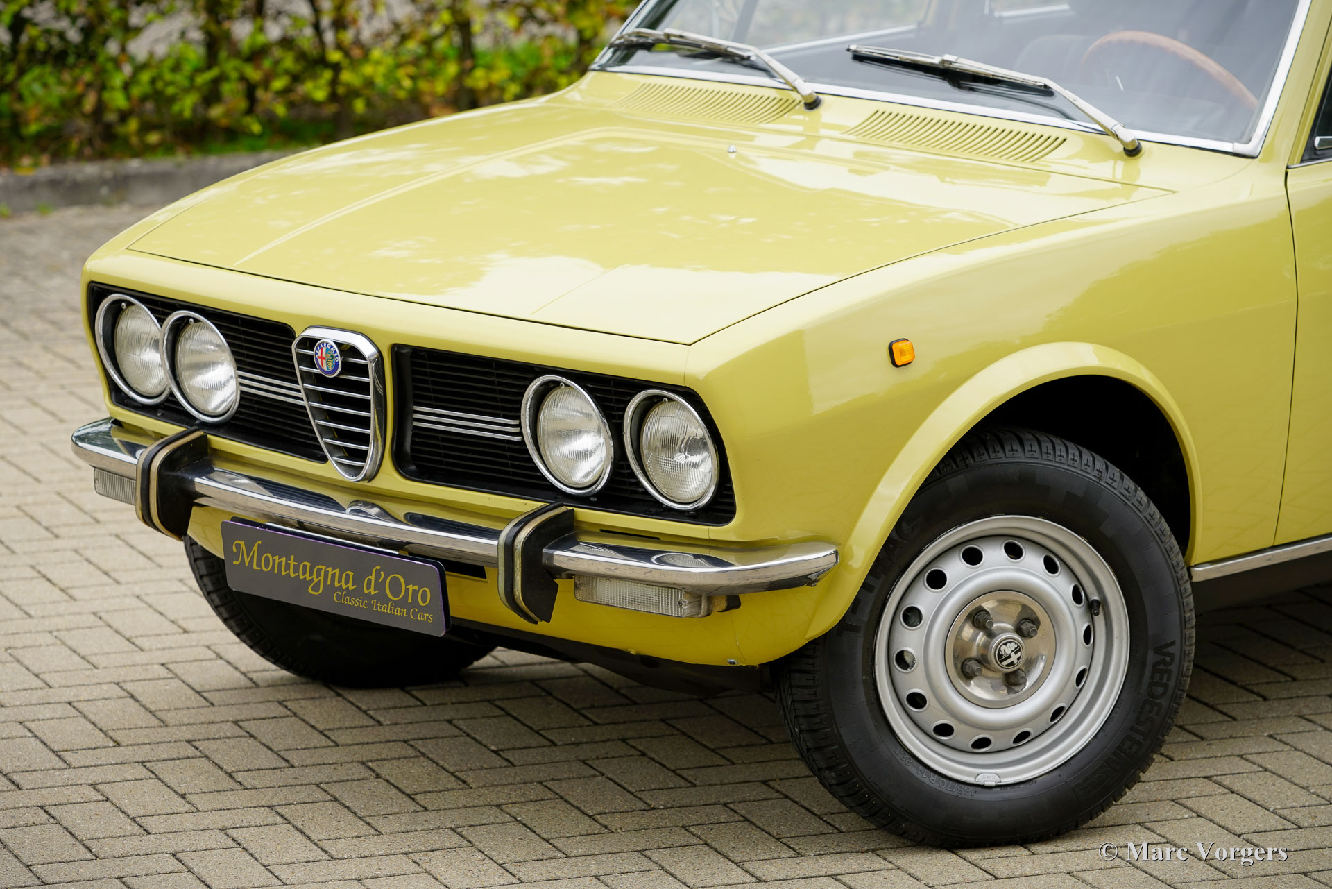 Alfa Romeo Alfetta 1800, Jahr 1972. Farbe blassgelb (Giallo Piper, AR-Farbcode AR116) kombiniert mit einer blauen Stoffausstattung. Diese prächtige Alfetta 1800 wurde neu in Italien verkauft, das Auto wurde im Dezember 2001 in die Niederlande importiert. Der Tachostand beträgt derzeit 65,679 Kilometer. Die Alfettas aus den frühen 1970er Jahren sind in unserer Zeit ein seltener Anblick. Dieses schöne Exemplar ist in einem sehr guten Zustand. Die solide Karosserie wurde in der Vergangenheit in der Originalfarbe neu lackiert. Das Auto wurde im Laufe der Jahre gut gewartet und gepflegt; Service- und Reparaturrechnungen liegen vor. Der Alfa Romeo Alfetta wurde 1972 vorgestellt. Es war die erste mittelgroße Alfa Romeo-Limousine seit zehn Jahren. Alfa Romeo führte beim Alfetta das neue hinten montierte „Transaxle“-Getriebe / Achsantrieb ein, dass eine nahezu perfekte Gewichtsverteilung von 50/50 ermöglichte. Zusammen mit der Einzelradaufhängung, dem sportlichen und leistungsstarken Aluminium-Twin-Cam-Motor, den Scheibenbremsen an allen vier Rädern und dem Fünfganggetriebe war der Alfetta eine echte Sportlimousine! Dieses schöne Exemplar vermittelt das von den Designern beabsichtigte Fahrerlebnis, eine wunderbare Mischung aus Komfort und Sportlichkeit. Der Motorsound ist Musik in den Ohren des Enthusiasten. Das Auto wird gut dokumentiert und komplett mit zwei Originalschlüsselsätzen geliefert.