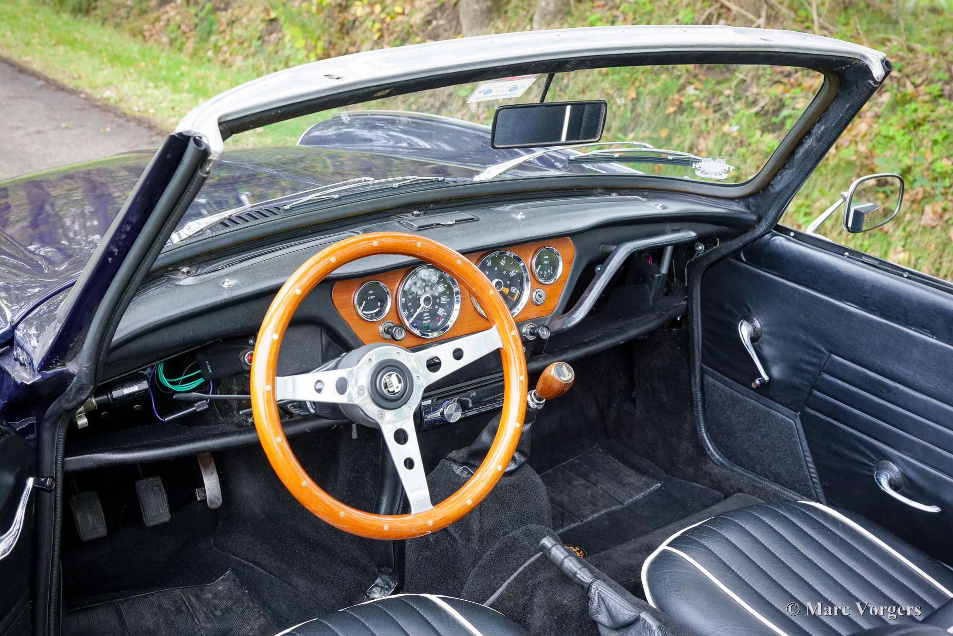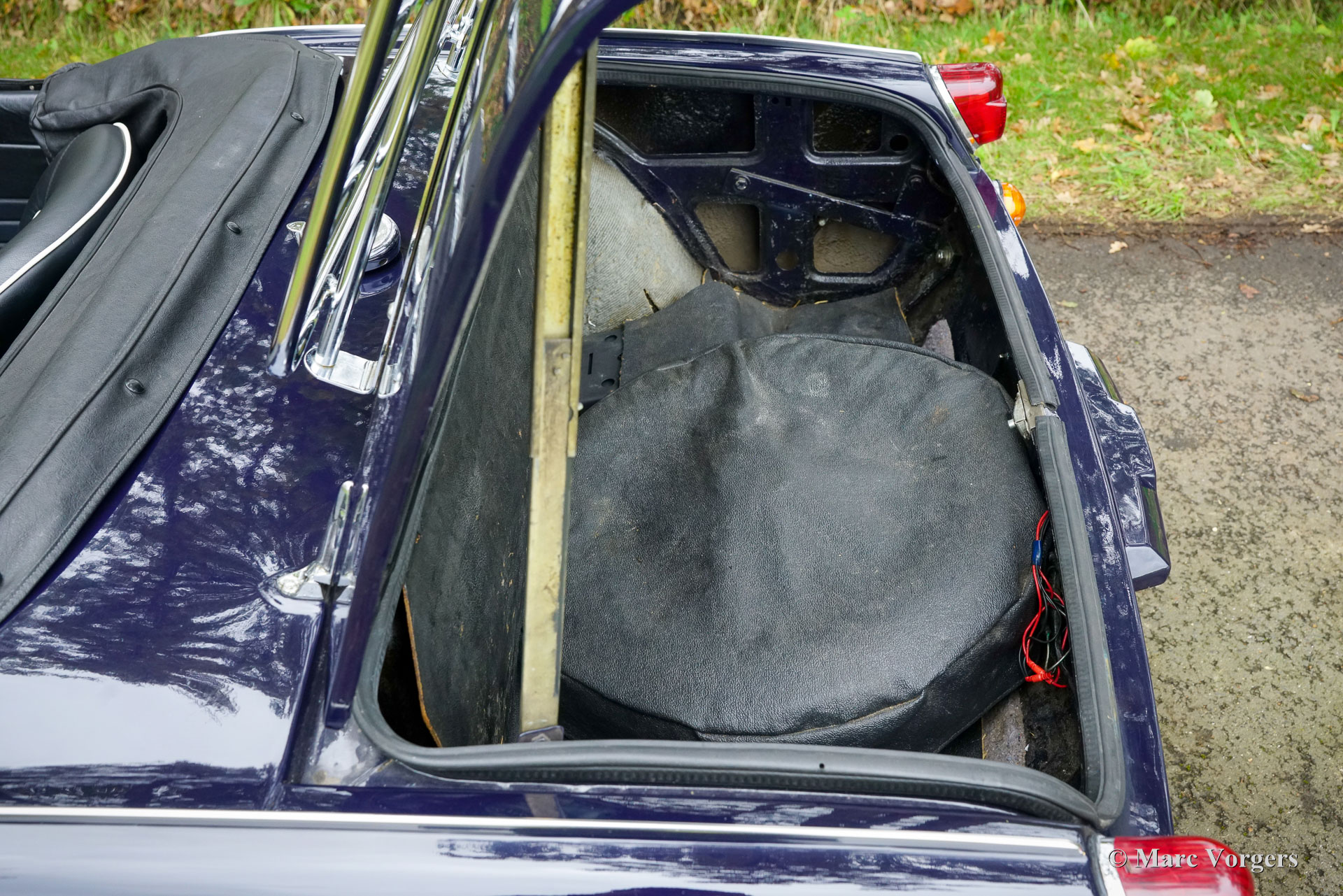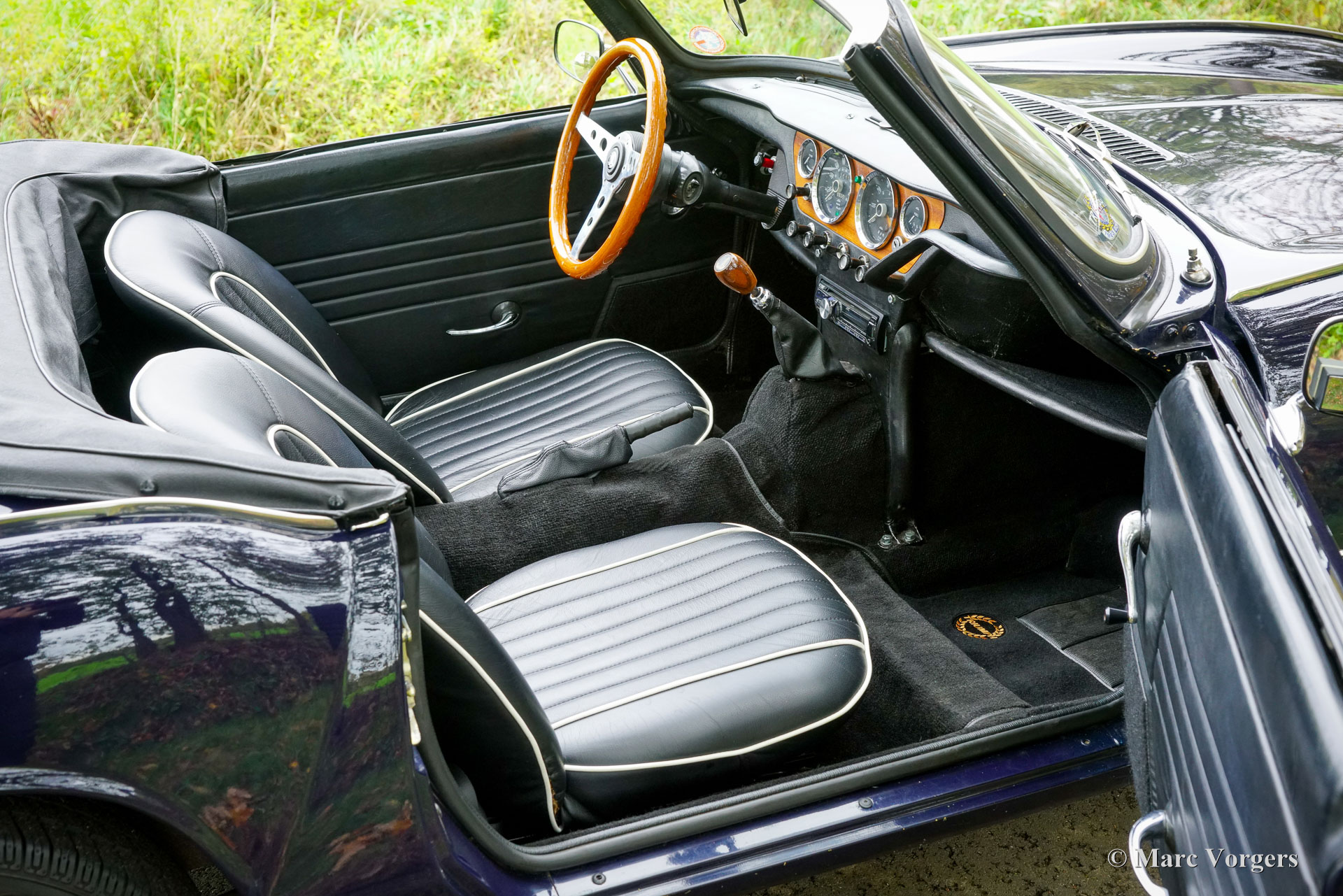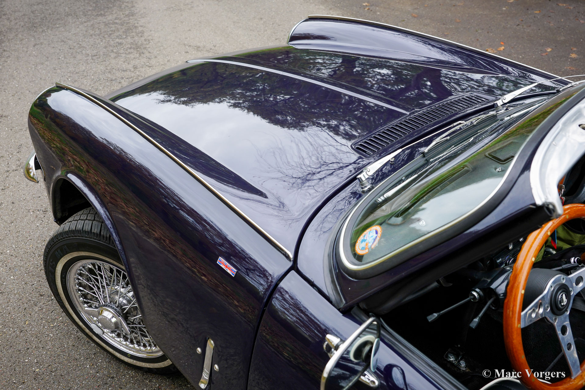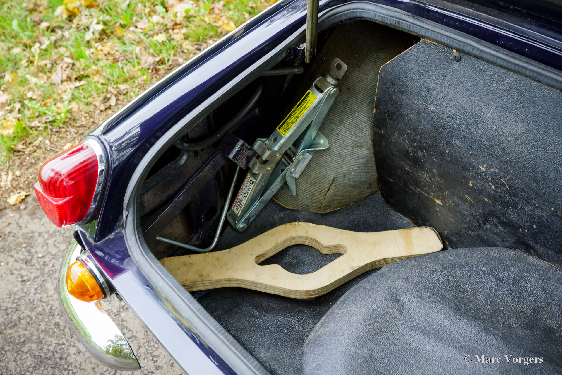 Triumph Spitfire MK 3, Baujahr 1971. Fahrgestellnummer: 1FD83020L. Karosseriefarbe: Dunkelblau (Royal Blue), Innenausstattung: Schwarzes Kunstleder mit schwarzem Teppich. Schwarzes Vinyl-Verdeck, Verdeck Abdeckung und Persenning. Dieser wunderschöne Triumph Spitfire wurde in Großbritannien neu verkauft und am 30. Juni 1971 zugelassen. 1984 wurde er in die Niederlande importiert. Der jetzige Besitzer genießt diesen Wagen seit 2023 auf vielen Sommerausflügen in den Niederlanden, Luxemburg und bei der Square Mountain Rally. Der Triumph Spitfire ist ein Meisterwerk des italienischen Designers Michelotti, der für die markanten Formen vieler Triumph-Klassiker verantwortlich war. Basierend auf einem leicht modifizierten Triumph Herald-Chassis und -Antriebsstrang ist der Spitfire einfach und kostengünstig zu warten. Nach dem Öffnen der großen Motorhaube sind Motor und Vorderrad Aufhängung leicht zugänglich. Der 1296 cm³ große Vierzylinder-Reihenmotor leistet 68 PS und ist mit einem 4-Gang-Schaltgetriebe gekoppelt, das die Kraft auf die Hinterräder überträgt. Mit einem Gewicht von nur 715 Kilogramm bietet der kompakte Spitfire MK 3 ein sportlich/ agiles Fahrverhalten und ein großartiges Open-Air-Erlebnis. Dieses wunderschöne Exemplar in Royal Blue befindet sich in einem guten bis sehr guten Zustand und wurde kürzlich in unserer Werkstatt umfassend gewartet. Zur Ausstattung gehören Overdrive, Chromspeichenräder, verchromte Radmuttern mit Zentralverschluss, ein verchromter Gepäckträger, ein Sportlenkrad mit Holzkranz, Servobremsen, ein kleines Staufach für Wertsachen im Heck, ein Wagenheber, ein Radmutternschlüssel aus Holz sowie ein modernes JVC KD-452 Stereo-Radio mit CD-Player, Aux-Eingang und Antenne am rechten Kotflügel. Zum Fahrzeug gehören außerdem zusätzliche Ersatzteile, Räder und Reifen. Rechnungen der kürzlich durchgeführten Wartungsarbeiten sind vorhanden. Dieser Triumph Spitfire ist ein Oldtimer mit einem hervorragenden Preis-Leistungs-Verhältnis. Er wird seinem neuen Besitzer viel Fahrspaß und zahlreiche neue Freunde in den aktiven nationalen und regionalen Triumph Spitfire Clubs bescheren!