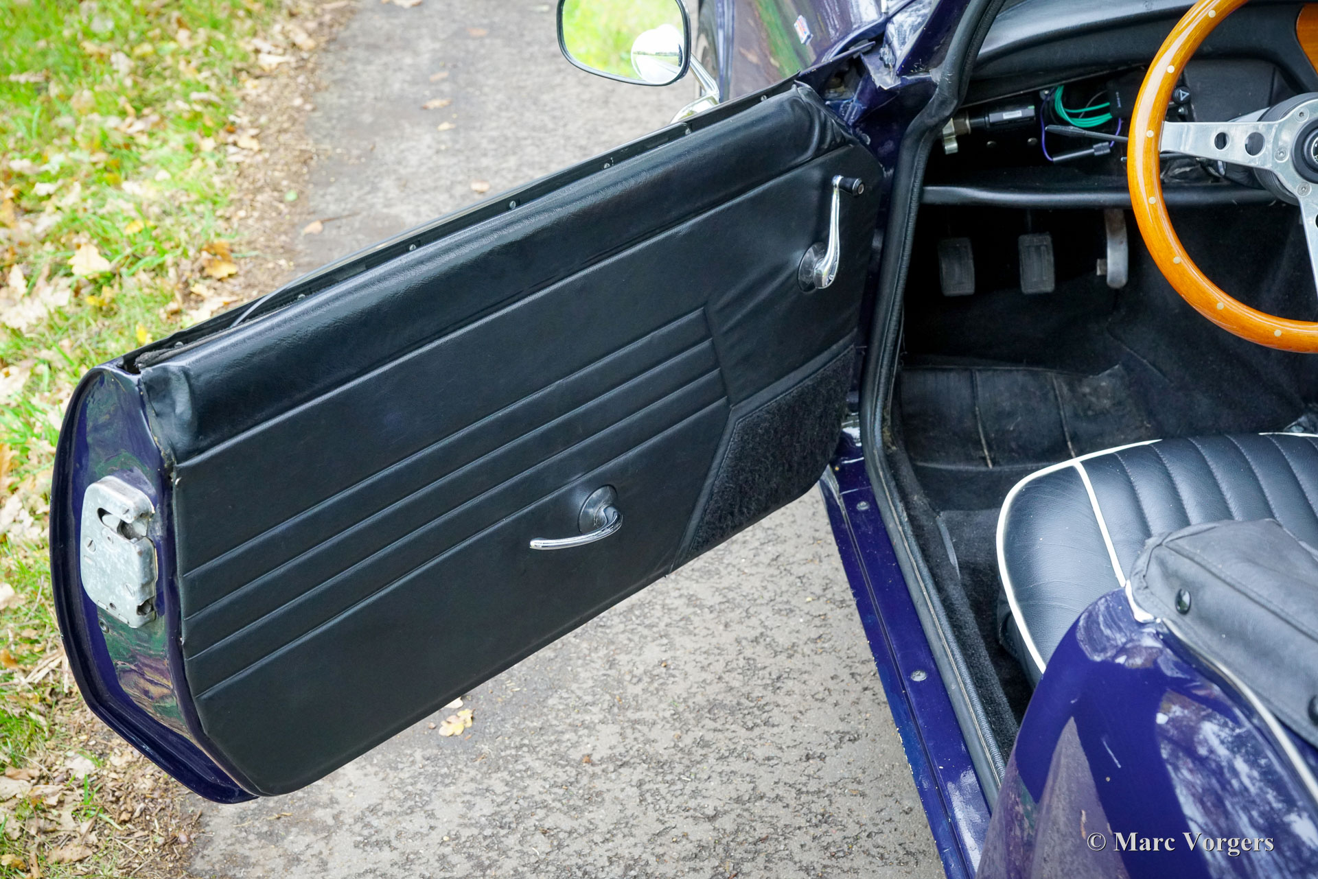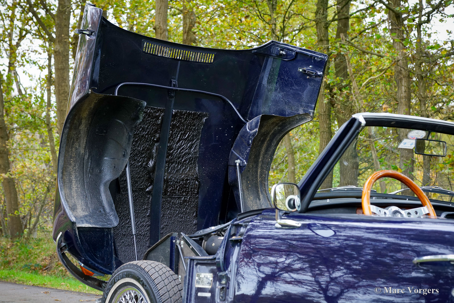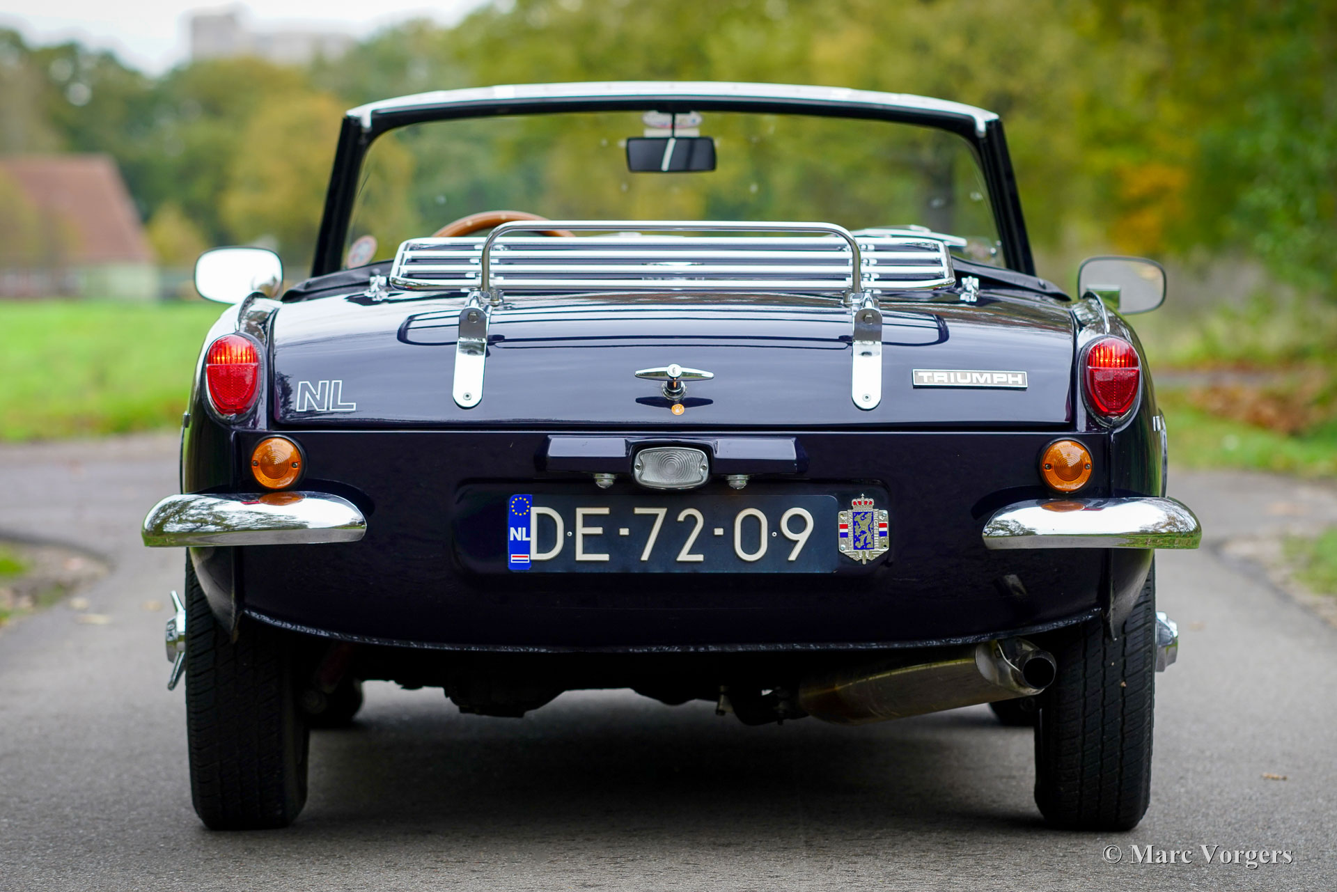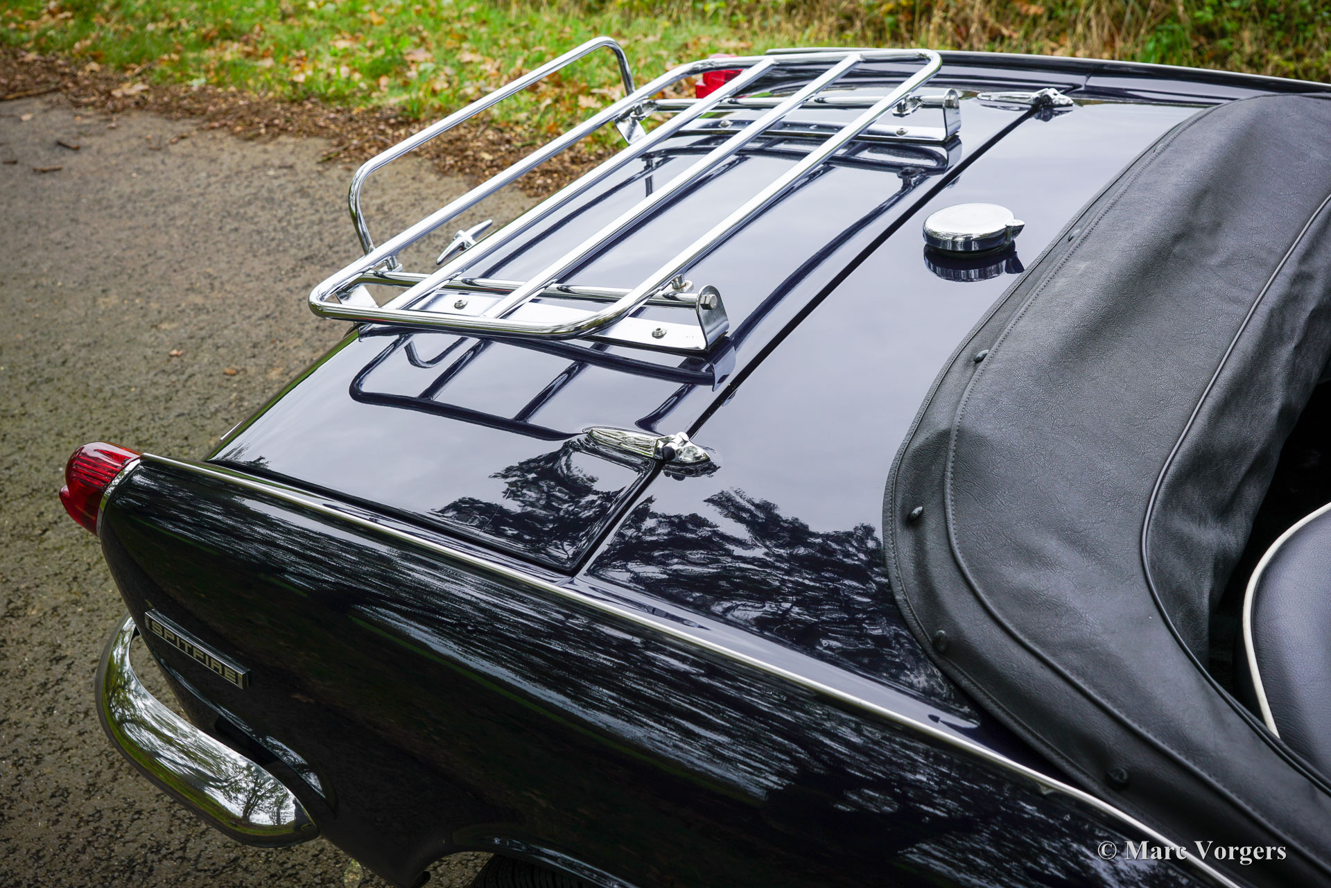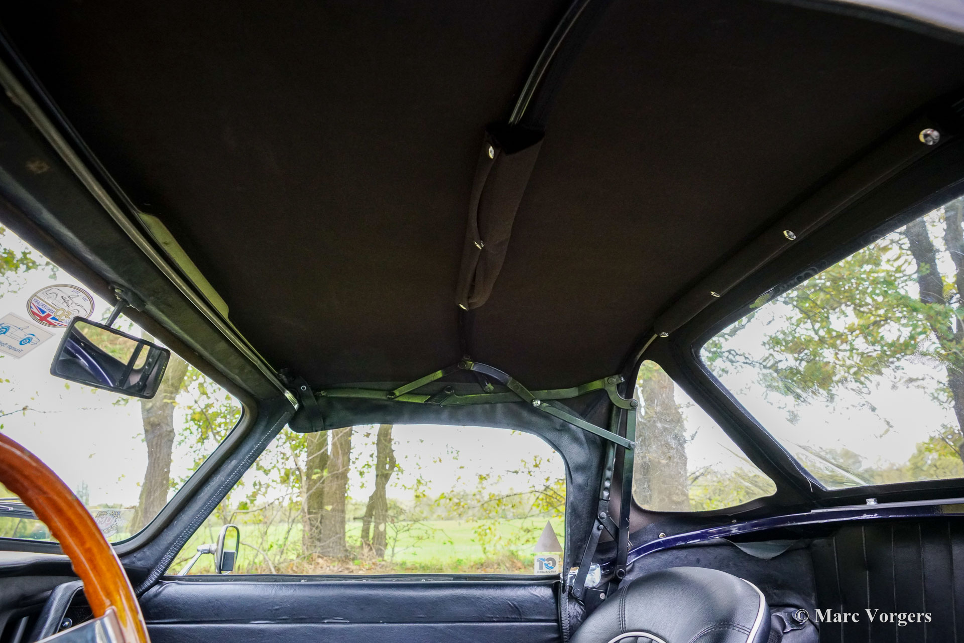 Triumph Spitfire MK 3, Baujahr 1971. Fahrgestellnummer: 1FD83020L. Karosseriefarbe: Dunkelblau (Royal Blue), Innenausstattung: Schwarzes Kunstleder mit schwarzem Teppich. Schwarzes Vinyl-Verdeck, Verdeck Abdeckung und Persenning. Dieser wunderschöne Triumph Spitfire wurde in Großbritannien neu verkauft und am 30. Juni 1971 zugelassen. 1984 wurde er in die Niederlande importiert. Der jetzige Besitzer genießt diesen Wagen seit 2023 auf vielen Sommerausflügen in den Niederlanden, Luxemburg und bei der Square Mountain Rally. Der Triumph Spitfire ist ein Meisterwerk des italienischen Designers Michelotti, der für die markanten Formen vieler Triumph-Klassiker verantwortlich war. Basierend auf einem leicht modifizierten Triumph Herald-Chassis und -Antriebsstrang ist der Spitfire einfach und kostengünstig zu warten. Nach dem Öffnen der großen Motorhaube sind Motor und Vorderrad Aufhängung leicht zugänglich. Der 1296 cm³ große Vierzylinder-Reihenmotor leistet 68 PS und ist mit einem 4-Gang-Schaltgetriebe gekoppelt, das die Kraft auf die Hinterräder überträgt. Mit einem Gewicht von nur 715 Kilogramm bietet der kompakte Spitfire MK 3 ein sportlich/ agiles Fahrverhalten und ein großartiges Open-Air-Erlebnis. Dieses wunderschöne Exemplar in Royal Blue befindet sich in einem guten bis sehr guten Zustand und wurde kürzlich in unserer Werkstatt umfassend gewartet. Zur Ausstattung gehören Overdrive, Chromspeichenräder, verchromte Radmuttern mit Zentralverschluss, ein verchromter Gepäckträger, ein Sportlenkrad mit Holzkranz, Servobremsen, ein kleines Staufach für Wertsachen im Heck, ein Wagenheber, ein Radmutternschlüssel aus Holz sowie ein modernes JVC KD-452 Stereo-Radio mit CD-Player, Aux-Eingang und Antenne am rechten Kotflügel. Zum Fahrzeug gehören außerdem zusätzliche Ersatzteile, Räder und Reifen. Rechnungen der kürzlich durchgeführten Wartungsarbeiten sind vorhanden. Dieser Triumph Spitfire ist ein Oldtimer mit einem hervorragenden Preis-Leistungs-Verhältnis. Er wird seinem neuen Besitzer viel Fahrspaß und zahlreiche neue Freunde in den aktiven nationalen und regionalen Triumph Spitfire Clubs bescheren!