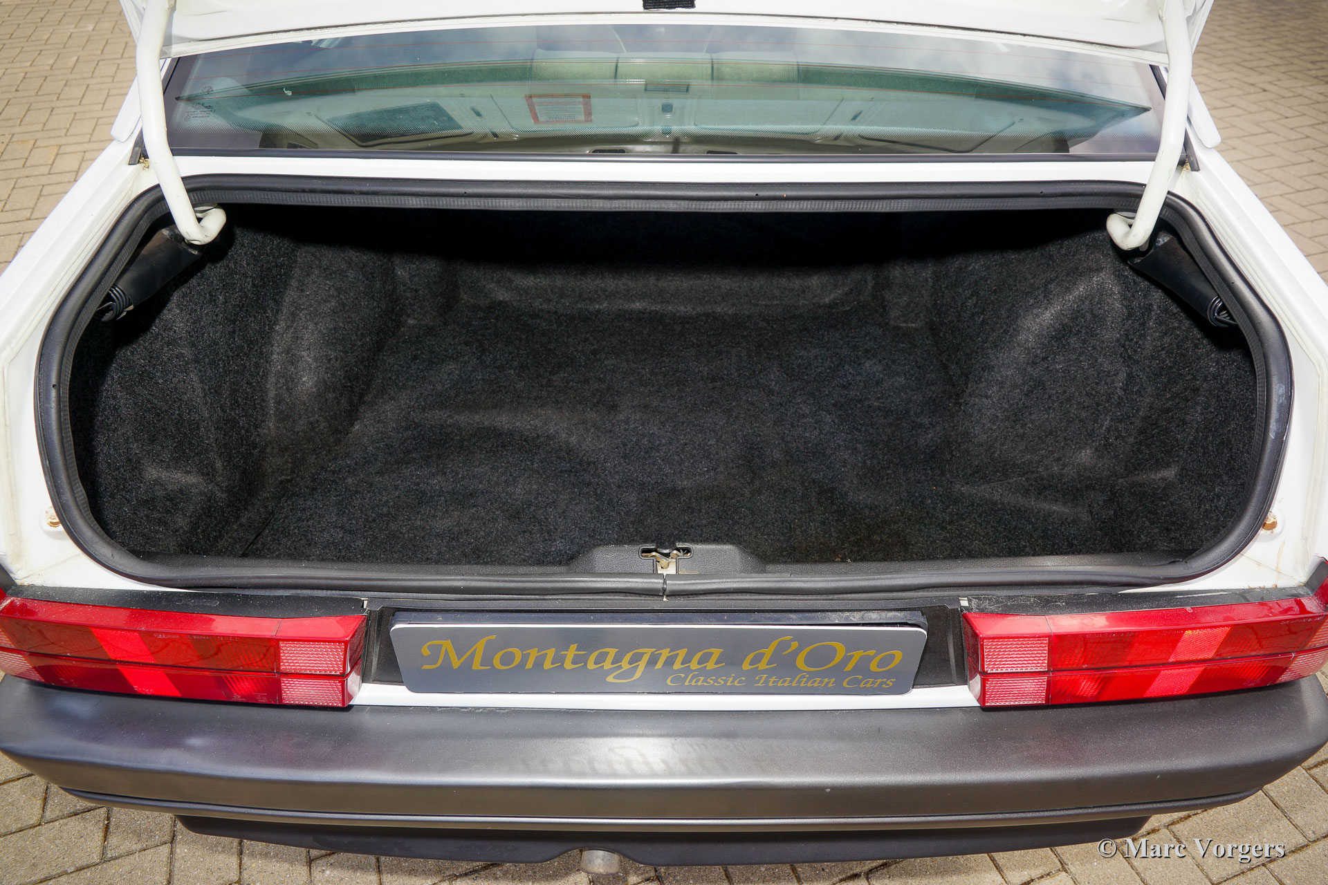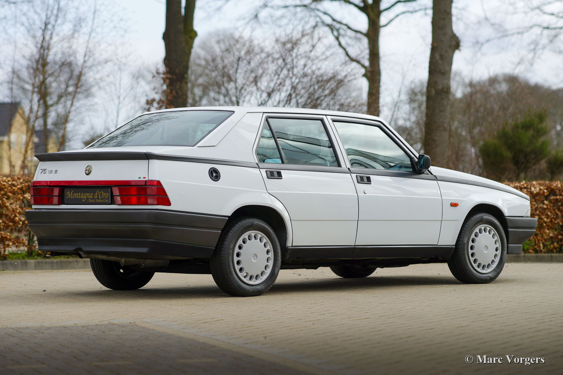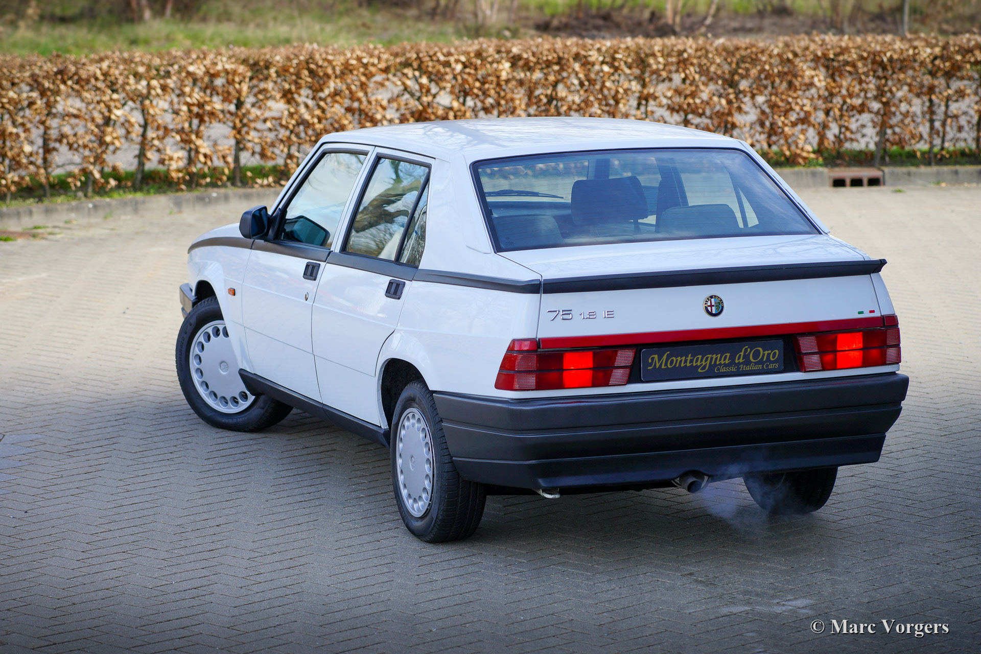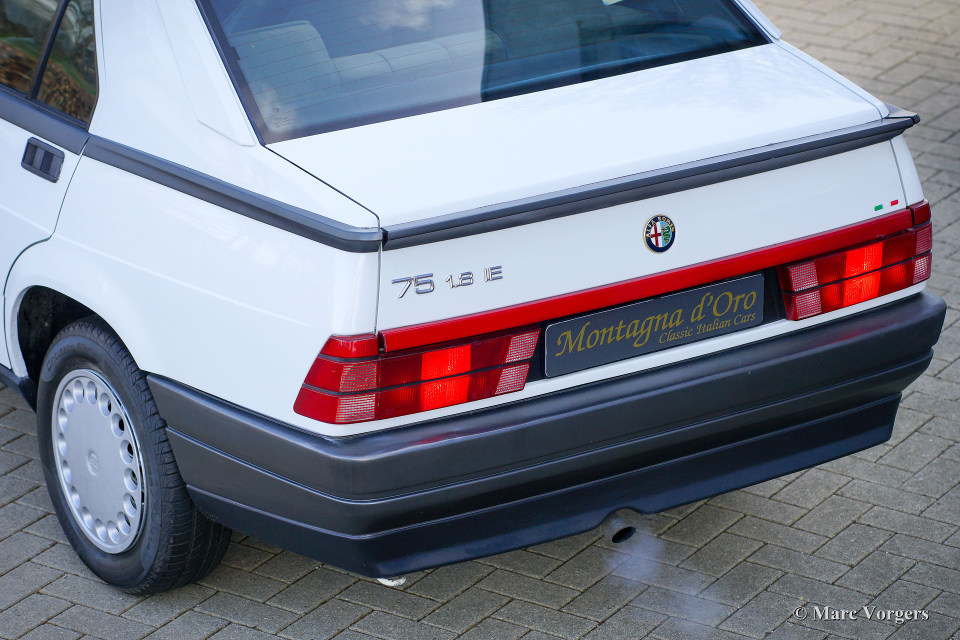 Alfa Romeo 75 1.8 IE, Jahr 1990. Farbe Weiß (Bianco Freddo 230) kombiniert mit einem grauen Stoffinterieur, einem grauen Armaturenbrett und einem schwarzen Teppich. Dieser schöne Alfa Romeo 75 wurde in Italien neu verkauft, im April 2019 wurde das Auto vom ersten Besitzer (wohnhaft in Rom) angekauft und in die Niederlande exportiert. Von neuem hat dieser Alfa 75 nur 50,975 Kilometer gefahren. Unsere Probefahrt ergab, dass dieser Alfa 75 wie neu fährt, anfühlt und bremst! Das Auto ist in einem außergewöhnlich guten und super originalen Zustand. Das Äußere sieht aus wie neu mit nur einem Kratzer am linken Rand der vorderen Stoßstange. Das Stoffinnere ist in einem sehr guten Zustand mit nur einem kleinen Riss in der Naht des Beifahrersitzes. Der Motorraum, der Kofferraum und die Unterseite sind alle sauber und zeigen alle Originaldetails. Der Alfa 75 ist der letzte der „klassischen“ Alfa Romeo mit Hinterradantrieb und, eingeführt mit dem Alfetta von 1972, ein 5-Gang-Getriebe "Transaxle", das vor der DeDion-Hinterachse montiert ist. Der Alfa Romeo 75 ist ein echtes Fahrerauto und zeigt wundervolle Designdetails, die in den 90er Jahren des 20. Jahrhunderts wirklich auffielen. Dieser Alfa Romeo 751.8 IE ist ein fantastischer Fund für den Enthusiasten!
