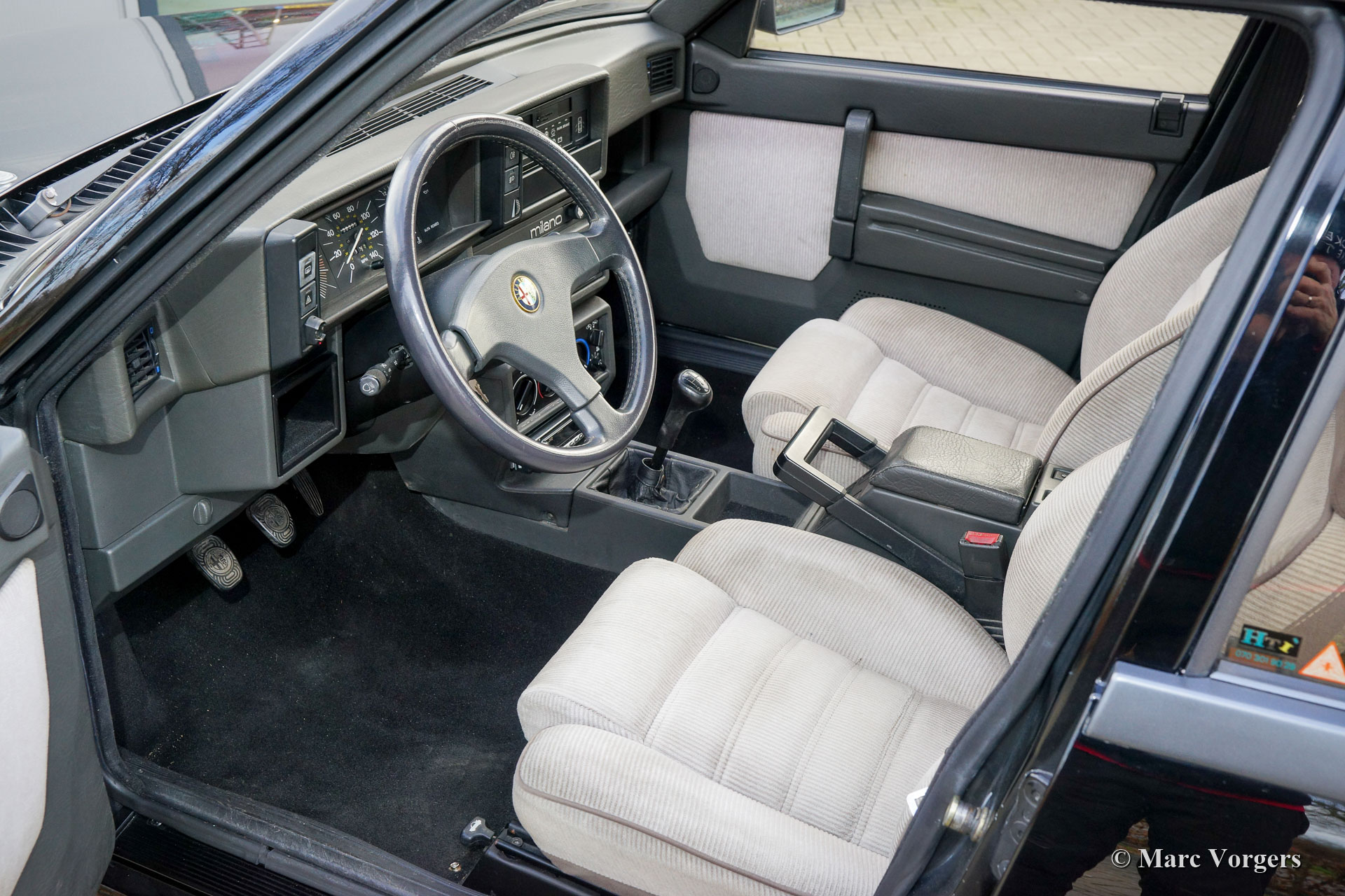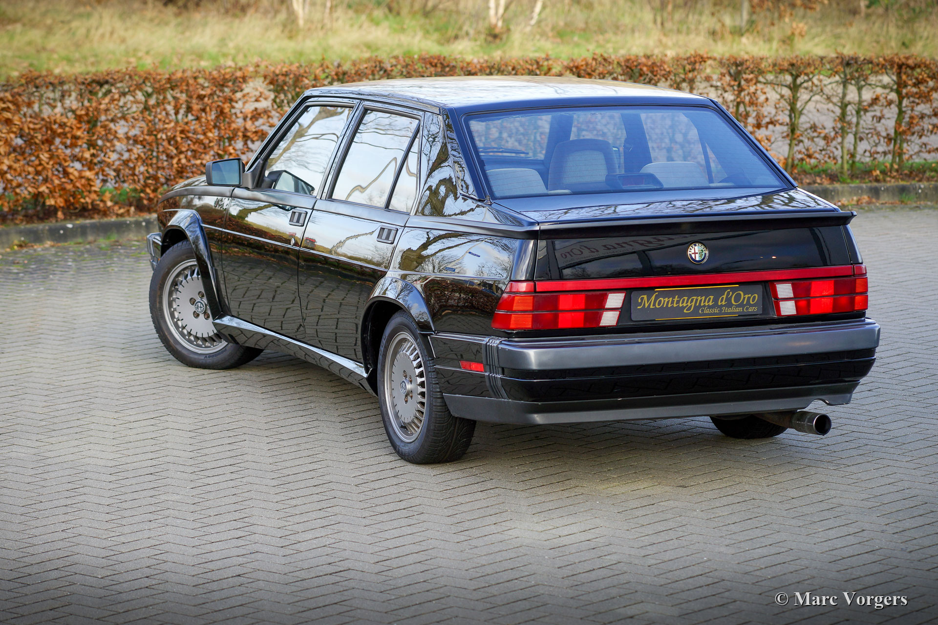 Alfa Romeo 75 2.5 V6 Milano, Baujahr 1986. Farbe schwarz (Nero 601 Doppio Strato) kombiniert mit einem grau/schwarzen Stoffinterieur. Der Alfa Romeo 75 Milano wurde nur auf dem amerikanischen Markt verkauft. Das Milano unterscheidet sich von europäischen Modellen durch seine speziellen Stoßfänger und die serienmäßige Ausstattung mit Luxusoptionen wie elektrisch betriebenen Fenstern rundum und Klimaanlage. Das Milano war von 1986 bis 1989 auf dem US-Markt erhältlich. Das Milano war mit einem 2,5- oder 3,0-Liter-V6-Motor erhältlich. Dieses fantastische Exemplar wurde von D. Spernak „Fuzzy“ von Auto Palace in Pittsburgh (Pennsylvania) verkauft und am 18. September 1986 in den USA zugelassen. Das Auto wurde 1989 in die Niederlande exportiert. In den Niederlanden wurde das Auto von echten Enthusiasten geschätzt, und das Auto hat 130.333 Meilen von neu gefahren. Dieser Alfa 75 Milano befindet sich in einem sehr guten und super originalen Zustand mit nur leichten Gebrauchsspuren. Dieser 75 Milano zeigt alle Originaldetails und das Auto fährt perfekt. Der 2,5-Liter-V6-Motor ist eine wahre Freude, und es klingt beeindruckend! Dieser fantastische Alfa Romeo 75 Milano wird komplett mit allen Originalbüchern geliefert, einschließlich eines ausgefüllten und abgestempelten Servicehefts. Dies ist ein wunderbares und superoriginelles Beispiel für den Alfa Romeo-Enthusiasten!