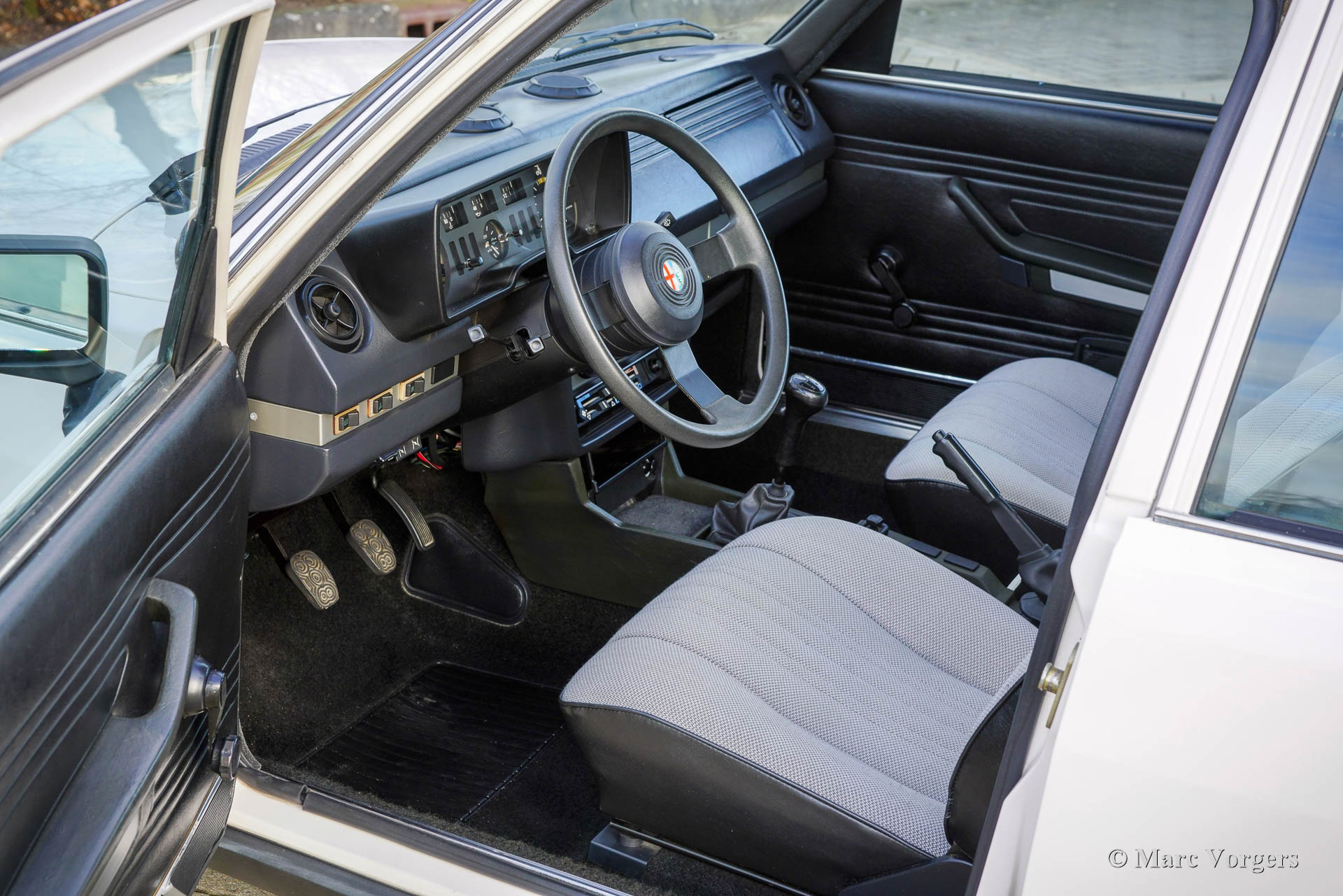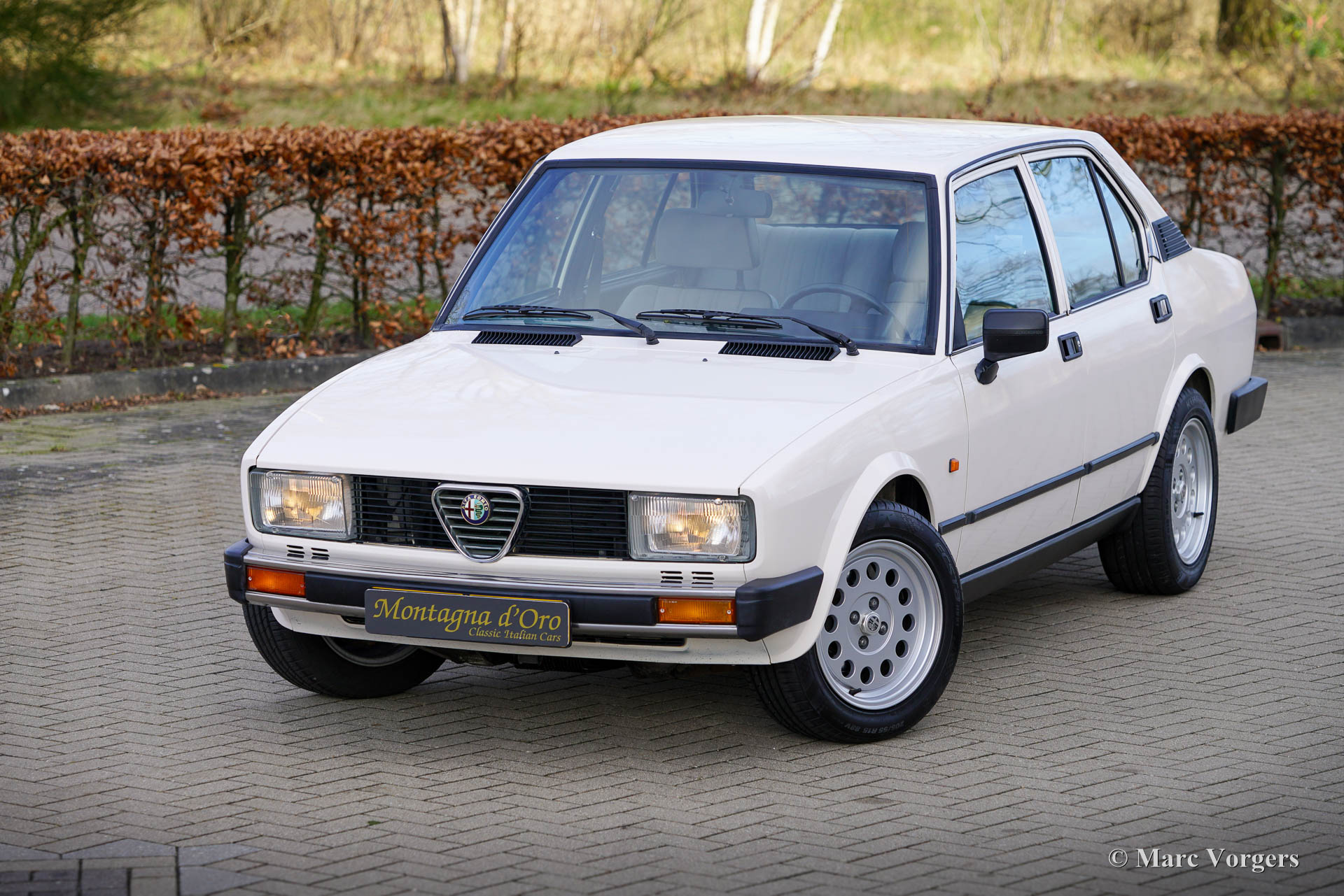 Alfa Romeo Alfetta 1800 Berlina, Jahr 1983. Farbe Cremeweiß (Bianco Capodimonte A.R.015) kombiniert mit einer grau/schwarzen Stoff-/Kunstleder Innenraum getrimmt mit schwarzem Teppich. Dieser wunderschöne Alfa Romeo Alfetta 1800 Berlina wurde in Italien neu verkauft. Das Auto wurde im Jahr 2021 in die Niederlande importiert. Diese Alfetta 1800 Berlina ist in einem sehr guten bis hervorragenden Zustand, der Tacho zeigt derzeit 85,454 Kilometer an. Das Auto weist nur leichte Gebrauchsspuren auf, unter der Motorhaube sieht alles frisch und sauber aus und die originale Innenausstattung ist in einem ausgezeichneten Zustand! Der Alfa Romeo Alfetta ist eine sportliche klassische Limousine mit den mechanischen Details eines reinrassigen Sportwagens. Das Auto verfügt über einen Aluminium-Vierzylindermotor mit zwei obenliegenden Nockenwellen, ein 5-Gang-Transaxle-Getriebe direkt vor der Hinterradaufhängung für eine 50:50-Gewichtsverteilung, Scheibenbremsen rundherum und eine De-Dion-Hinterachse. Das Auto fährt, manövriert, lenkt und bremst perfekt! Diese Alfetta 1800 ist mit wunderschönen Ronal-Leichtmetallrädern und Kumho 205/55-Reifen ausgestattet. Dies ist eine wunderschöne Alfetta 1800 für den Alfa Romeo-Enthusiasten!