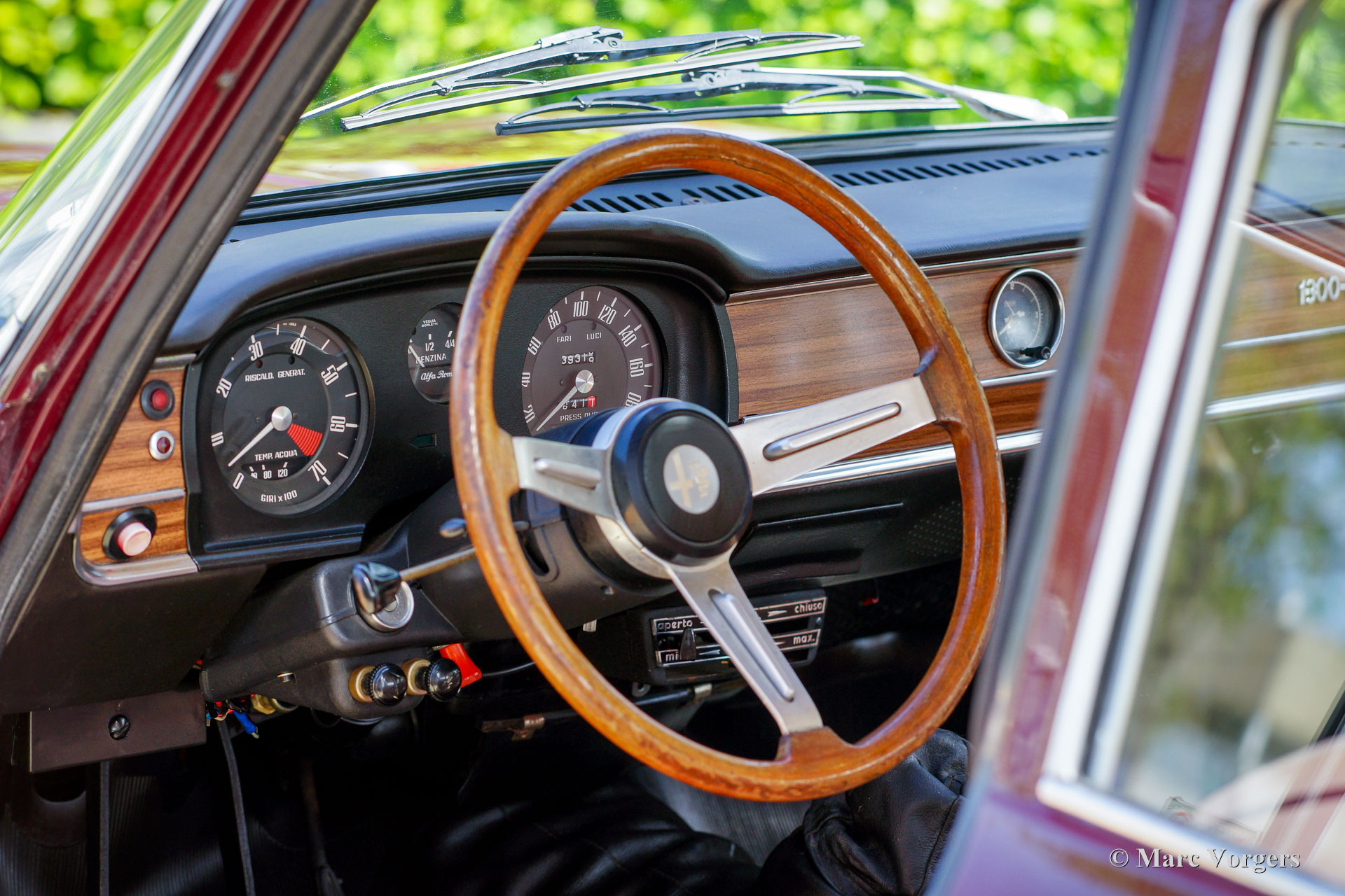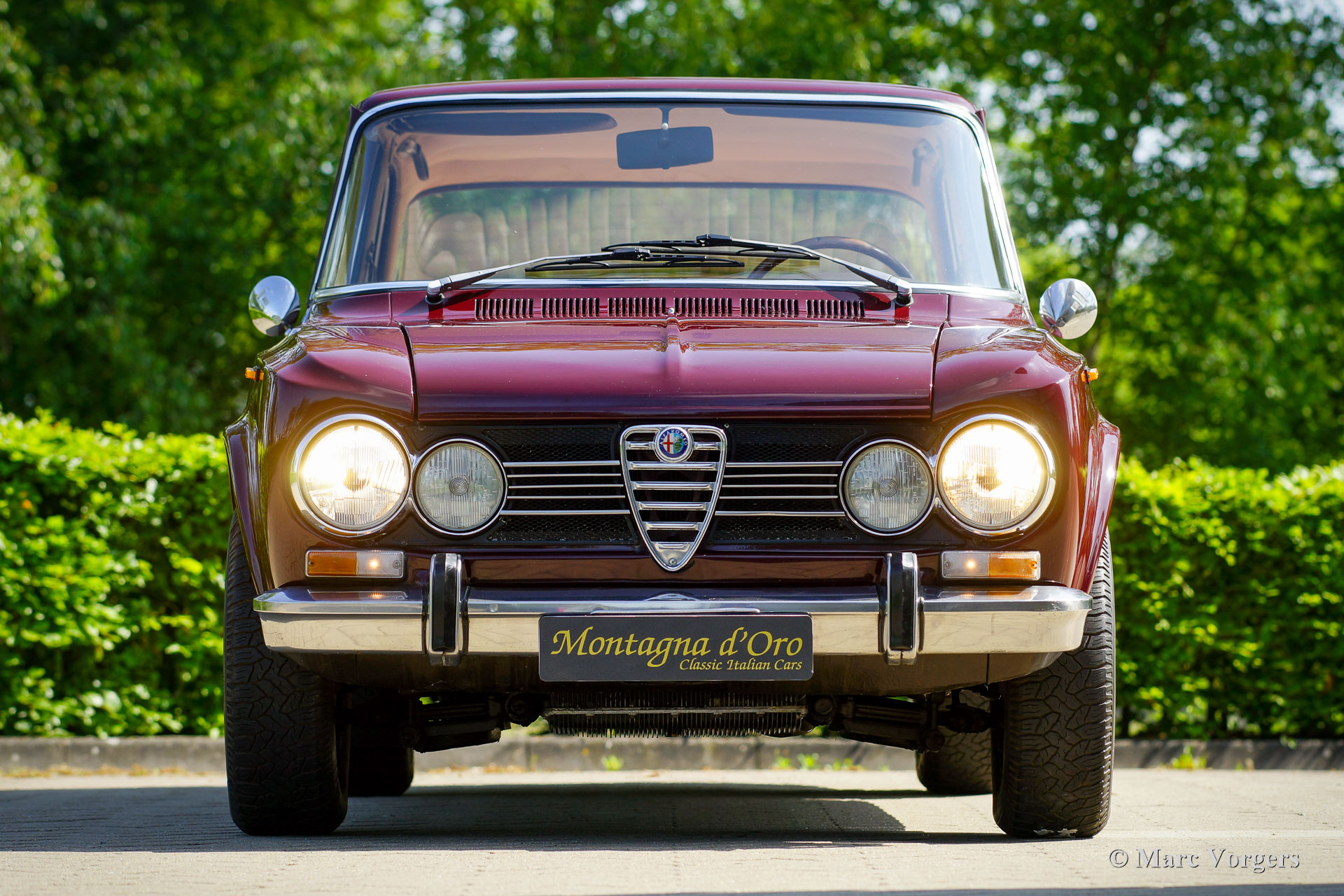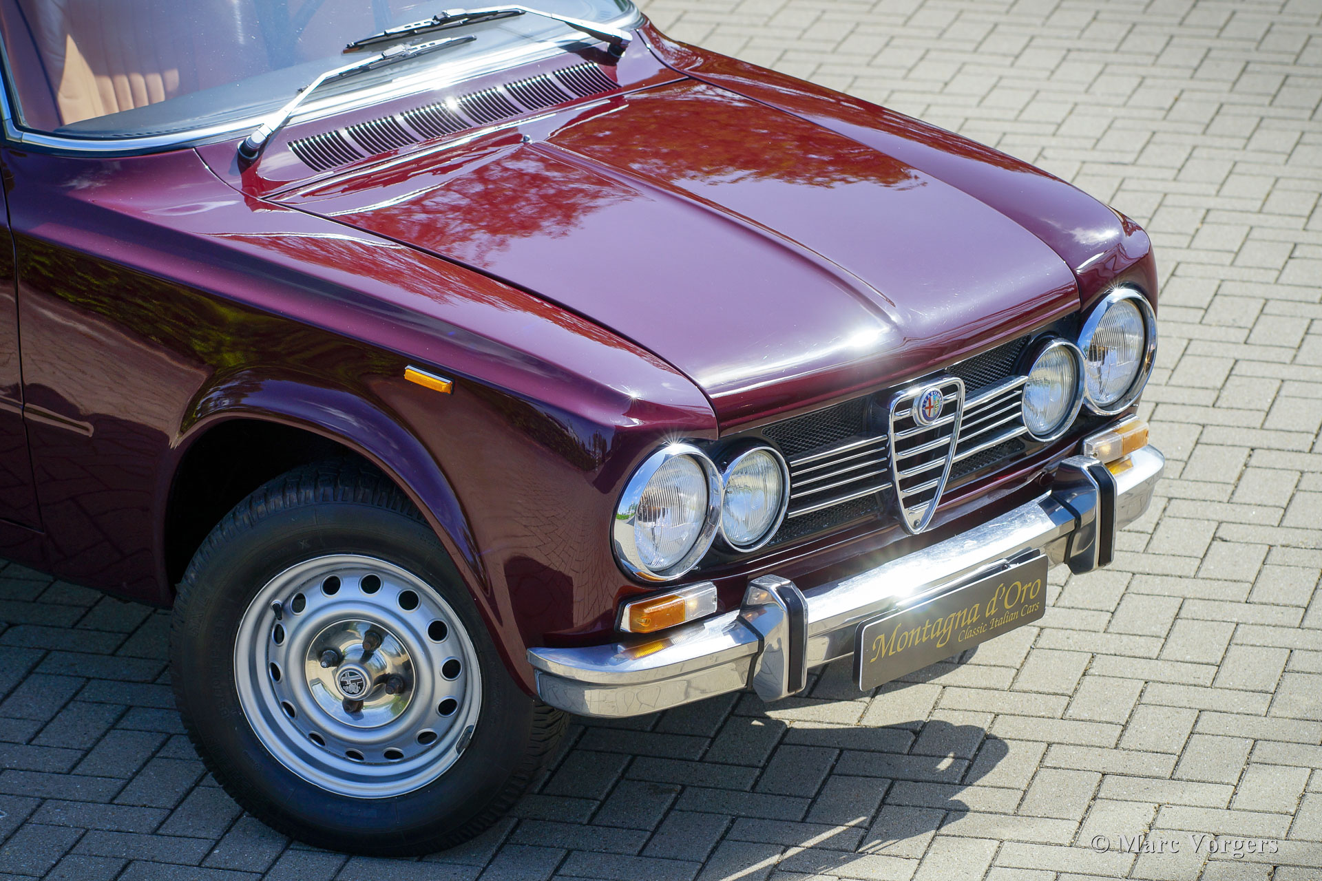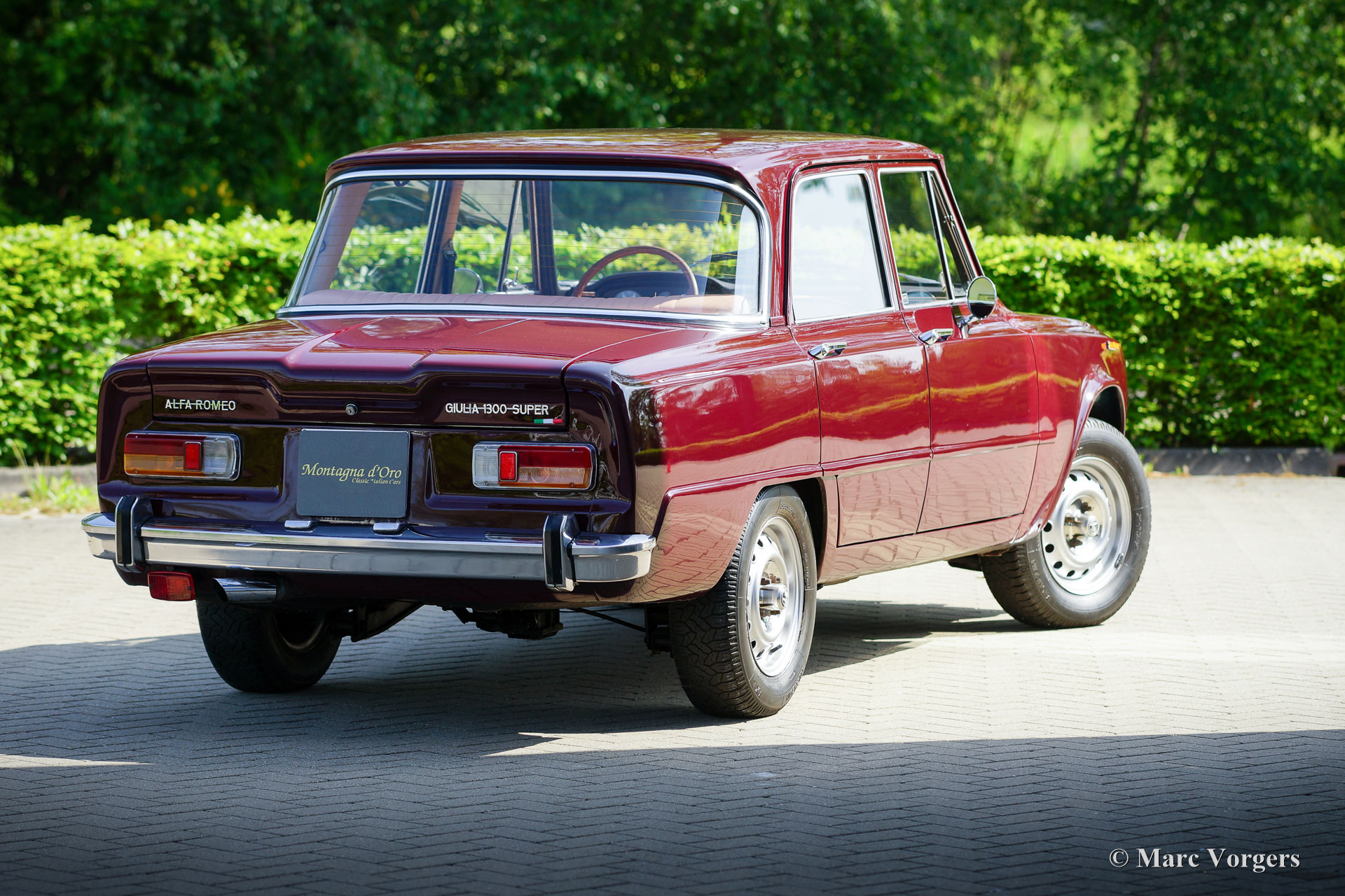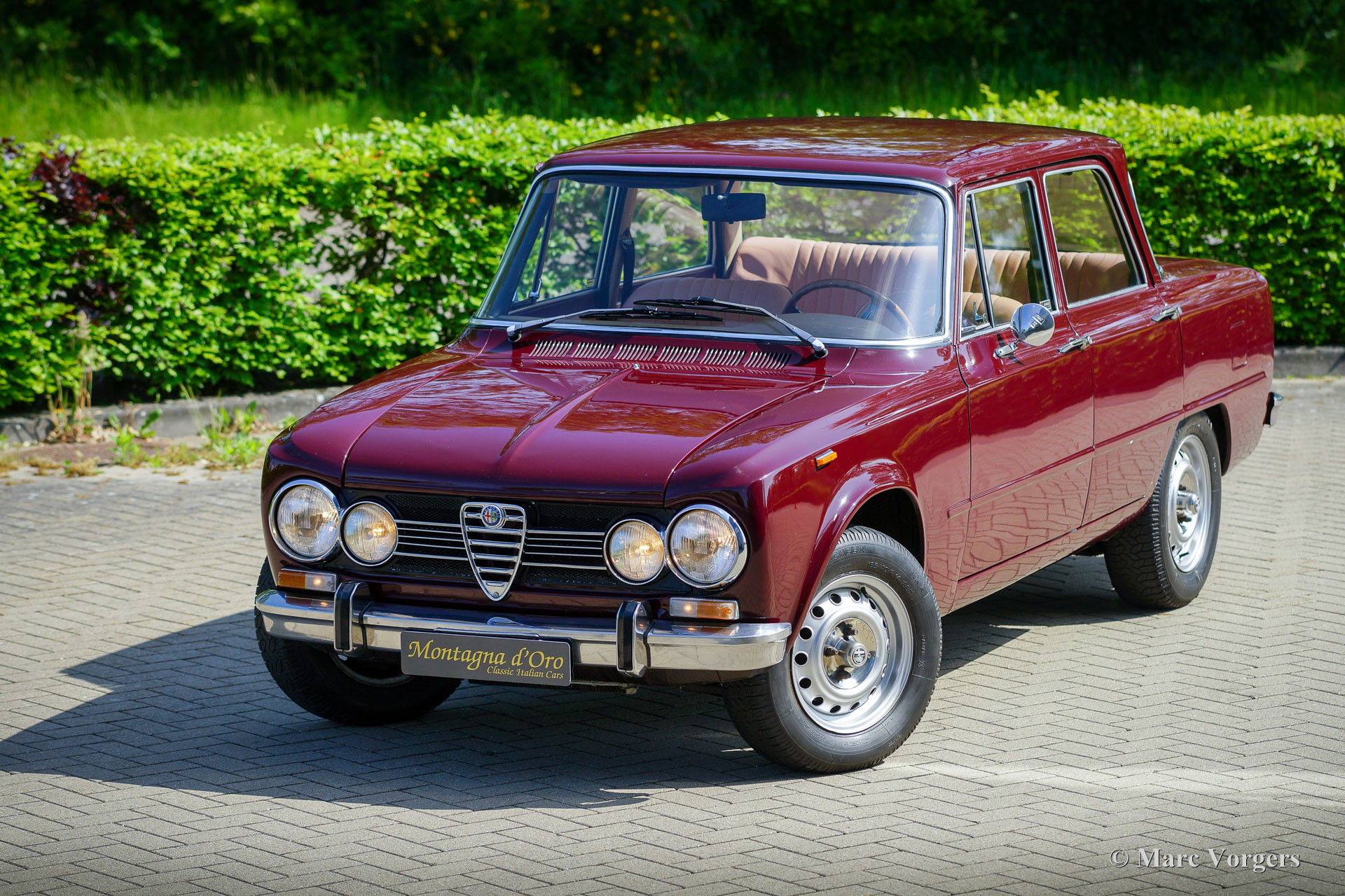 Alfa Romeo Giulia 1300 Super, Baujahr 1972. Farbe: Dunkelrot (Rosso Amaranto), kombiniert mit einer beigen Lederausstattung getrimmt mit dunkelroten Paspeln und schwarzem Teppich. Dieser wundervolle Alfa Romeo Giulia Super wurde 1990 in die Niederlande importiert. Das Auto befindet sich seit 2005 beim letzten Besitzer. Der Tachostand beträgt derzeit 39,139 Kilometer. Da das Auto in den letzten Jahren in der Garage verstaubte, beschloss der Besitzer, diese Schönheit zu verkaufen. Das Auto ist in einem sehr guten und schönen Zustand mit leichten Gebrauchsspuren. Das Auto wurde in der Vergangenheit mit einer Waxoyl-Rostschutzbehandlung behandelt, lediglich ein Korrosionsfleck ist im unteren Teil des rechten vorderen Kotflügels zu finden. Die Karosserie ist sehr solide und die Blechpaneele passen perfekt. Die Sitze und die Türverkleidungen sind mit hellbraunem Leder gepolstert; Ein teures Upgrade, das dem Innenraum eine sehr luxuriöse Note verleiht! Das Armaturenbrett und der Gummiteppich sind in ausgezeichnetem Zustand. Wenn man fährt und auf das Armaturenbrett aus Holzfurnier und die wunderbaren Anzeigen blickt, hat man immer ein ganz besonderes Gefühl. Das Auto verfügt über einen 1300-cm³-Vierzylindermotor mit zwei obenliegenden Nockenwellen, ein Fünfganggetriebe und Scheibenbremsen rundherum; sehr fortschrittlich für ein Familienauto von 1972! Das Auto erhält eine umfassende Wartung und Einstellung, bevor es an einen stolzen neuen Besitzer übergeben wird. Diese Giulia Super ist ausgestattet mit den originalen 14-Zoll-Stahlfelgen, Michelin 185/70-Reifen, zwei an den Türen montierten Rückspiegeln, einem Lenkrad mit Holzkranz und dem originalen Wagenheber. Dieser Alfa Romeo Giulia 1300 Super wird den Autotraum des begeisterten klassischen Alfa Romeo-Enthusiasten erfüllen!