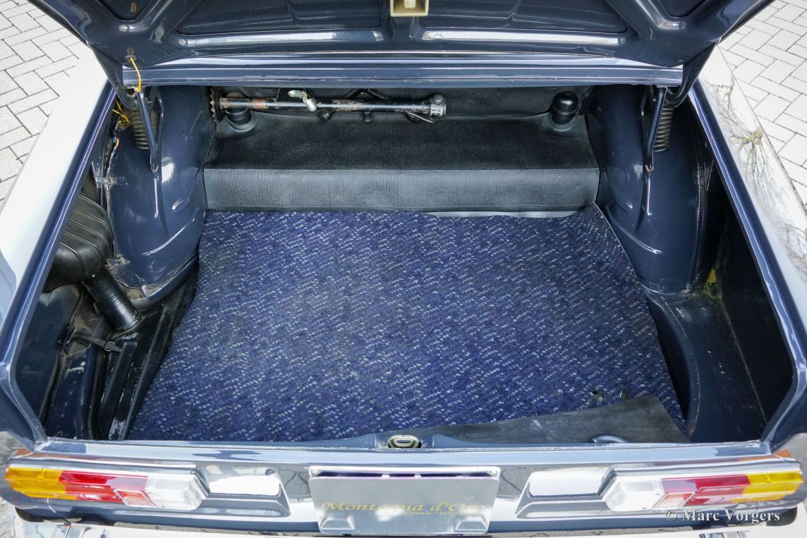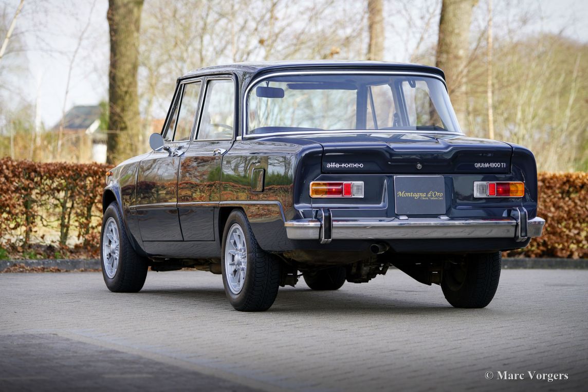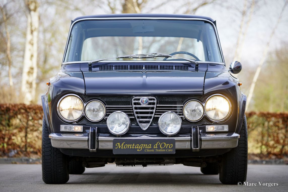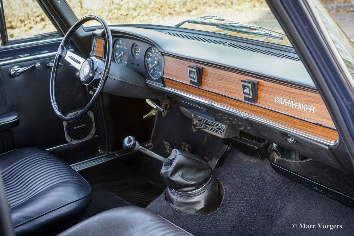 Alfa Romeo Giulia 1300 TI, Baujahr 1969. Fahrgestellnummer AR10539*1070104*, Motornummer AR00539*62659*. Karosseriefarbe Dunkelgrau (Antracite Inglese AR 736) kombiniert mit schwarzer Kunstlederausstattung und anthrazitfarbenem (dunkelgrauem) Teppich. Dieser wunderschöne Alfa Romeo Giulia befindet sich in einem sehr schönen und sehr guten Originalzustand. Die Karosserie wurde in der Vergangenheit in der Originalfarbe neu lackiert. Der Innenraum ist vollständig original und in sehr gutem Zustand mit nur geringen Gebrauchsspuren. Die schwarzen Türverkleidungen, die am unteren Rand leichte Abnutzungsspuren aufweisen, werden durch einwandfreie Exemplare ersetzt. Montagna d’Oro verkaufte dieses Schmuckstück vor neun Jahren (Februar 2017), und das Fahrzeug wurde nun in Zahlung gegeben. Der Kilometerzähler zeigt aktuell 83.434 Kilometer an, und dieser feine Alfa Romeo verfügt über eine lückenlose jährliche Servicehistorie. Ende der 1960er-Jahre war der Alfa Romeo Giulia eine geräumige und äußerst begehrte Sportlimousine mit servounterstützten Scheibenbremsen, einem Vierzylinder-Aluminiummotor mit zwei obenliegenden Nockenwellen, einem 5-Gang-Getriebe und allen Instrumenten, die sich ein sportlicher Fahrer wünschte. Dieses sehr originale, technisch sehr gute, und optisch hervorragende Exemplar ist ausgestattet mit zeitgenössischen (seltene) SEV Marchal 662 Halogen Scheinwerfern, wunderschönen Cromodora-Leichtmetallfelgen und K&N-Sportluftfiltern an den Weber-Doppelvergasern!