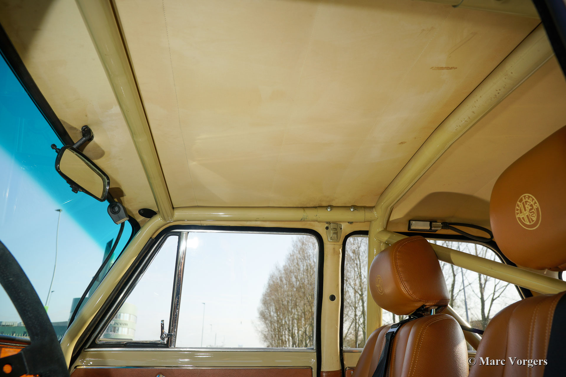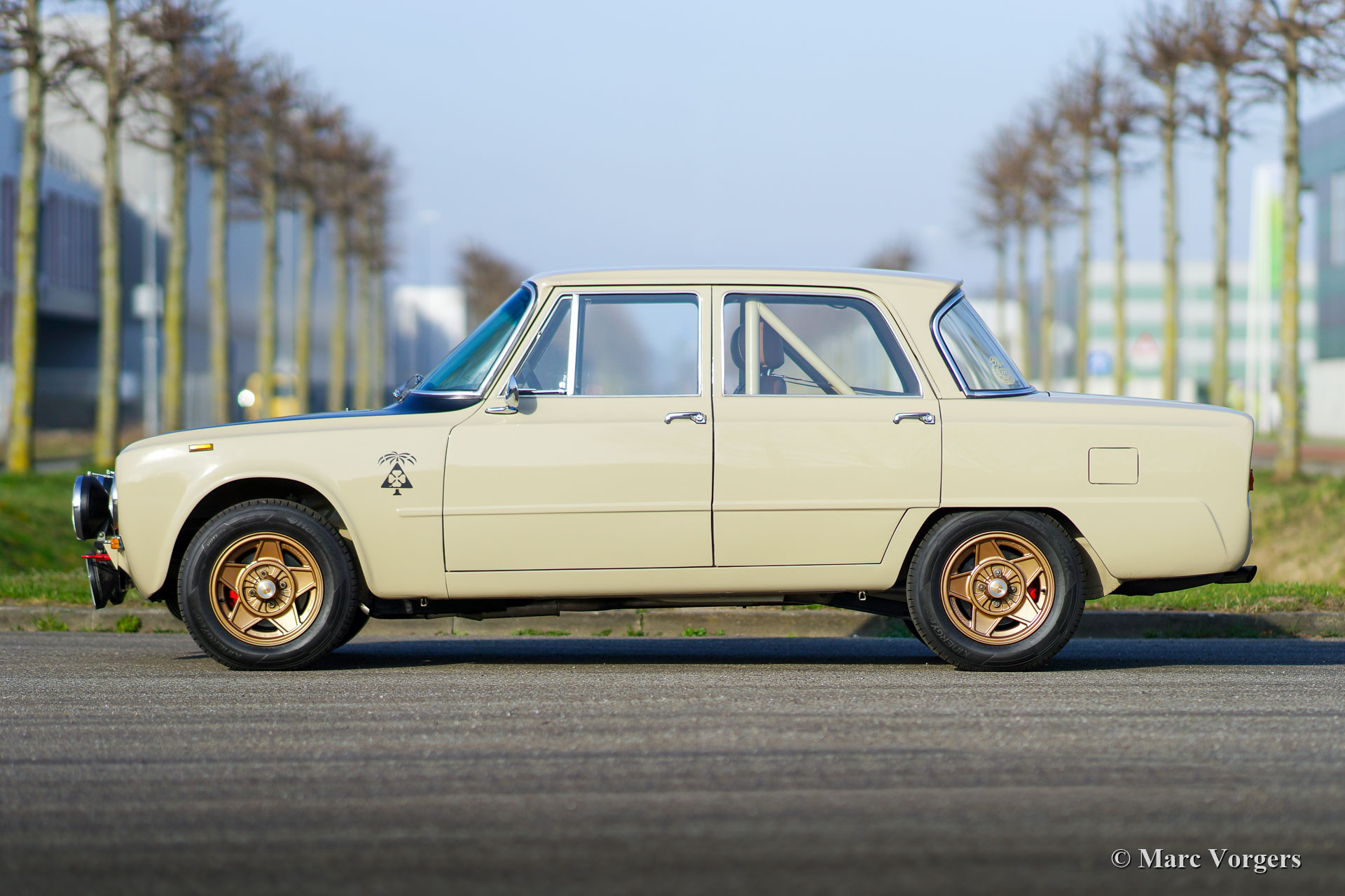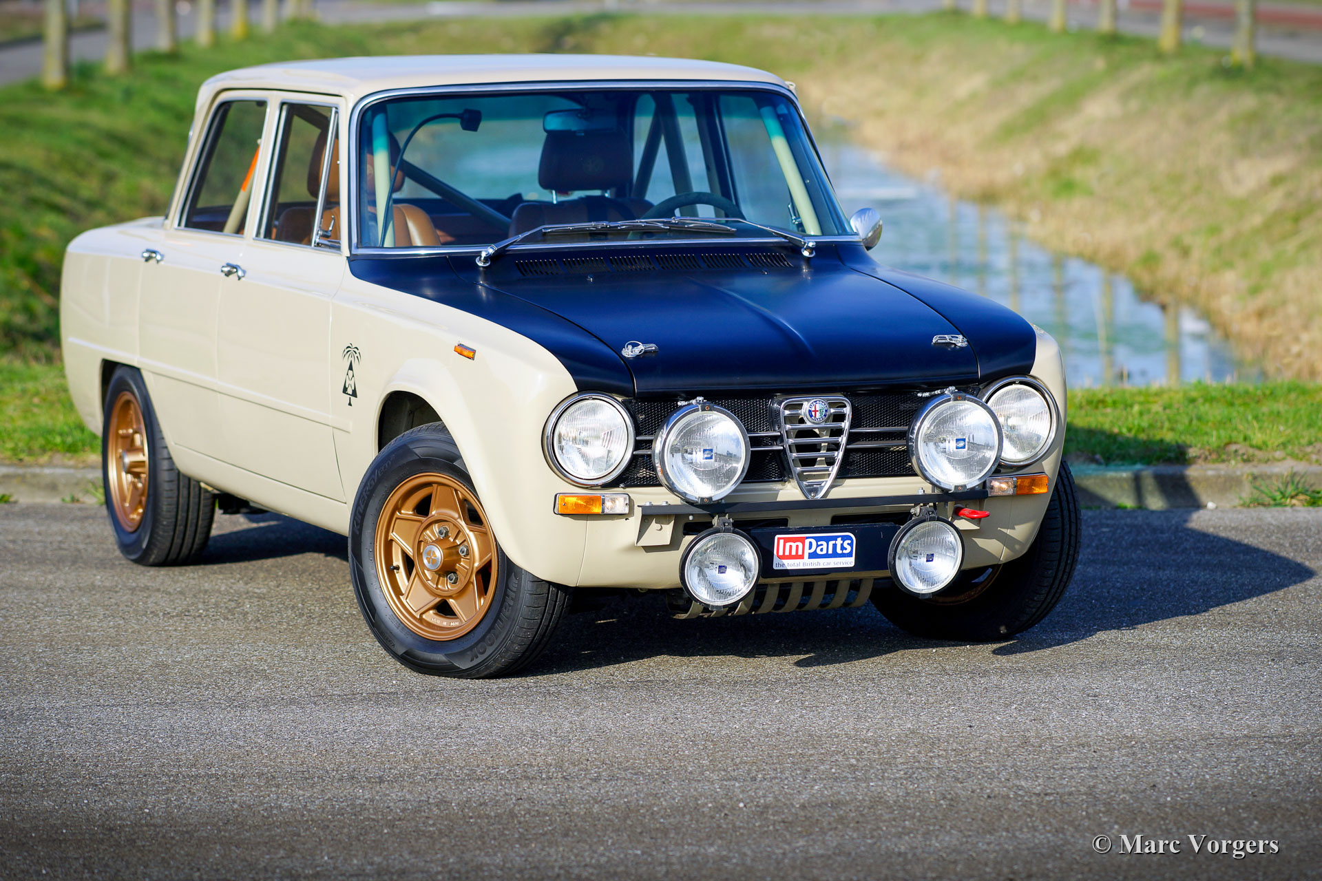 Alfa Romeo Giulia 1300 TI Rallye-Wagen, Jahr 1969. Farbe Cava (Sandbeige) kombiniert mit einem hellbraunen Leder / Kunstleder-Interieur. Dieses fabelhafte Alfa Romeo Giulia wurde umfassend restauriert. Das Auto wurde wunderschön aufgebaut als historisches Rallye-Auto. Die Karosserie wurde rundum und innen und außen restauriert und lackiert. Der Innenraum wurde perfekt und mit Liebe zum Detail gepolstert. Der 1300-Motor wurde durch eine komplett überholte und abgestimmte 2-Liter-Einheit ersetzt. Der Motor ist versehen von mit schnelleren Nockenwellen, höhere Kompression, Doppele-Vergasern, einem Sportluftfilter und elektronischer Zündung. Das 5-Gang-Getriebe wurde ebenfalls komplett überholt. Der Kabelbaum wurde erneuert und für Rallyezwecke optimiert. Dieses Alfa Romeo Rallye-Auto ist in einem ausgezeichneten Zustand und das Auto fährt perfekt! (Sportlich und dennoch komfortabel.) Das Rallye-Auto verfügt über spezielle Sportsitze mit 4-Punkt-Sparco-Sicherheitsgurten, einen Sparco-Überrollkäfig, einen Brantz-Rallye-Timer, eine Ölwannenschutzplatte, Hella 2000-Spotlampen und Hella-Breitstrahl Kurvenlampen, eine Hella-Rückfahrleuchte und wundervolle bronzefarbene Cromodora-Leichtmetallräder. Dies ist ein sehr begehrenswertes Alfa Romeo Rallye-Auto, das perfekt gebaut wurde. Diese Maschine ist bereit für jedes (Rallye-) Abenteuer in den Händen eines neuen Besitzers!