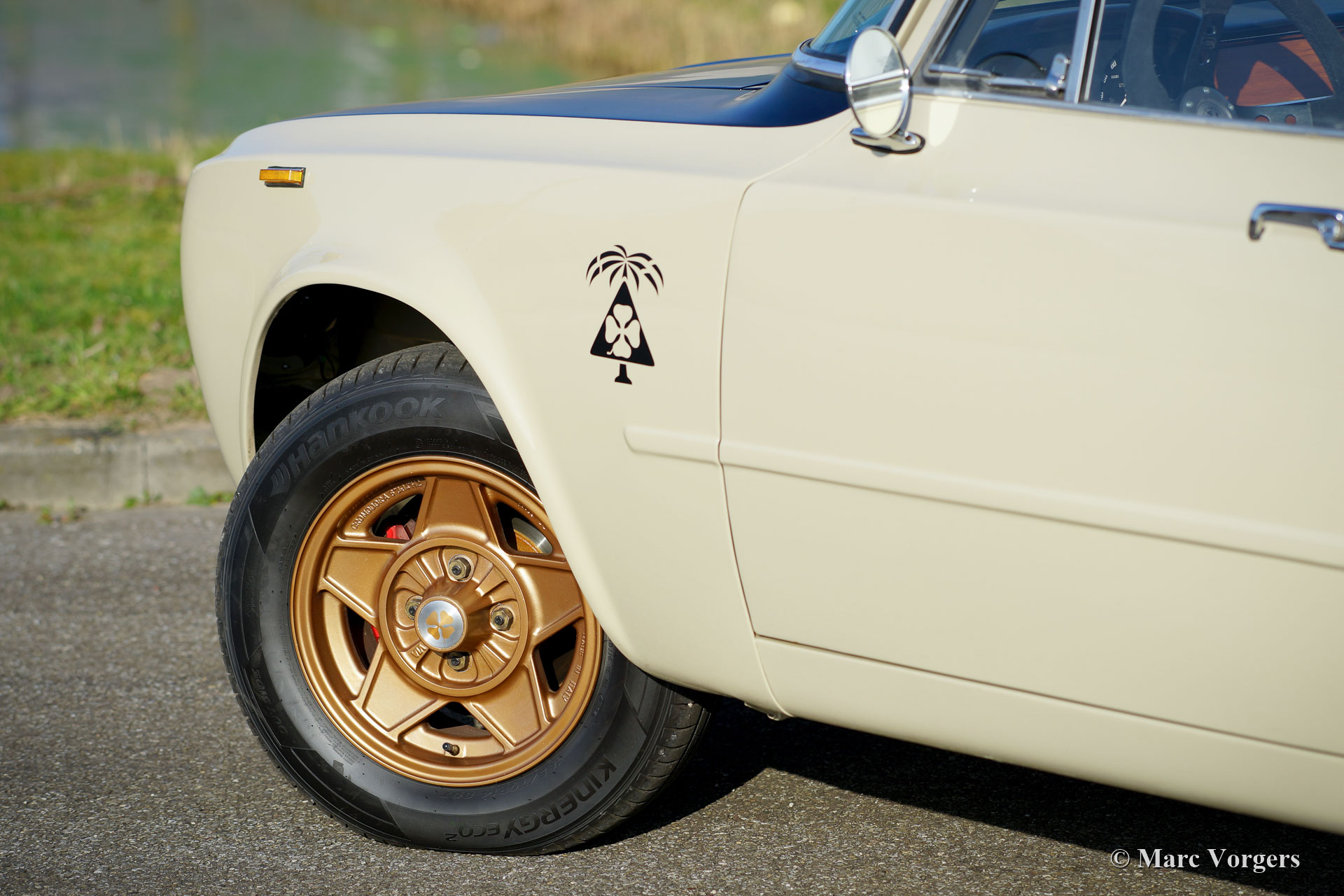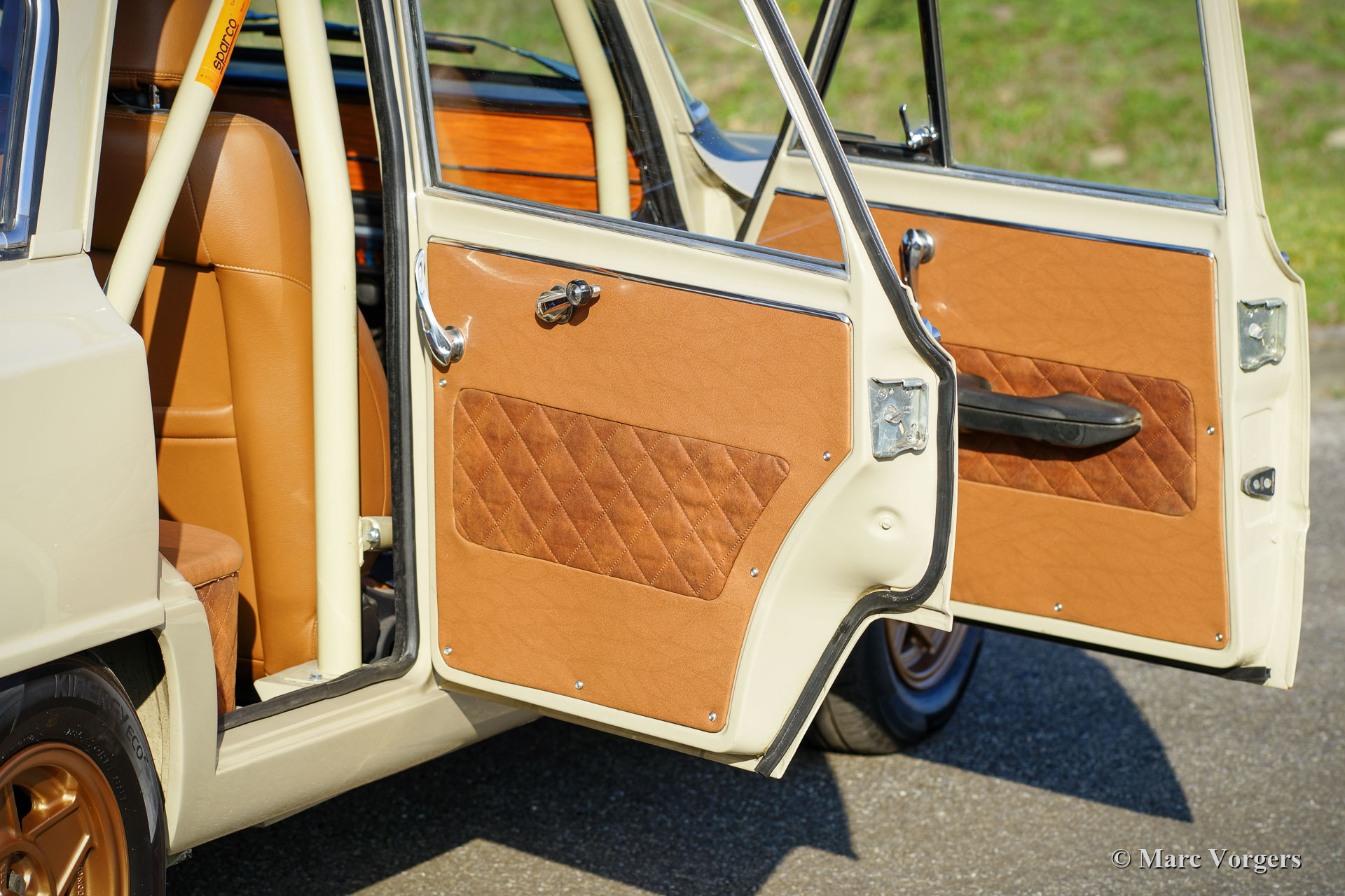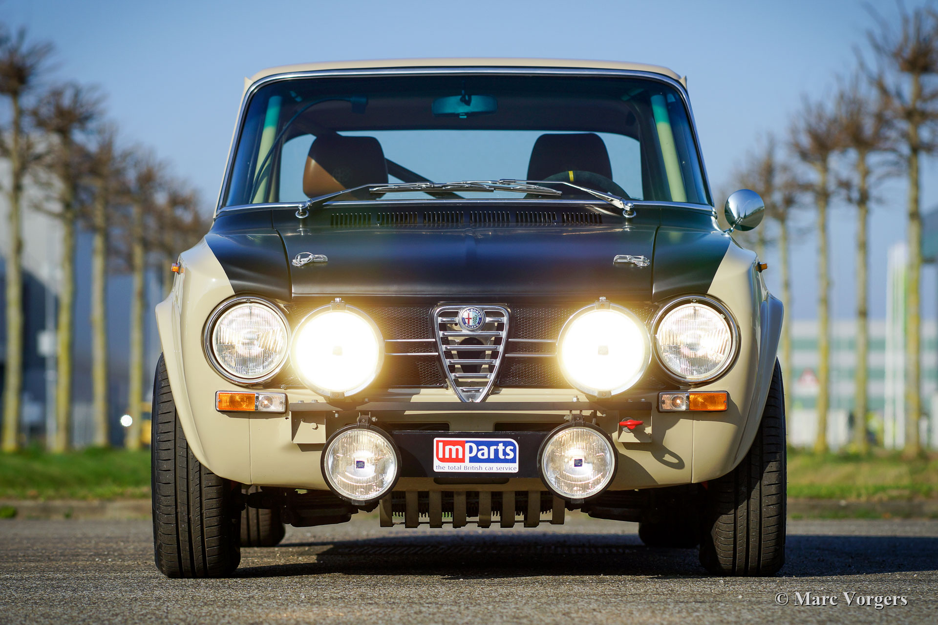 Alfa Romeo Giulia 1300 TI Rallye-Wagen, Jahr 1969. Farbe Cava (Sandbeige) kombiniert mit einem hellbraunen Leder / Kunstleder-Interieur. Dieses fabelhafte Alfa Romeo Giulia wurde umfassend restauriert. Das Auto wurde wunderschön aufgebaut als historisches Rallye-Auto. Die Karosserie wurde rundum und innen und außen restauriert und lackiert. Der Innenraum wurde perfekt und mit Liebe zum Detail gepolstert. Der 1300-Motor wurde durch eine komplett überholte und abgestimmte 2-Liter-Einheit ersetzt. Der Motor ist versehen von mit schnelleren Nockenwellen, höhere Kompression, Doppele-Vergasern, einem Sportluftfilter und elektronischer Zündung. Das 5-Gang-Getriebe wurde ebenfalls komplett überholt. Der Kabelbaum wurde erneuert und für Rallyezwecke optimiert. Dieses Alfa Romeo Rallye-Auto ist in einem ausgezeichneten Zustand und das Auto fährt perfekt! (Sportlich und dennoch komfortabel.) Das Rallye-Auto verfügt über spezielle Sportsitze mit 4-Punkt-Sparco-Sicherheitsgurten, einen Sparco-Überrollkäfig, einen Brantz-Rallye-Timer, eine Ölwannenschutzplatte, Hella 2000-Spotlampen und Hella-Breitstrahl Kurvenlampen, eine Hella-Rückfahrleuchte und wundervolle bronzefarbene Cromodora-Leichtmetallräder. Dies ist ein sehr begehrenswertes Alfa Romeo Rallye-Auto, das perfekt gebaut wurde. Diese Maschine ist bereit für jedes (Rallye-) Abenteuer in den Händen eines neuen Besitzers!