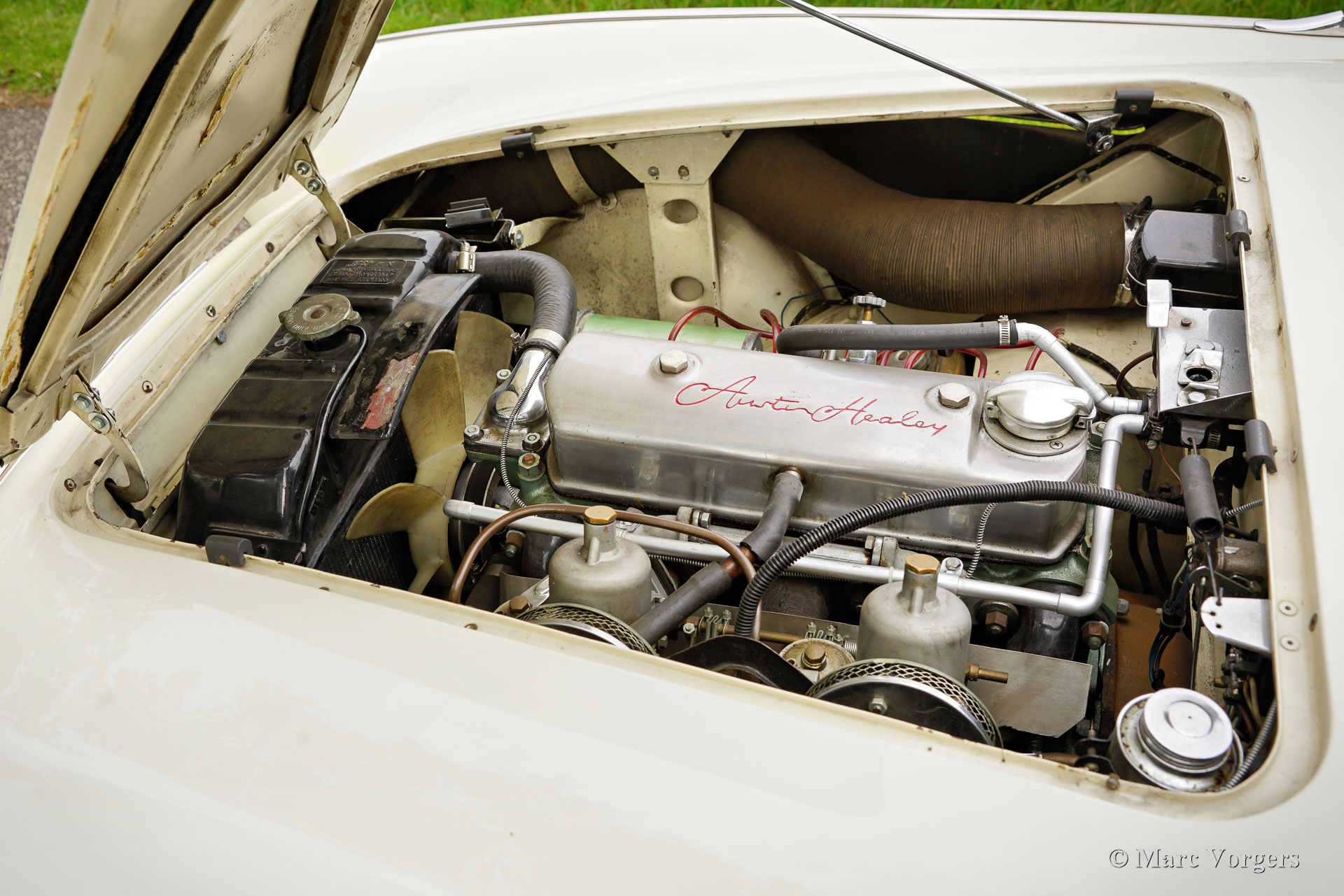 The 100 was the first Austin Healey (also named 100/4 after the 100/6 six cylinder appeared on the market). This extremely well looking car was equipped with a 2660 cc. four-cylinder engine. This engine was used in the Austin Atlantic. The 100 models built up to the year 1955 were equipped with a 3-speed gearbox with optional double overdrive. The latter models were offered with a 4-speed gearbox with optional overdrive on the top-gear.
