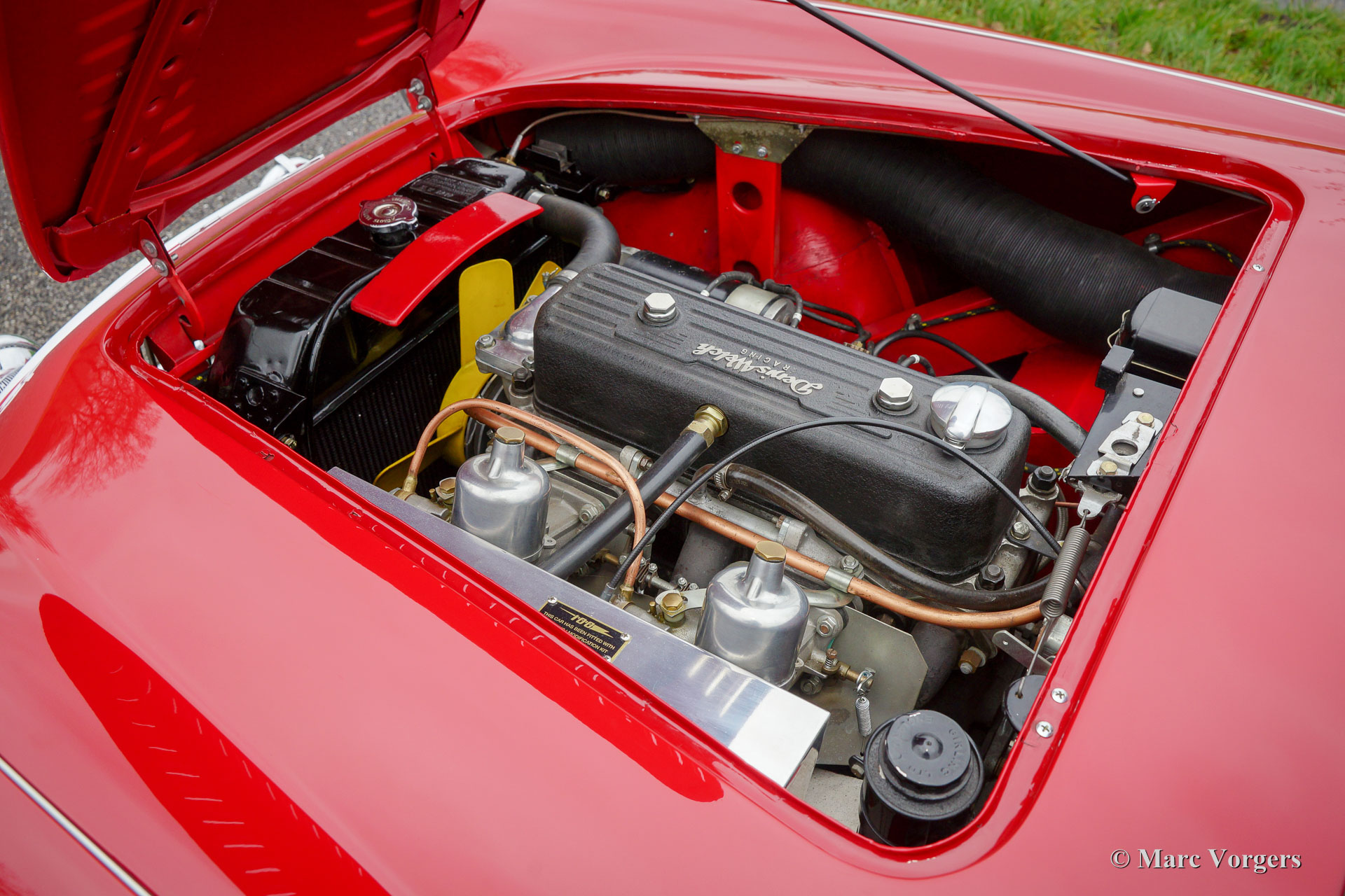 Austin Healey 100/4 BN1 "Le Mans", Jahr 1954. Fahrgestellnummer BN1-L / 2225XX, Motornummer 1B / 2225XX, Chassis und Motor haben übereinstimmende Nummern (‘matching numbers‘). Farbe rot (Carmine red) mit einem roten Lederinnenraum und rotem Teppich. Rotes Verdeck, Aluminium-Seitenfenster mit roter Blende und ein schwarzer Vinylbeutel zur Aufbewahrung der Fenster. Dieser wunderschöne Austin Healey wurde in den USA neu verkauft. In den Jahren 2014 - 2018 wurde das Auto von Chris Jeans in Belgien aufwendig restauriert. Ein Heritage-Zertifikat ist vorhanden. Dieser 'Big Healey' ist in einem sehr schönen Zustand! Der Motor wurde von Denis Welch in England überholt und nach ‘M‘ Spezifikationen eingestellt. Das Auto ist ausgestattet mit dem ‘M - Le Mans‘ -Kit. Das Kit enthält eine Motorhaube aus Aluminium mit Lüftungsschlitzen, einen Spezial Aluminiumzylinderkopf, eine spezielle Nockenwelle, eine Kaltluftbox und größere S.U. Vergaser. Zusätzlich ist das Auto versehen von Scheibenbremsen an den Vorderrädern und einem BN2-Vierganggetriebe mit Overdrive.