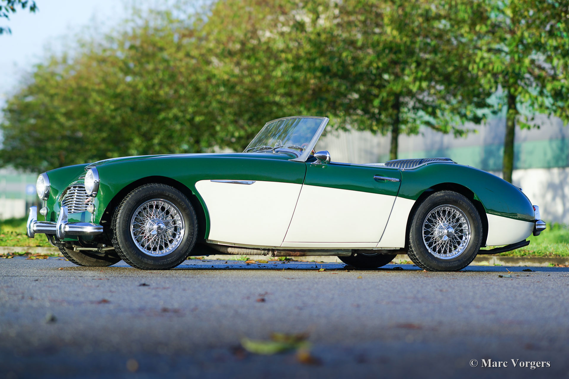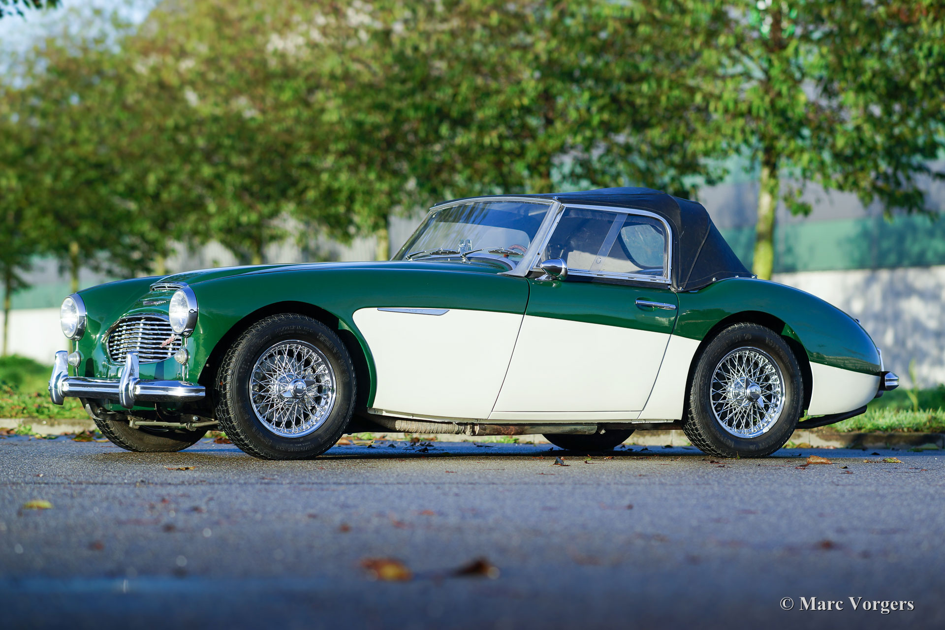 Austin Healey 3000 Mk I (Typ BT7), Jahr 1961. Farbe dunkelgrün über Cremeweiß. Innenausstattung aus schwarzem Kunstleder mit schwarzem Teppich. Schwarzes Vinyl-Verdeck und Persenning. Dieser wunderschöne ‘Big Healey‘ ist in einem sehr guten und schönen Zustand. Der große Sechszylinder-Motor läuft und klingt prächtig, und das robuste Vierganggetriebe ist mit Overdrive ausgestattet. Das Automobil ist derzeit in Belgien registriert. EU-Dokumente sind vorhanden. Für einen niederländischen Käufer wird das Auto mit NL Registrierung geliefert. Dieser Austin Healey verfügt über Overdrive, Chromdrahträder, gute Vredestein 185 / 70-15 Reifen, elektronische 123 Zündung, Wechselstrom-Lichtmaschine, moderne (drehmomentstarke) Anlasser, Edelstahlauspuff, Aluminium-Benzintank, Seitenfenster mit Aluminiumrahmen, Sport Lenkrad mit Holzkranz und schwarzer Persenning. Dies ist ein prächtiges Auto in einem sehr guten Zustand.