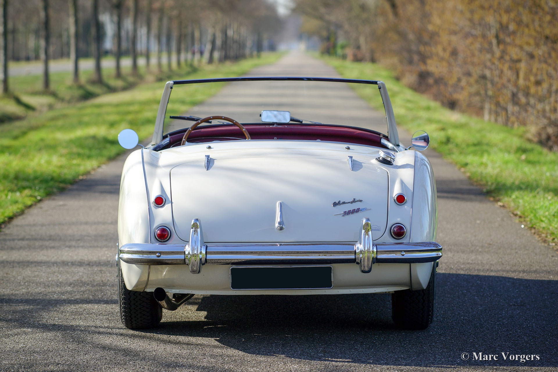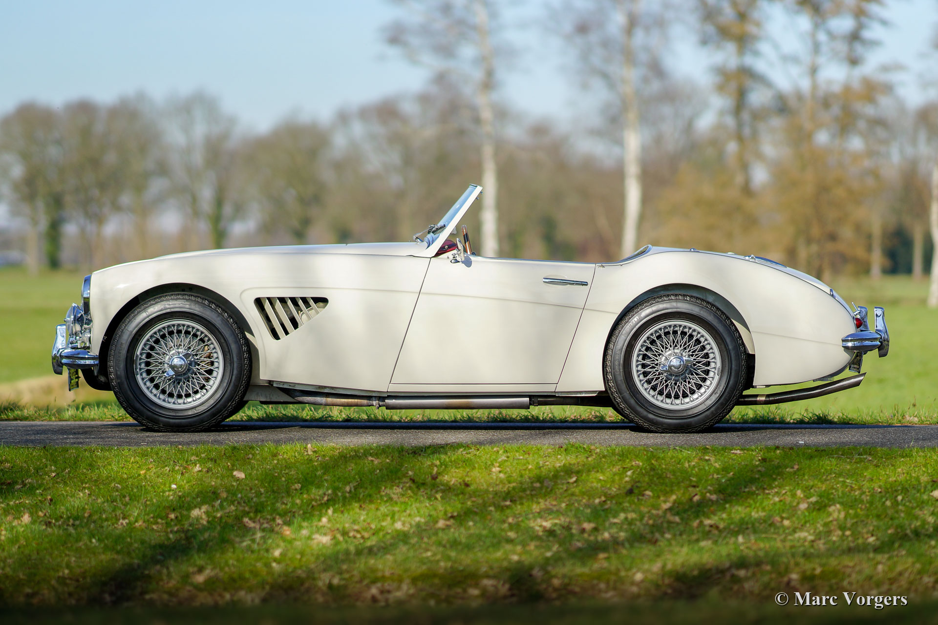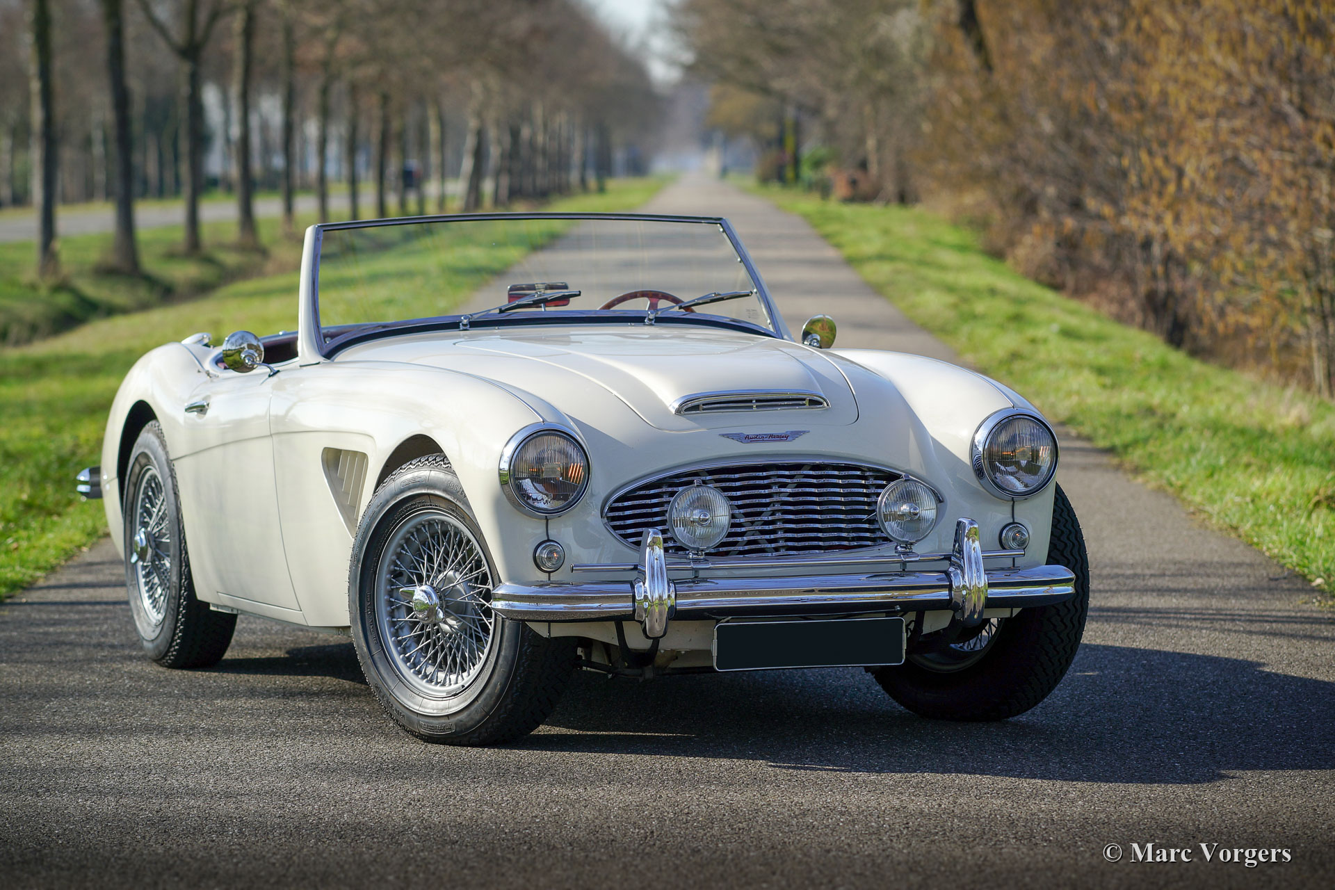 Austin Healey 3000 Mk I (BN7) Zweisitzer, Jahr 1960. Farbe crème weiß (Old English White) mit einem roten Leder Interieur mit weißen Paspeln getrimmt. Roter Teppich und schwarze Gummi-Schutzmatten. Schwarze Vinyl-Soft-Top- und Aluminium-Seitenfenster. Dies ist eine seltene und begehrte Austin Healey 3000 Mk I (BN7) Zweisitzer, nur 2825 Autos dieses Typs wurden gebaut. Diese wunderschöne 'Big Healey' wurde im Jahr 1997 aus den USA in die Niederlande Importiert. In den Niederlanden wurde das Auto ausgiebig und wunderschön restauriert. Dieser Austin Healey ist in einem hervorragenden Zustand und das Auto fährt perfekt! Das Auto verfügt über silberfarbene Drahträder mit 72 Speichen, Chrom ‘Knock-off‘ Radmuttern, Soft-Top, Aluminium-Seitenfenster in braunen Tuchtaschen, wunderschönen extra Belüftungsöffnungen in den vorderen Kotflügeln, einem ‘badge-bar‘ und Nebelscheinwerfer am Front.