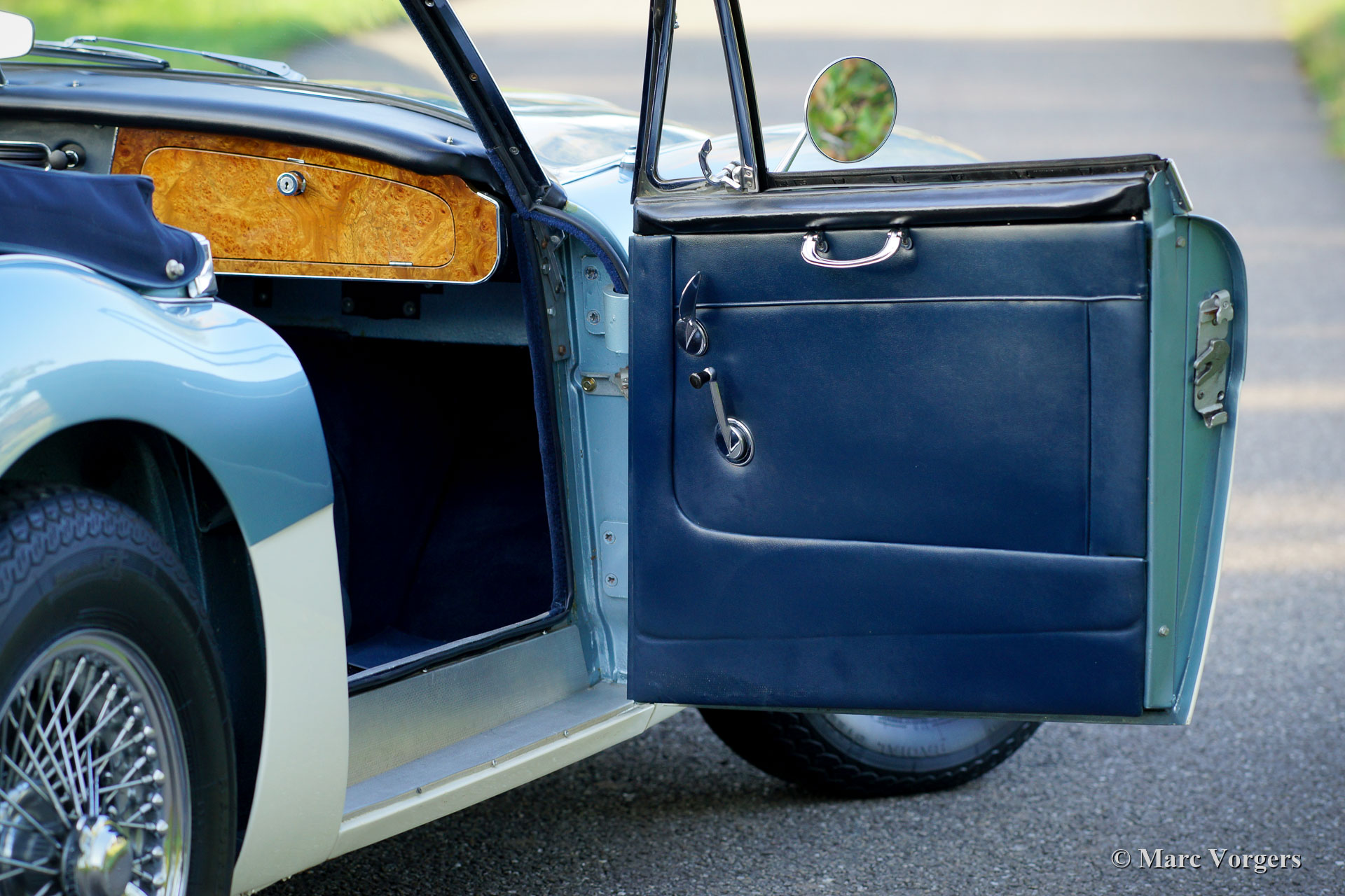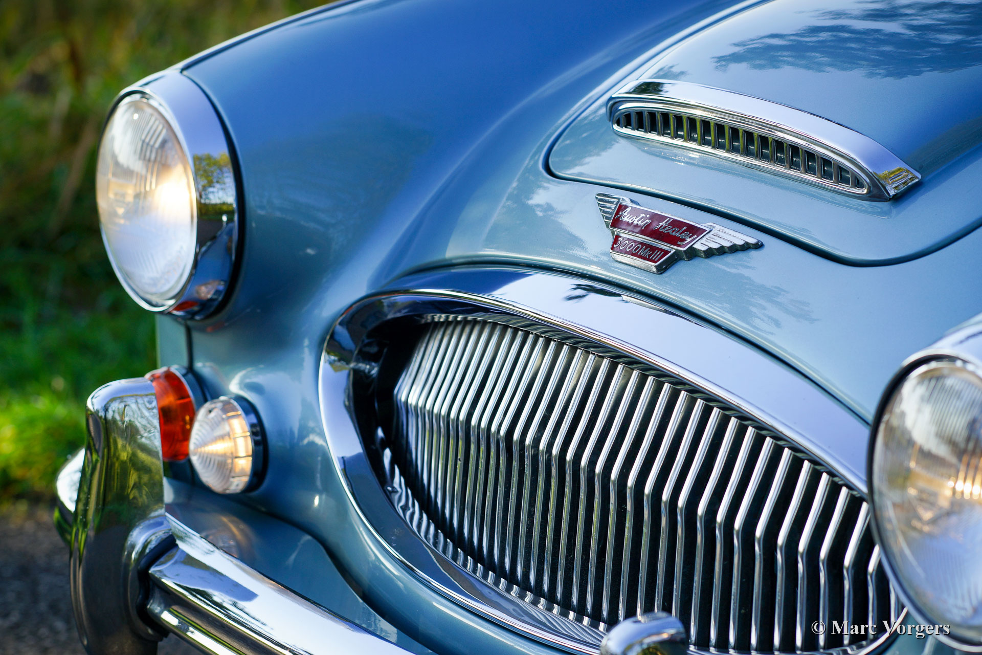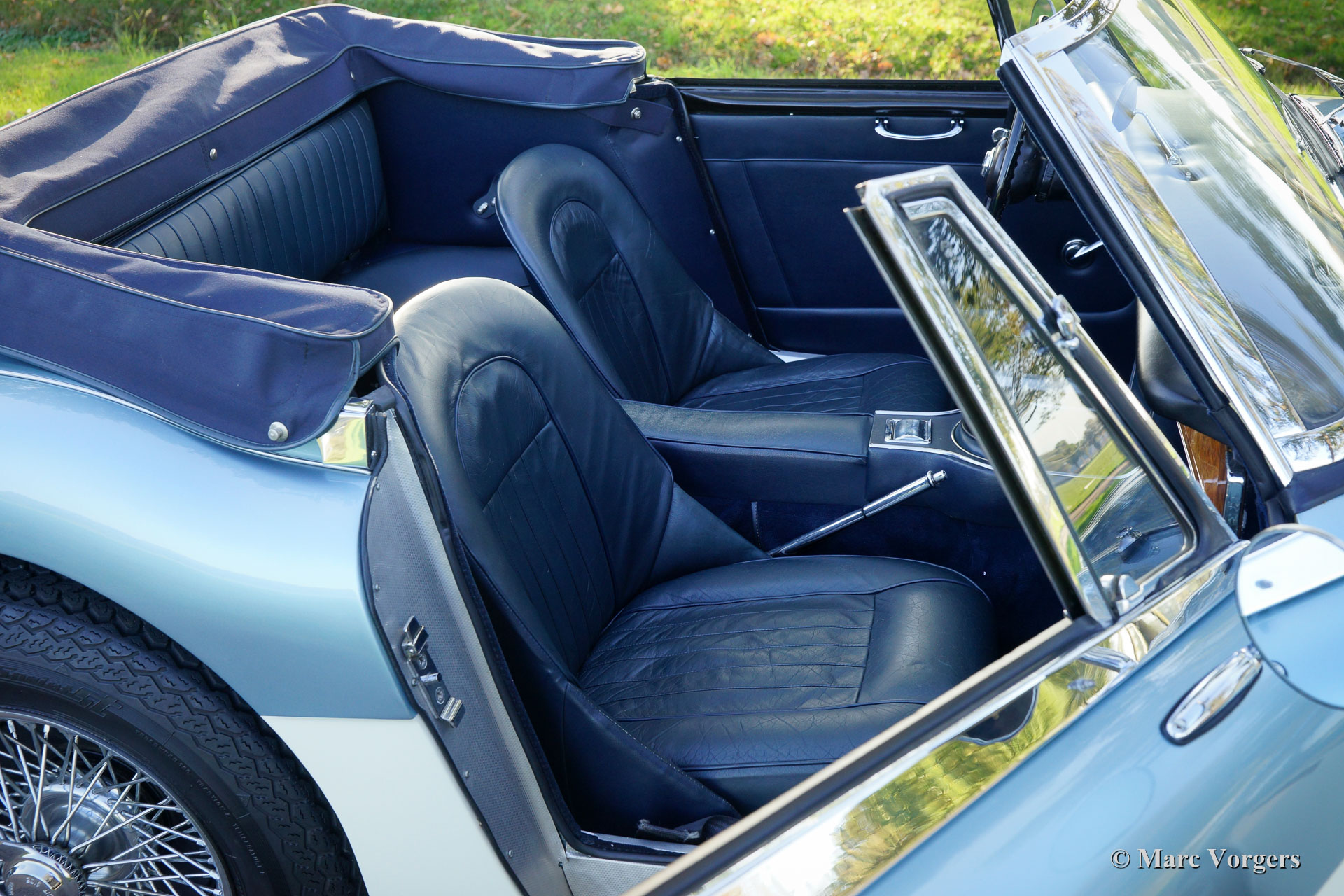 Austin Healey 3000 Mk III Phase 2, Jahr 1967. Fahrgestellnummer HBJ8L3356XX, Motornummer 29K / RU / H126XX. Farbe Ice Blue metallic über cremeweiß kombiniert mit einem dunkelblauen Lederausstattung und dunkelblauem Teppich. Dunkelblaues Mohair-Verdeck und Kapuzenbezug. Dieses fabelhafte "Big Healey" wurde in den USA neu verkauft. Das Auto wurde im Jahr 1989 in die Niederlande verschifft. Von 1989 bis 2000 wurde das Auto genossen in seinem ursprünglichen Zustand. Im Jahr 2000 wurde der Healey umfassend restauriert und überholt. Fotos der Restaurierung sind vorhanden. Natürlich wurden der Motor und das Getriebe sowie die Armaturenbrettanzeigen und alle mechanischen Teile überholt. Der Innenraum wurde erneuert und der Kabelbaum wurde erneuert. Seit Abschluss der Restaurierung wurde das Automobil sehr wenig genutzt. Das Auto wurde über die Jahre perfekt in der Garage geparkt und gewartet. Dieser feine Austin Healey ist in einem sehr guten bis hervorragenden Zustand und das Auto fährt herrlich! Das Auto zeigt alle Originaldetails und es verfügt über Chromspeichenräder und Sicherheitsgurte. Ein fantastisches und begehrenswertes Beispiel in der begehrtesten Farbkombination!