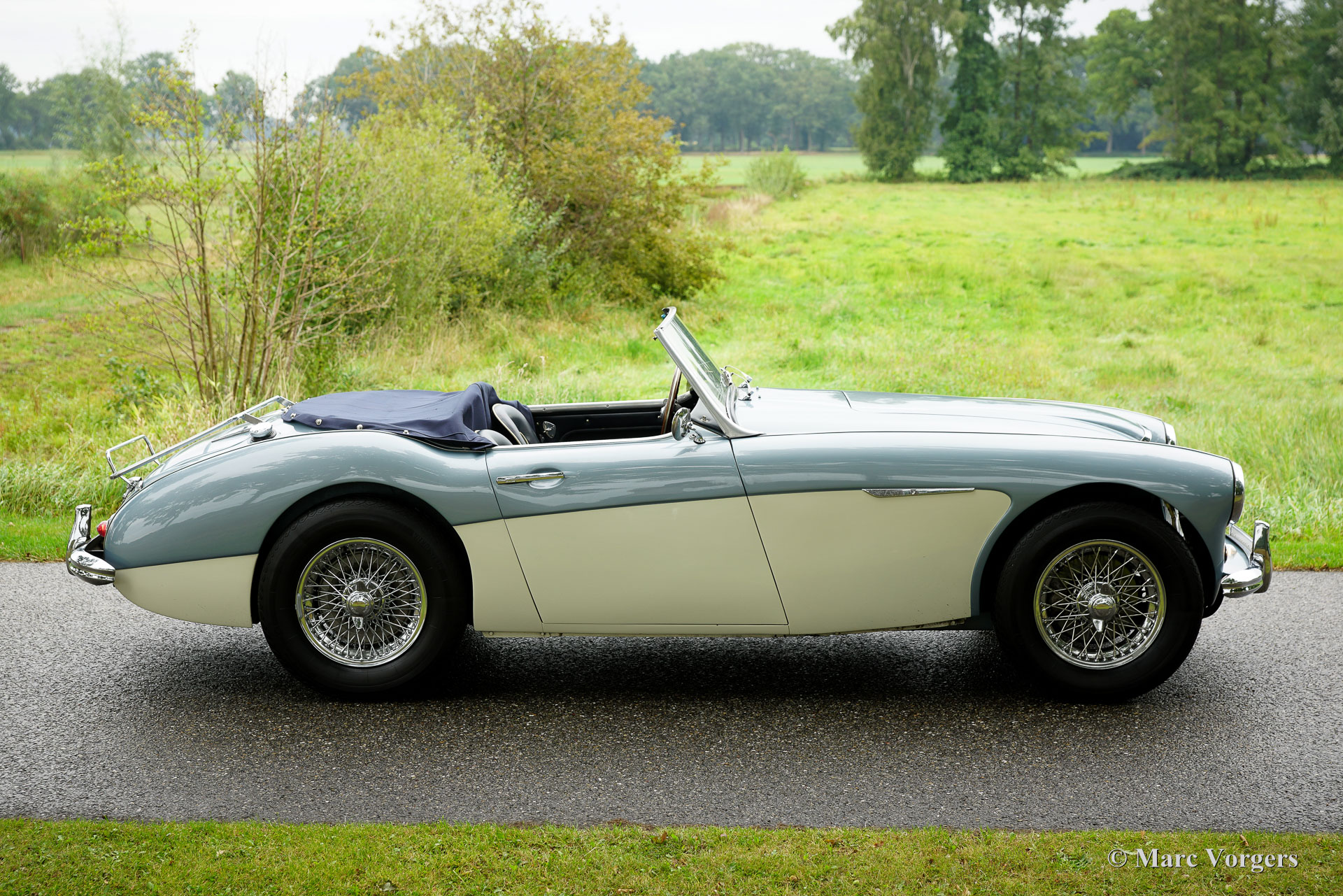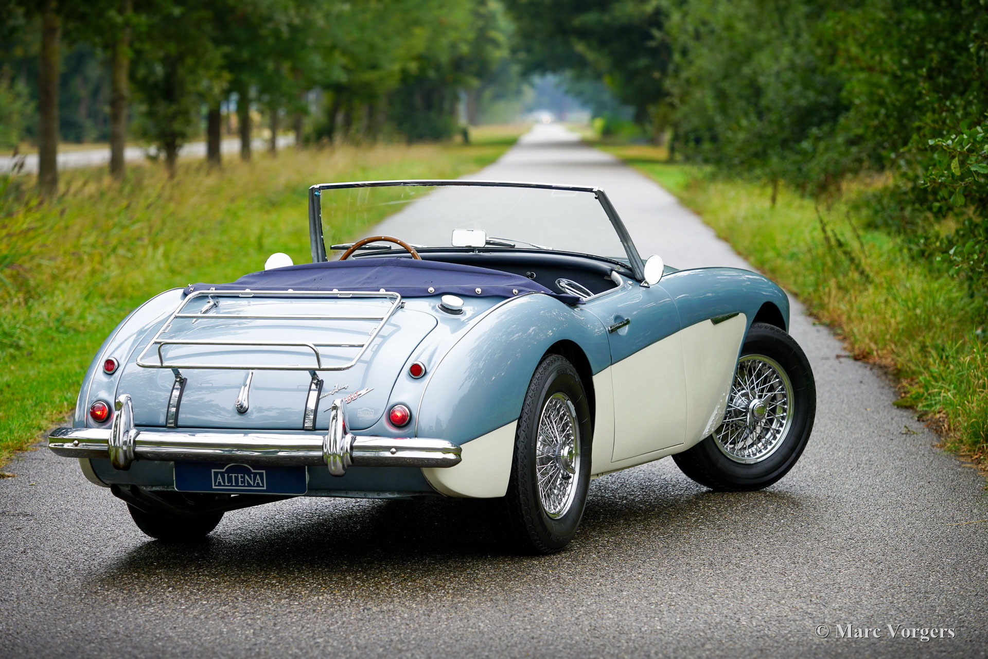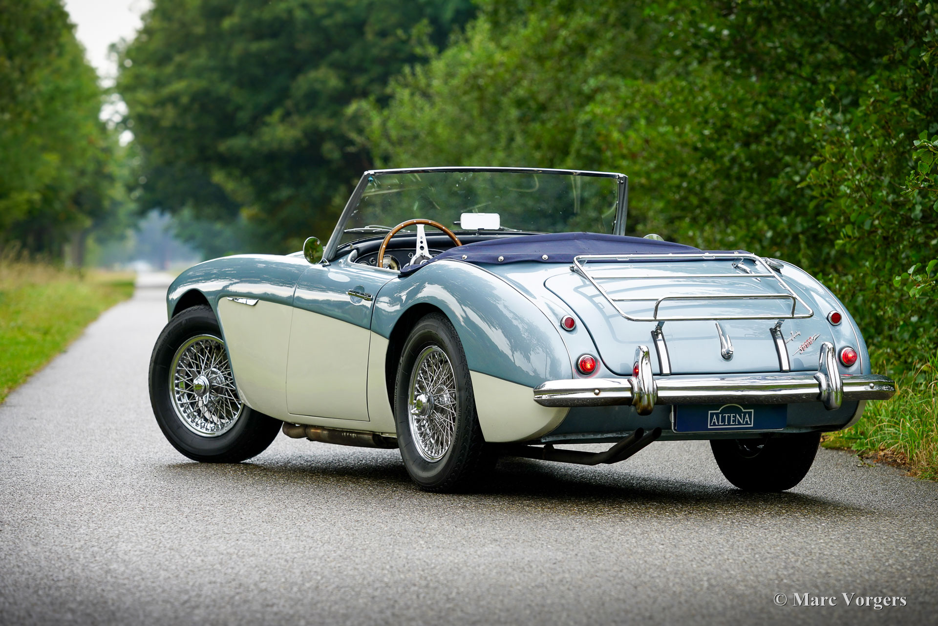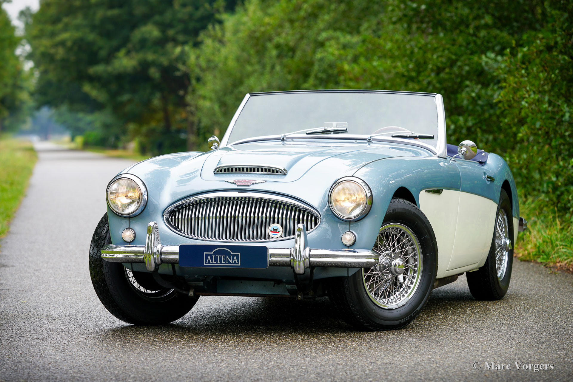 Austin Healey 3000 MK II, Jahr 1961. Fahrgestellnummer HBT7L15775, Motornummer 29E/RU/H1991. Dies ist ein seltenes Austin Healey 3000 Mk II 3-Vergaser-Modell, von dem nur 5096 Exemplare gebaut wurden. Die Karosserie ist in Eisblau-Metallic über cremeweiß gehalten, kombiniert mit einer blauen Innenausstattung mit blauen Ledersitzen mit weißen Paspeln, einem blauen Armaturenbrett und Türverkleidungen aus Kunstleder sowie einem blauen Teppich. Das blaue Stoffverdeck und die Persenning sind aus blauem Mohair, und ein Paar Aluminium-Seitenscheiben mit Plexiglasfenstern vervollständigen die Wetterausrüstung. Dieser wunderschöne „Big Healey“ wurde neu in den USA verkauft und das Auto wurde 2005 von Louisiana in die Niederlande verschifft. In den Jahren 2005 bis 2007 wurde das Auto umfassend und bis zur Perfektion restauriert. Ein Restaurierungslogbuch und ein Fotobericht sind vorhanden. Die Restaurierung wurde von drei renommierten Spezialisten durchgeführt: Der Motor wurde von der Firma van Giersbergen überholt, die Karosserie von der Firma van Emst restauriert. Die übrigen mechanischen Komponenten wurden von Altena Classic Service überholt und restauriert. Wir haben dem Besitzer bei der Fertigstellung dieses herrlichen Austin Healey geholfen. Nachdem er das Auto zwanzig Jahre lang sehr genossen hatte, bat er uns, ein gutes neues Zuhause dafür zu finden. Das Auto weist leichte Gebrauchsspuren auf und ist in einem sehr guten Zustand! Der Motor klingt und läuft wunderbar, und das Auto fährt perfekt. Der Healey ist ausgestattet mit Chromspeichenrädern mit Vredestein Sprint Classic-Reifen, verchromten „Knock-on“-Radmuttern, einem Chromgepäckträger, zwei verchromten, an den Türen montierten Rückspiegeln, einem MotoLita-Lenkrad mit Holzkranz, Scheibenbremsen vorne und einem Edelstahlauspuff. Dies ist ein großartiger „Big Healey“ in einem sehr guten, restaurierten Zustand und in den beliebtesten Farben. Ein fantastischer Oldtimer, der Ihnen großartige Momente intensiven Fahrspaßes mit offenem Verdeck bescheren wird!